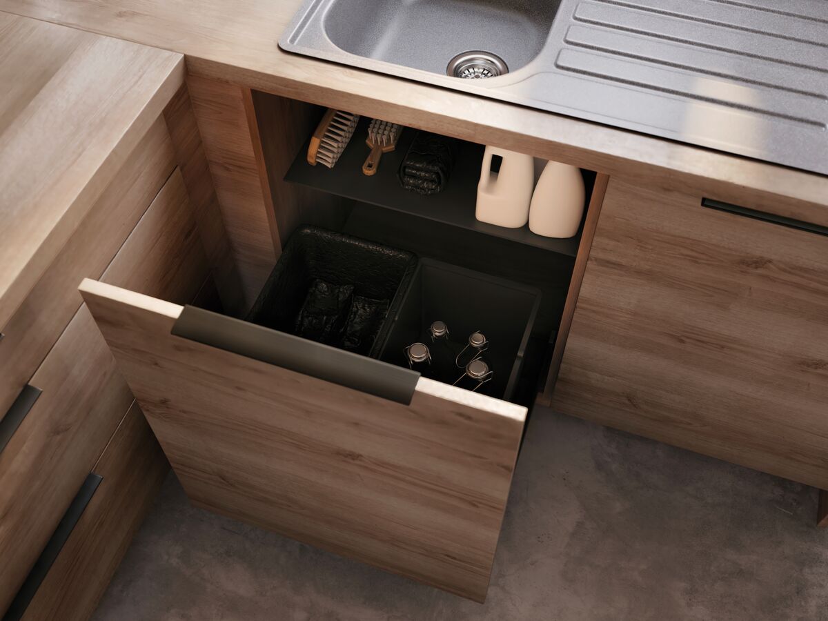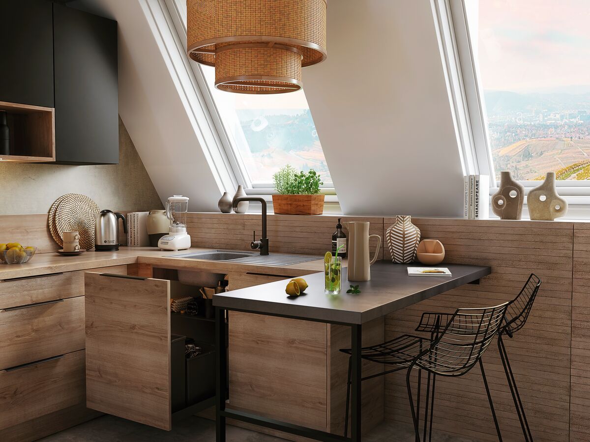 Emma und Felix wünschten sich eine offene Küche, die sich harmonisch unter die Schräge in ihrem Haus wenige Kilometer von Stuttgart entfernt einfügen sollte. Bei diesem Design-Modell, das die Natürlichkeit von heller Eiche mit warmem Anthrazitgrau kombiniert, war es für das Paar Liebe auf den ersten Blick. Das Endergebnis trifft voll ins Schwarze! Ihre Küche ist nicht nur ästhetisch, sondern auch sehr praktisch, da sie mit mehreren niedrigen, breiten Schiebeelementen ausgestattet ist. Besonders gut gefällt ihnen, dass sie beim Spülen aus dem Fenster in die Natur schauen können!