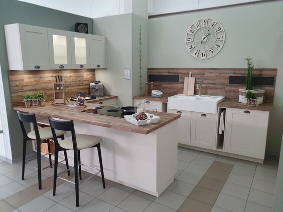 Bevorzugen Sie hingegen eine Küche mit ländlichem Charme in verspieltem Design, ist der angesagte Landhausstil eine gute Wahl. Charakteristisches Hauptmaterial ist naturbelassenes Holz. Farblich sind Küchen dieser Optik in Blau, Grün und Beige gehalten. Eine Küche im Landhausstil vermittelt Geborgenheit und Behaglichkeit – Ihre Küche verwandelt sich so in einen Wohlfühlort für die gesamte Familie.