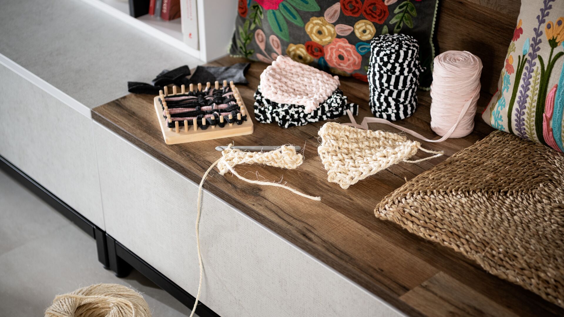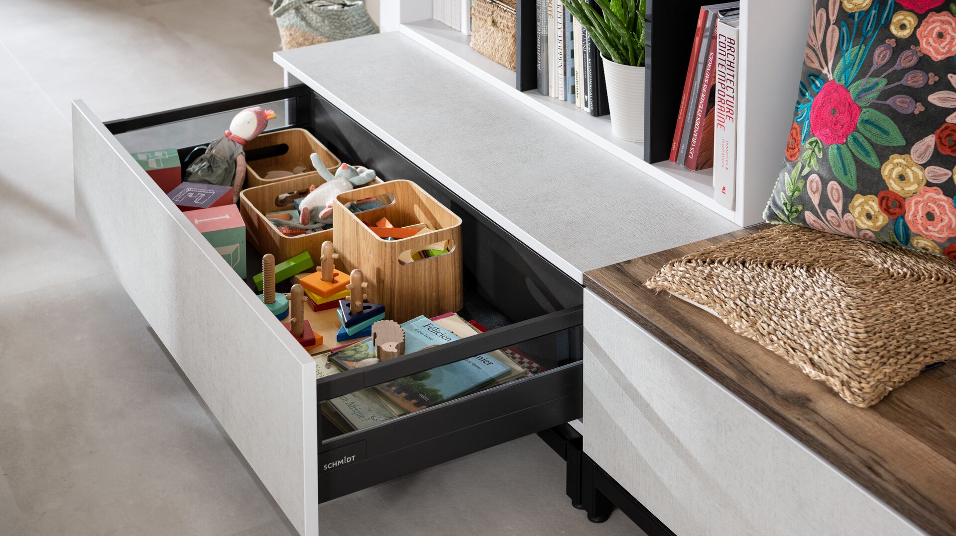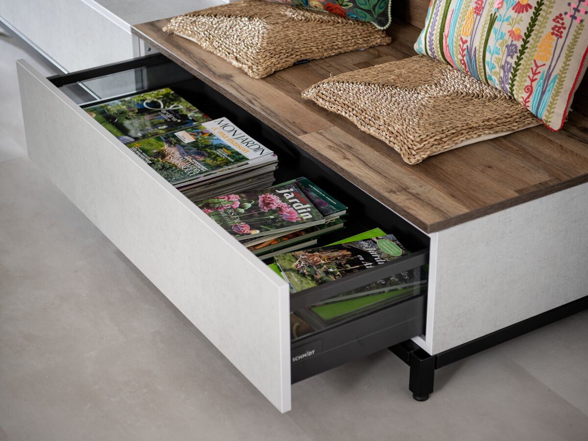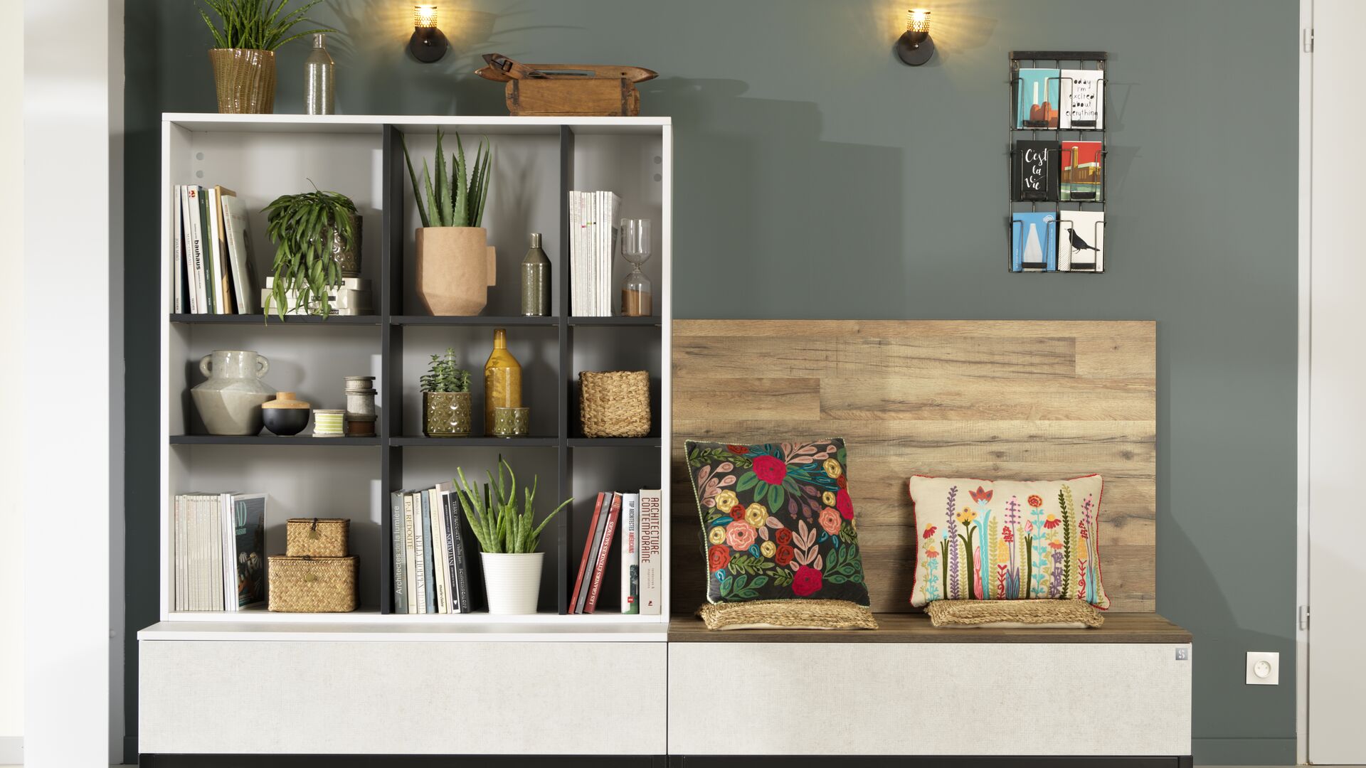 Für ihr Wohnzimmer waren Marie und David auf der Suche nach einem ebenso stilvollen wie funktionalen Möbelstück. Mit dieser Bücherbank ist es ihnen gelungen, ihre Leidenschaft fürs Lesen und ihren Bedarf an zusätzlichen Sitzmöglichkeiten zu decken, damit die ganze Familie gemütlich im Wohnzimmer zusammensitzen kann. Mit ein paar bequemen Kissen kann die Bank von dem Paar und seinen drei Kindern zudem für improvisierte Abendessen am niedrigen Tisch genutzt werden. Auch um ihre Nachbarn aus dem Öko-Viertel zu empfangen, in dem sie sich nun schon seit mehreren Jahren engagieren, ist sie ideal.