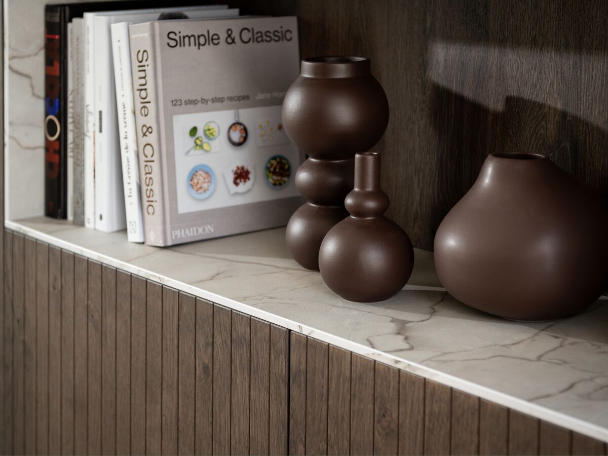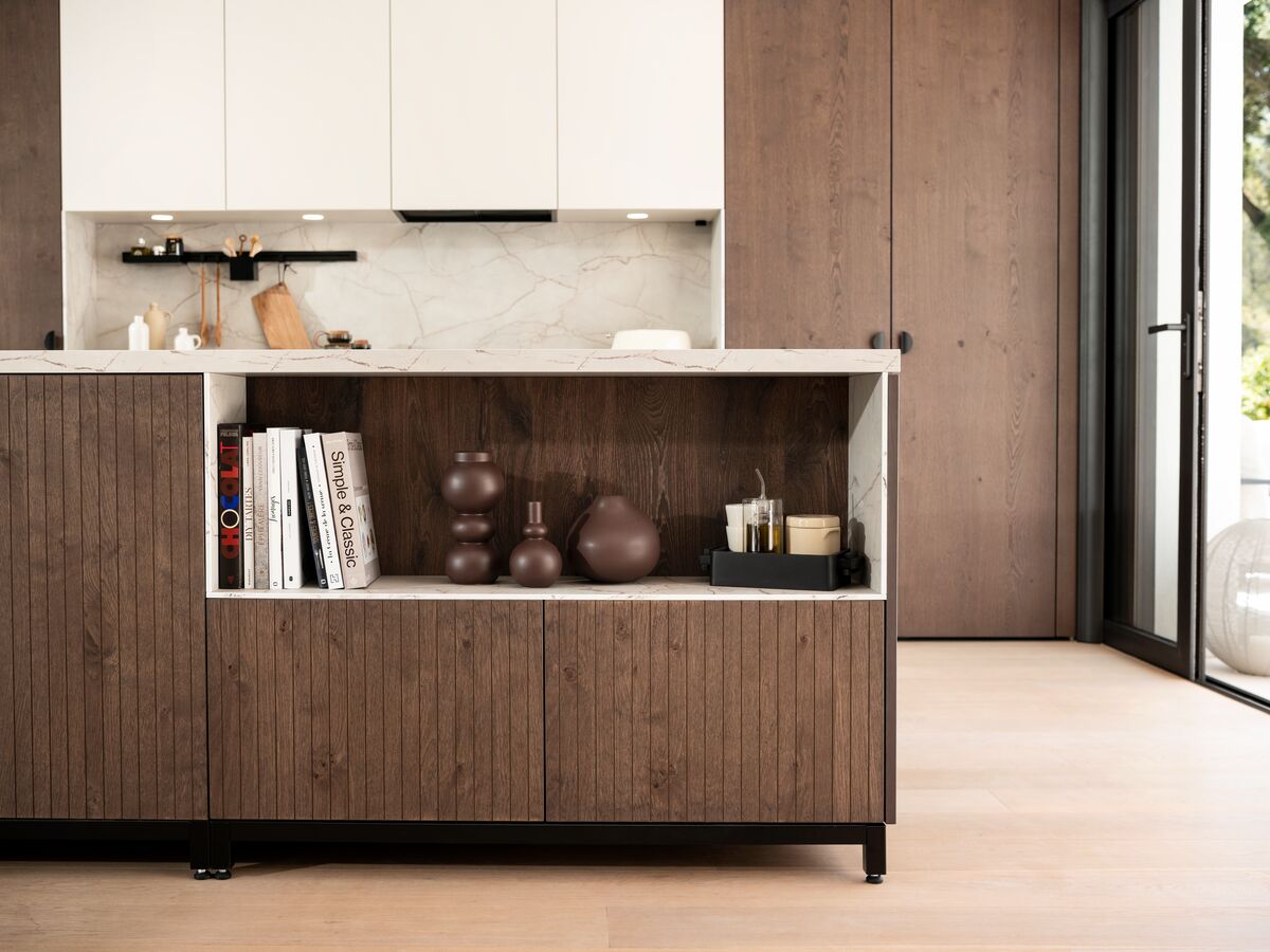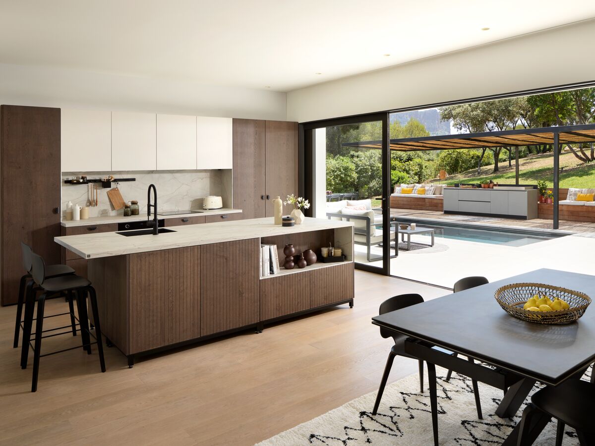 La combinación sutil y elegante de la madera «Amber oak» y de la encimera «Yule» realzada por unos toques de negro intenso y gráfico sedujo a esta pareja entrada en los cincuenta. En busca de una cocina abierta al salón, funcional y estética, el modelo Bosca Epicerie, que respondía perfectamente a sus necesidades, les conquistó inmediatamente. En familia y entre amigos, disfrutan reuniéndose alrededor de la isla central, que se ha convertido en uno de los lugares más acogedores de su casa.