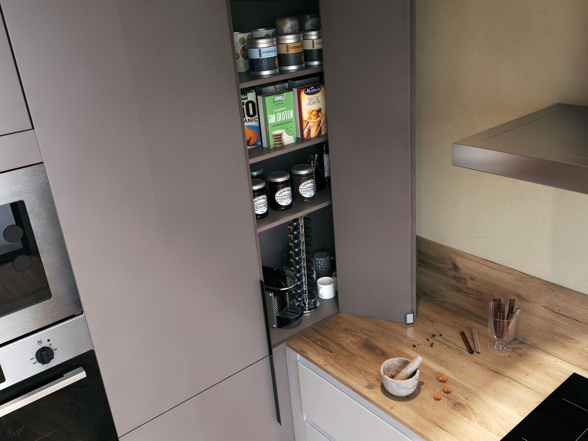 Para destacar su cocina, Blanca y Julio se enamoraron literalmente de este modelo con tirador integrado que fusiona armoniosamente el efecto de la madera con los colores blanco y champán. Una opción que encaja perfectamente en la estancia ubicada justo debajo de su entreplanta de diseño. Julio, un apasionado de la cocina, quedó totalmente seducido por el compartimento dedicado a las especias, mientras que a Blanca le gustó especialmente el mueble con puerta plegable para guardar los accesorios del desayuno. Esta moderna cocina, además de práctica, exhibe acabados naturales que convencieron totalmente a esta pareja con un hijo que deseaba sobre todo preservar la luminosidad de su espacio vital abierto al salón.