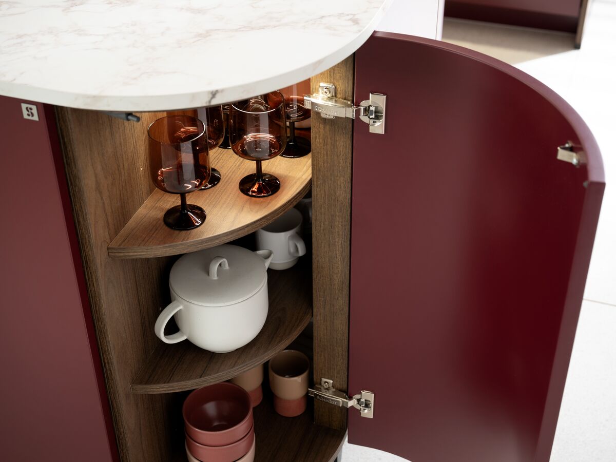 Cocina violeta con bordes redondeados abierta a la sala de estar