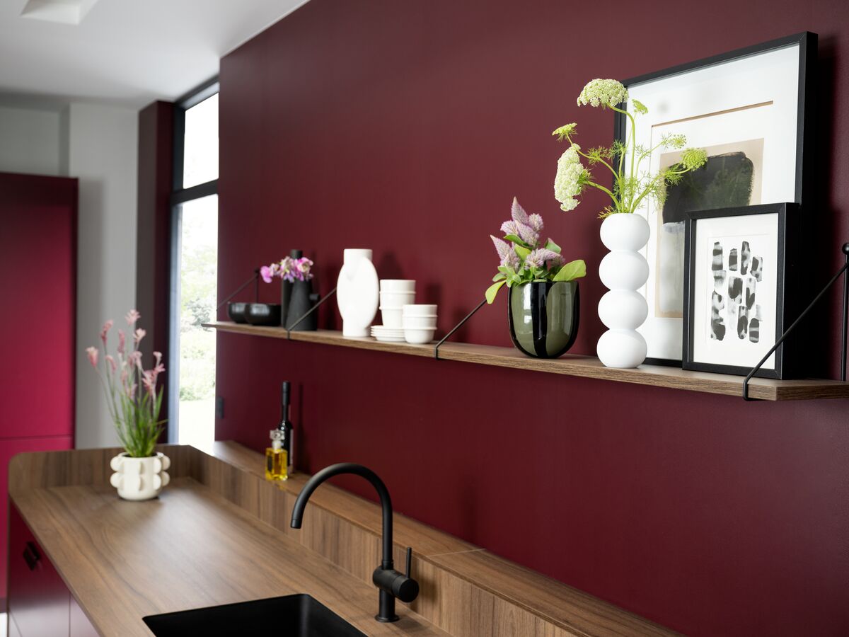 fusionarse con las paredes. Esta cocina de color ciruela destaca por sus líneas