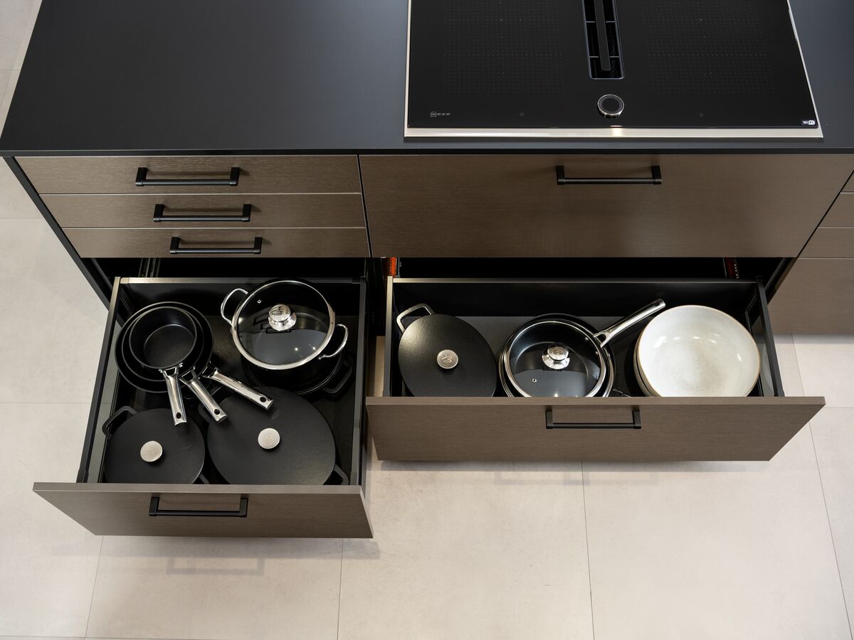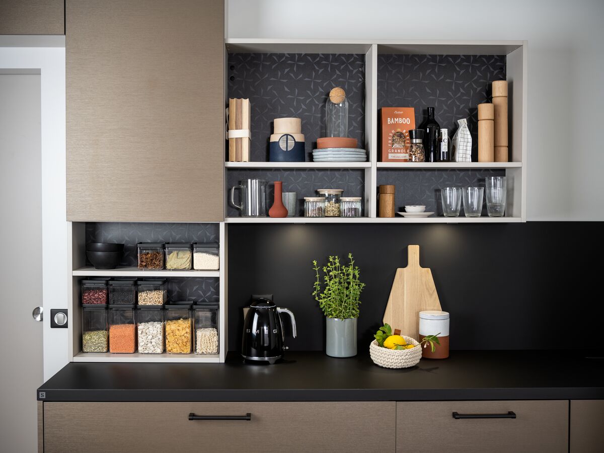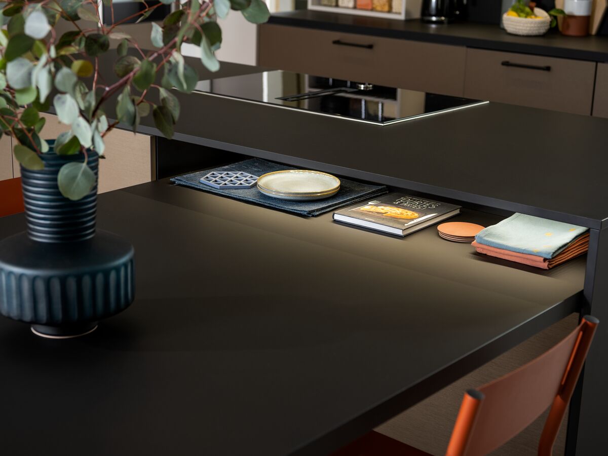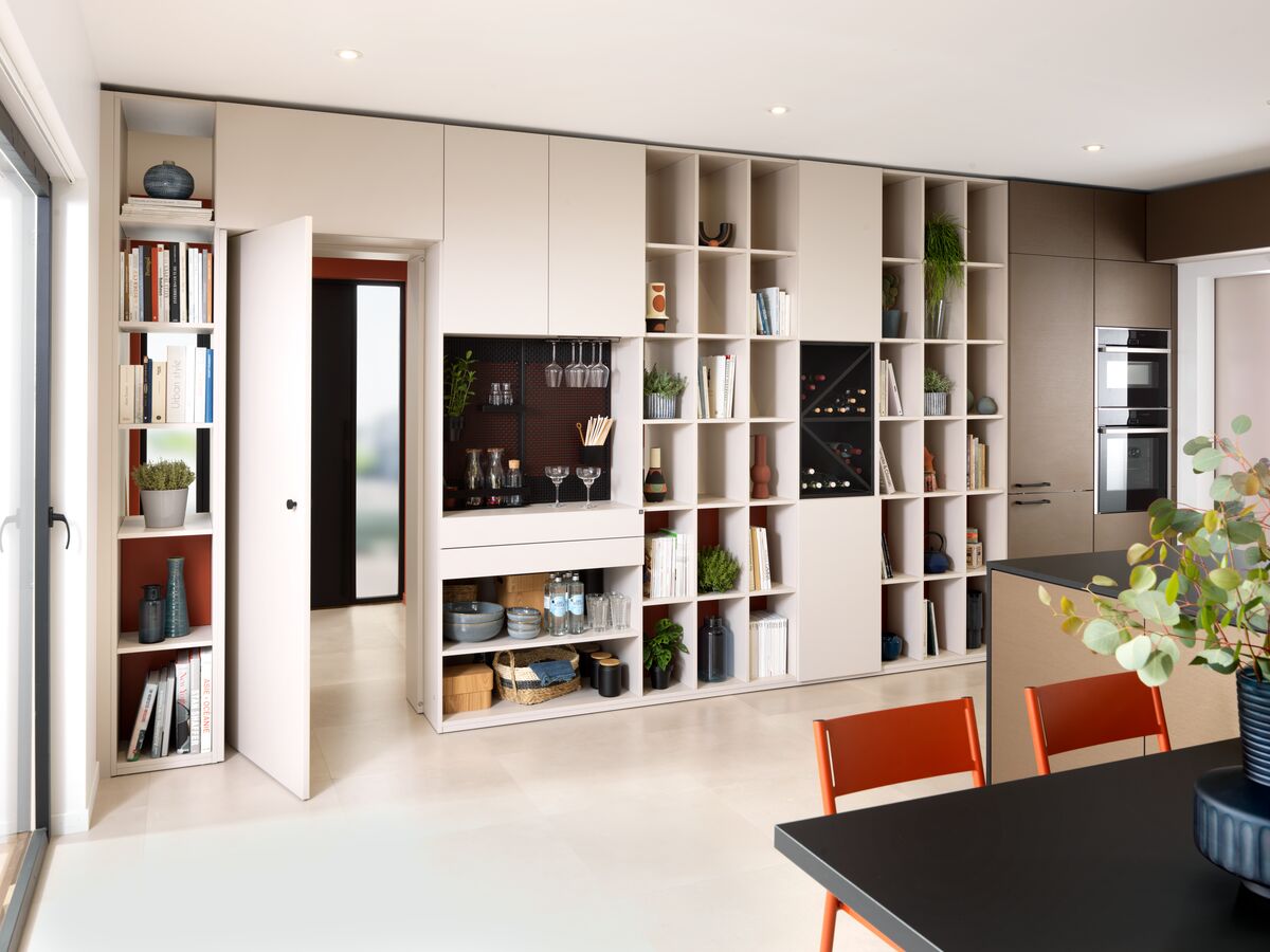 Con el deseo de preservar al máximo el volumen existente sin tener que construir tabiques, la modularidad de esta cocina sedujo especialmente a esta pareja entrada en los cuarenta. Con un tabique funcional que crea una separación con un auténtico paso de puerta entre la entrada y la gran sala de estar, este modelo permitía a los padres responder a varios de sus criterios: diferenciar los espacios, disponer de una gran capacidad de almacenaje y disfrutar de un diseño especialmente logrado… Aprovechando la altura, la cocina imaginada por Schmidt tenía todas las bazas para ofrecer a sus dos hijos unos bonitos momentos para compartir en familia.