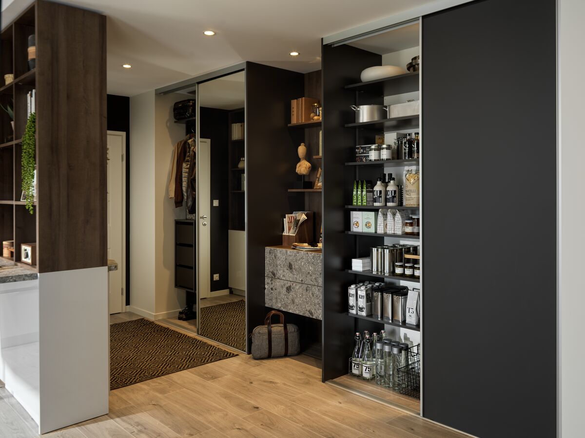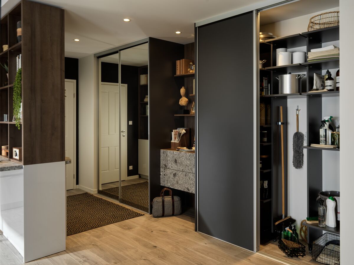 Este vestidor de recibidor - bodega es de lo más ergonómico y funcional. A un lado, un espacio pensado para la ropa detrás de las dos puertas espejo correderas. En el otro, junto a la cocina, una bodega camuflada detrás de las puertas de color negro mate Caneo añade una zona de almacenaje adicional para guardar alimentos y todo lo que utilizas a diario.