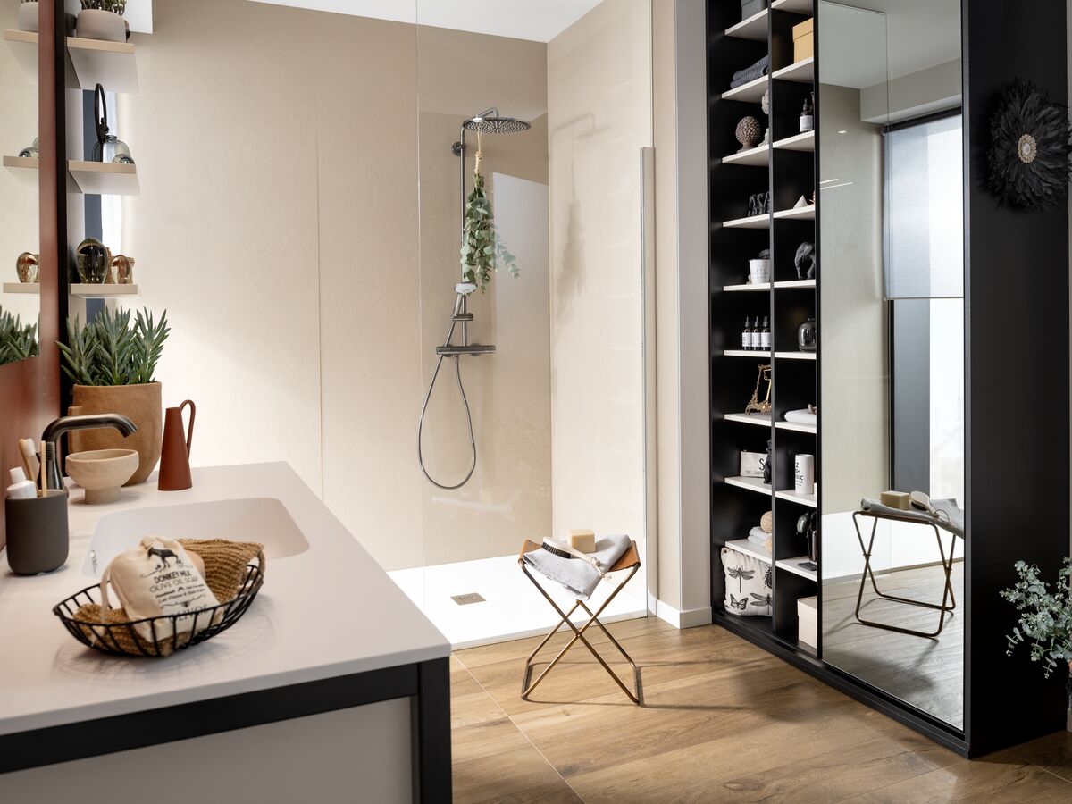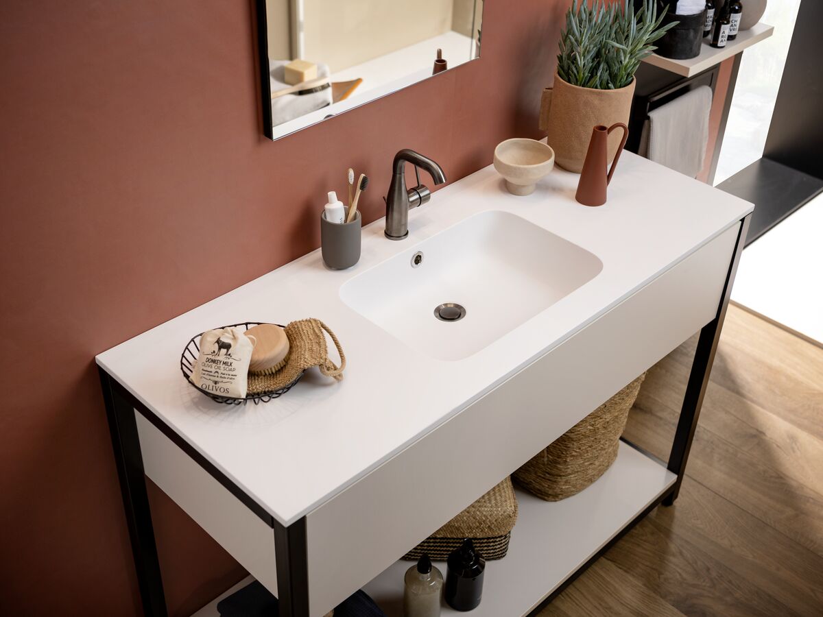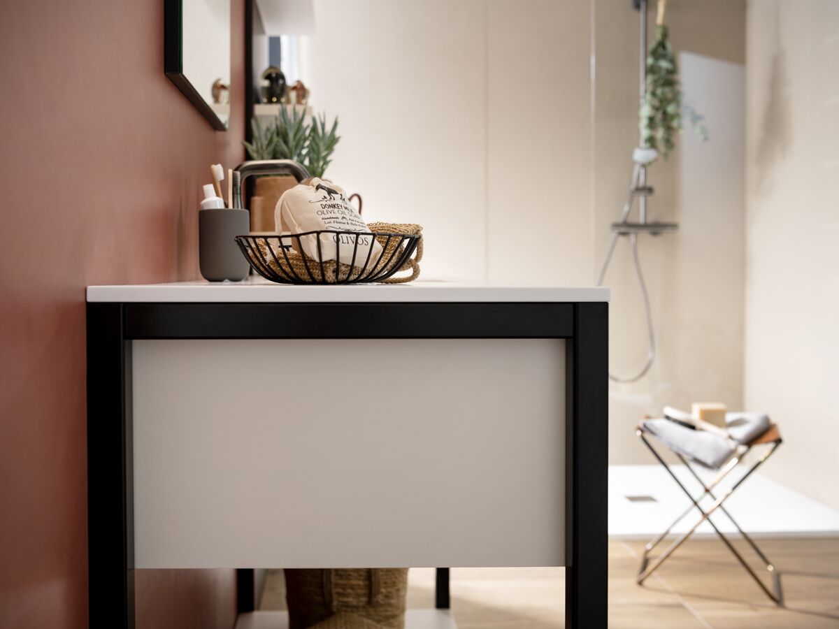 Para convertir su antiguo taller de la ciudad en un loft con estilo, esta pareja buscaba un cuarto de baño que estuviera a la altura de sus gustos claramente definidos. En este modelo de estilo industrial, encontraron la propuesta que encajaba perfectamente con la decoración interior de su hogar. ¿Qué los sedujo? El gran mueble bajo el lavabo, con su logrado diseño industrial y su marco de metal negro. Y terminó de convencerlos el gran armario... ¡Hay que reconocer que, con dos niños, tener espacio para organizarse es indispensable!