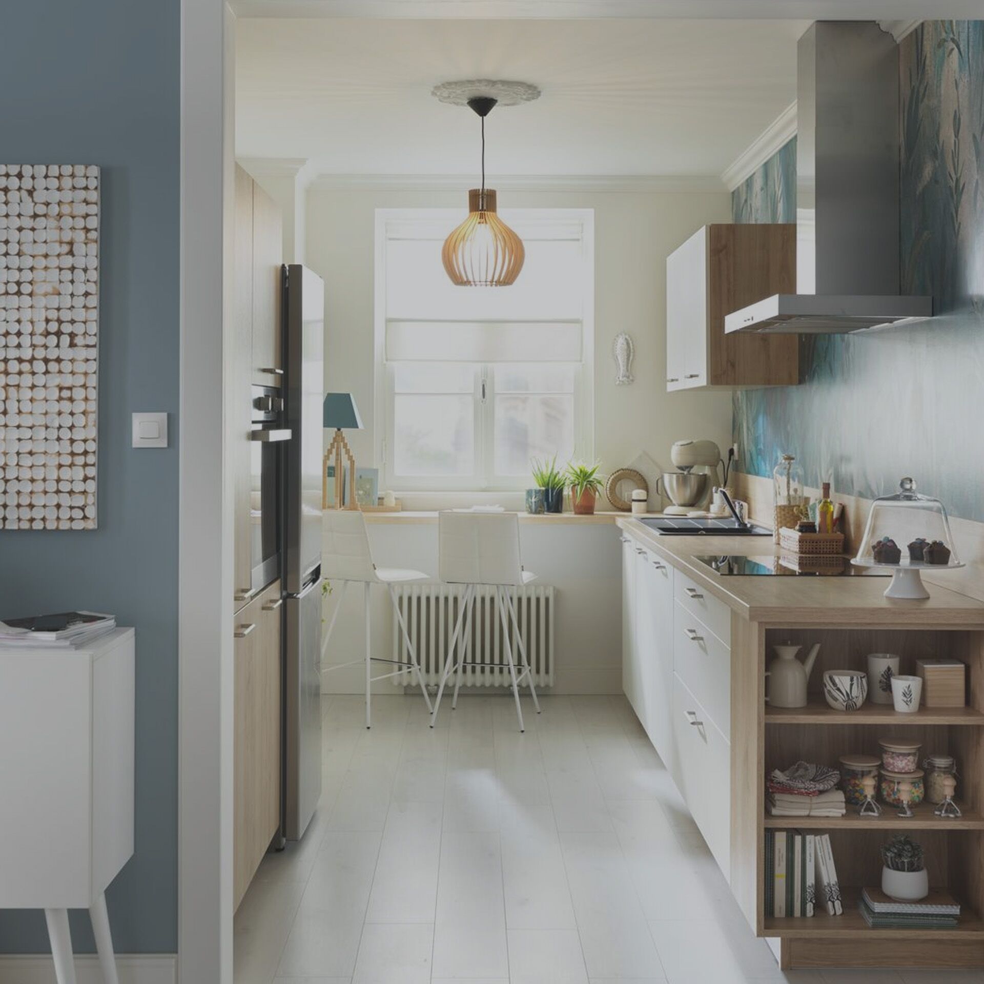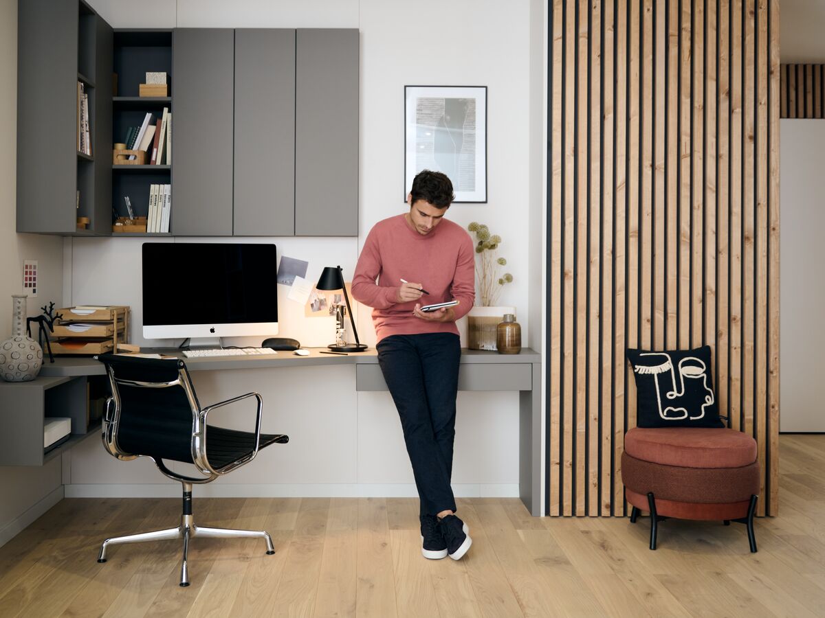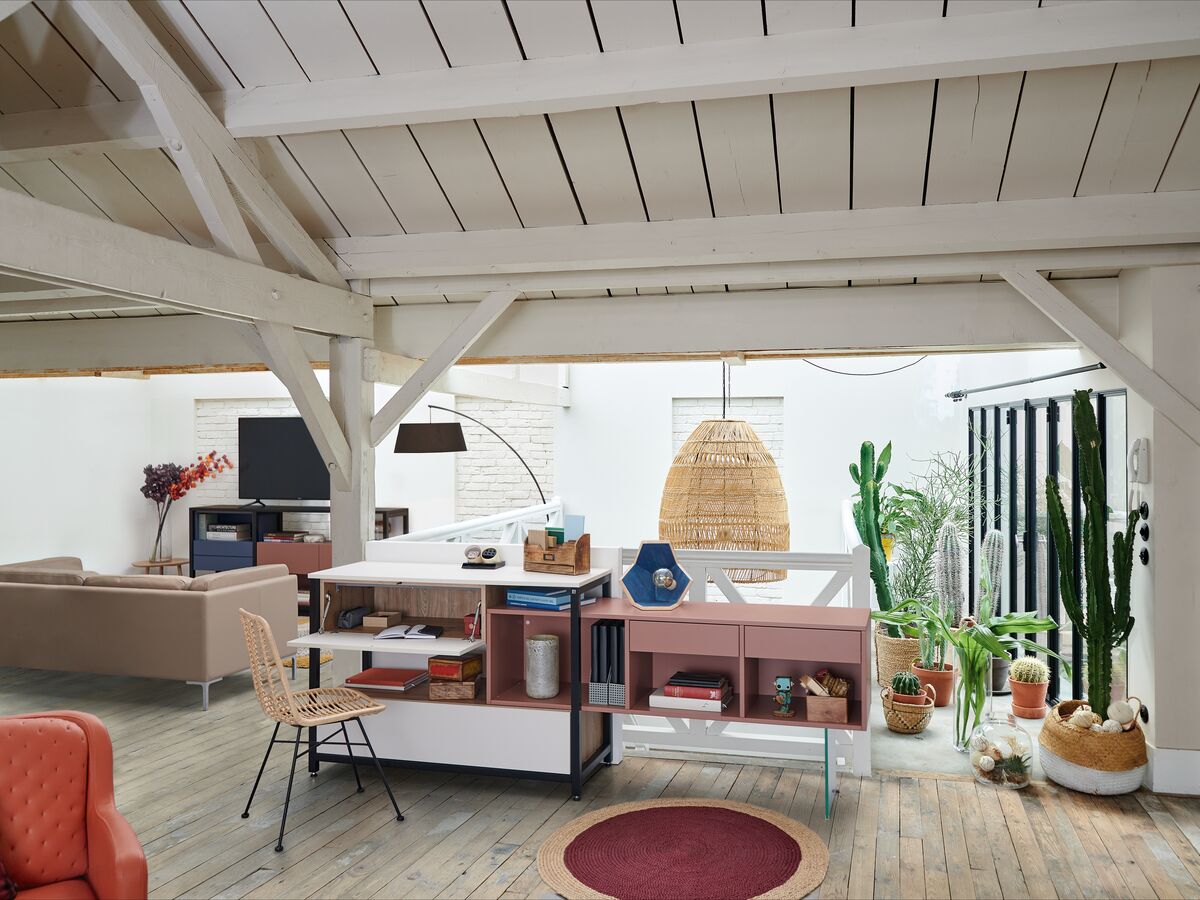 Dans cette belle pièce ouverte, nous avons composé un espace cuisine et un coin bureau grâce à un aménagement monobloc, assorti de multiples rangements. Pour délimiter, sans enfermer, et pour une ambiance originale, nous avons opté pour le décor print Botanic Black, comme une parenthèse de nature dans un univers très urbain.