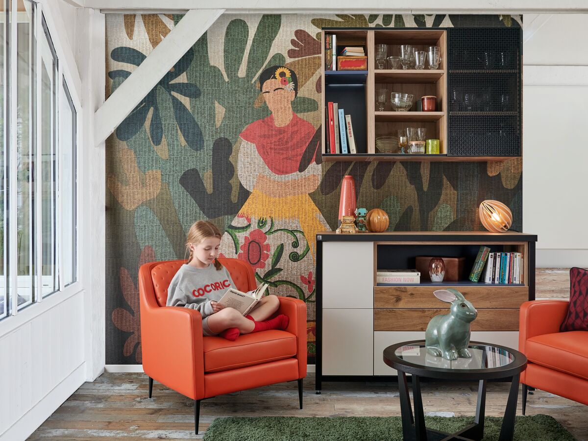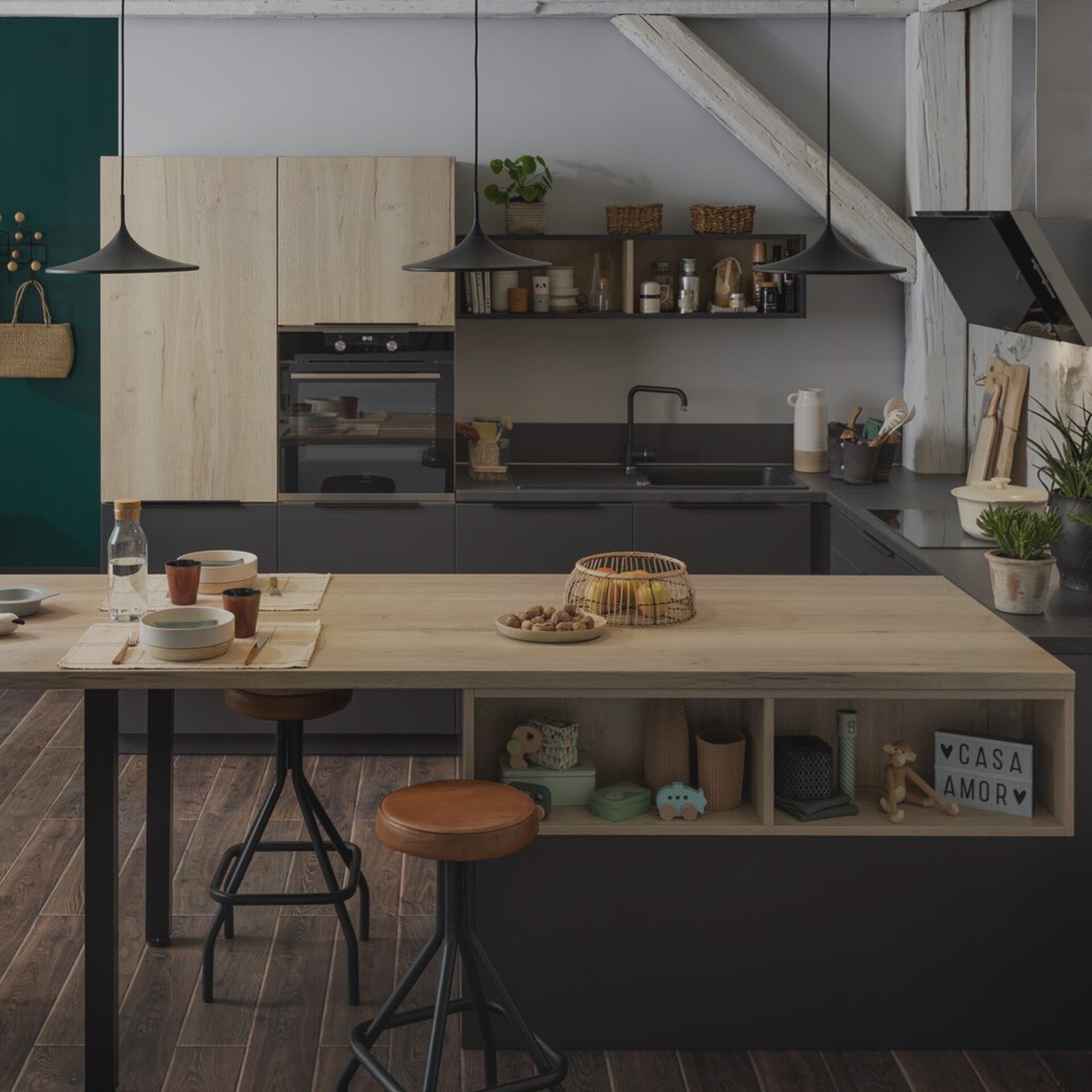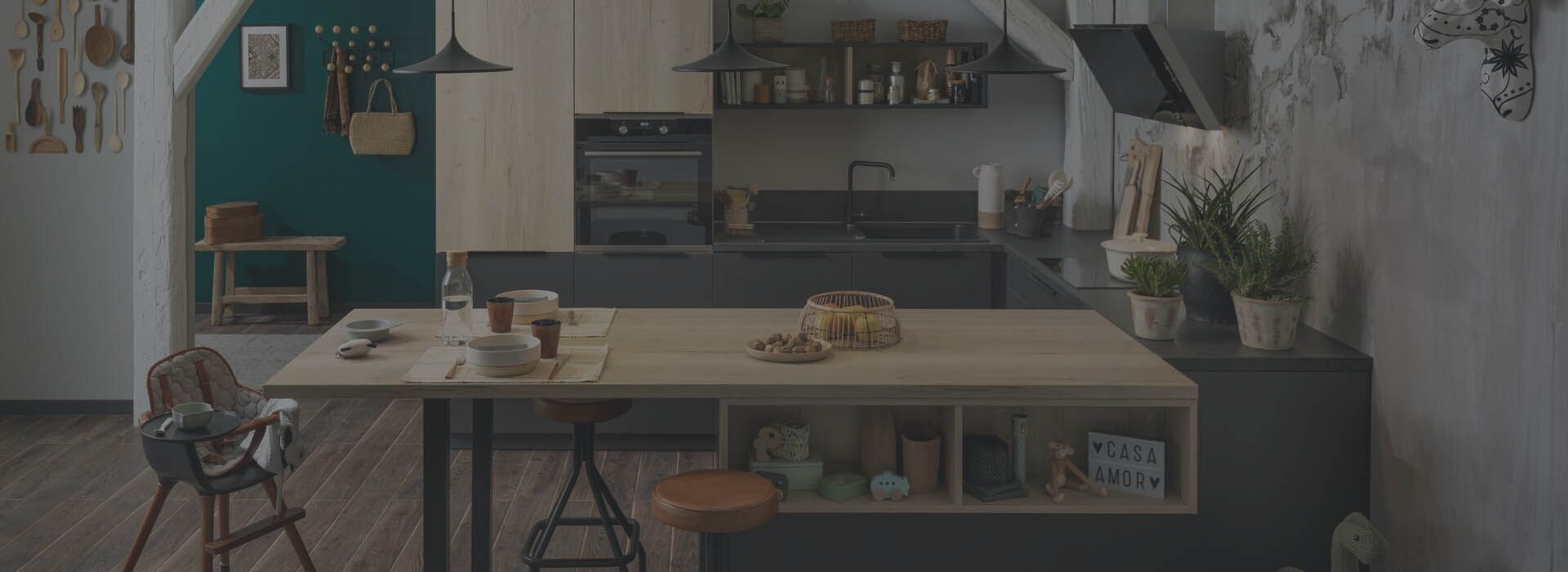 Dans cette belle pièce ouverte, nous avons composé un espace cuisine et un coin bureau grâce à un aménagement monobloc, assorti de multiples rangements. Pour délimiter, sans enfermer, et pour une ambiance originale, nous avons opté pour le décor print Botanic Black, comme une parenthèse de nature dans un univers très urbain.