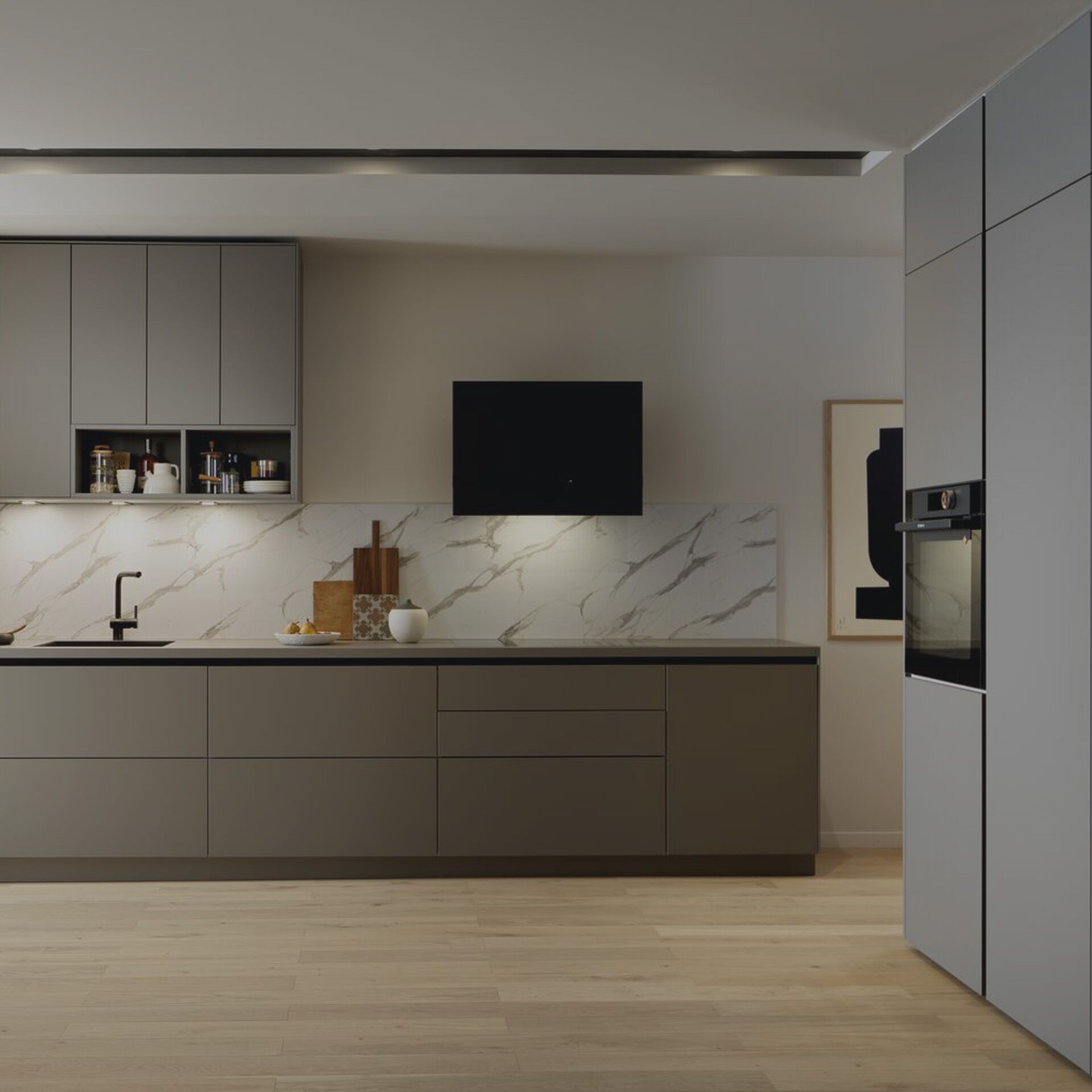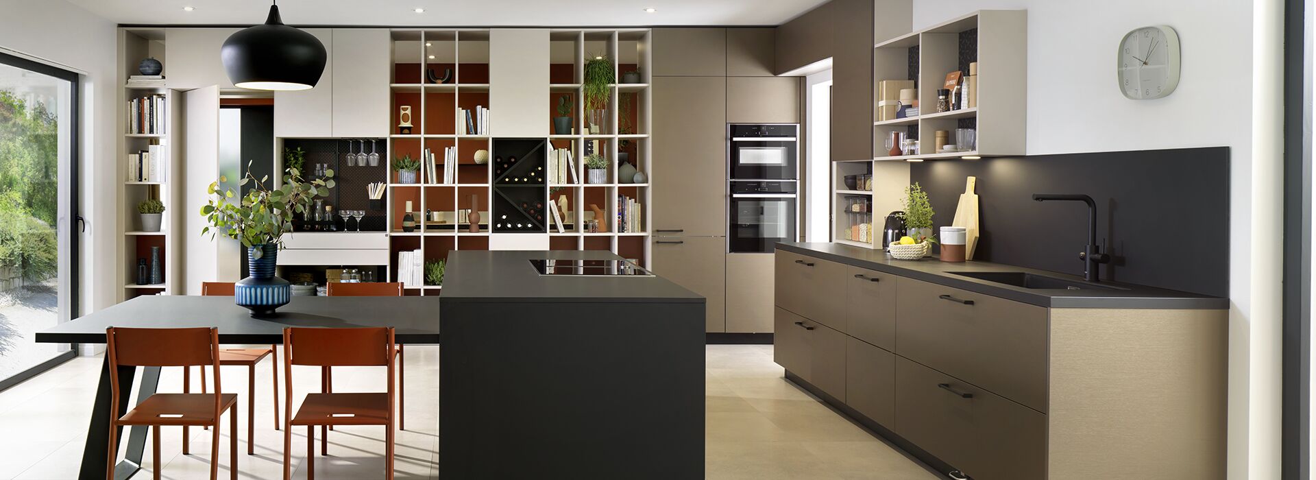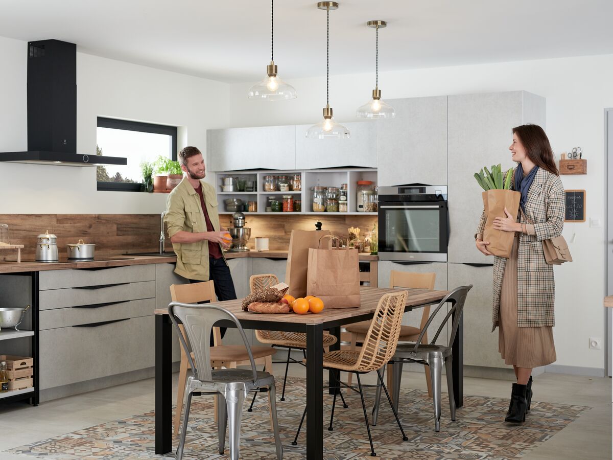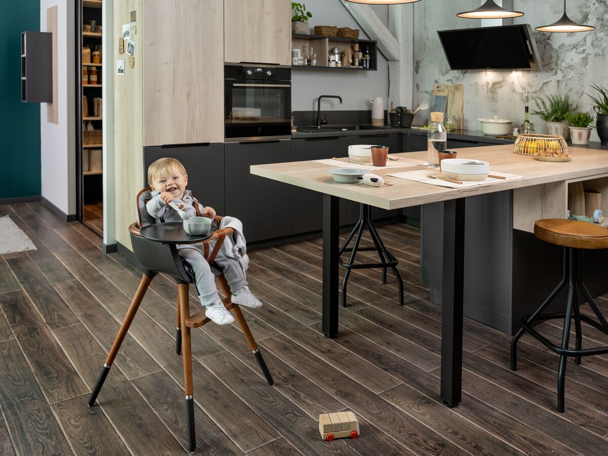 Les nouvelles gammes bois incarnent parfaitement le style Japandi, inspiré du Japon et de la Scandinavie. Sur l’îlot central, le contraste du bois naturel et du bois rainuré apporte une personnalité affirmée. Le plan de travail, assorti aux meubles hauts, se fondent parfaitement dans la pièce, tout en harmonie.