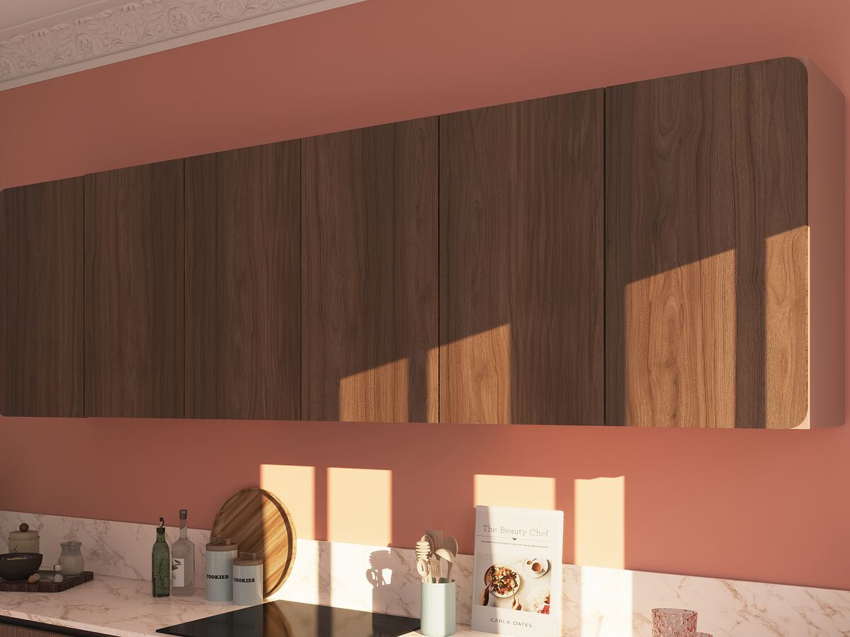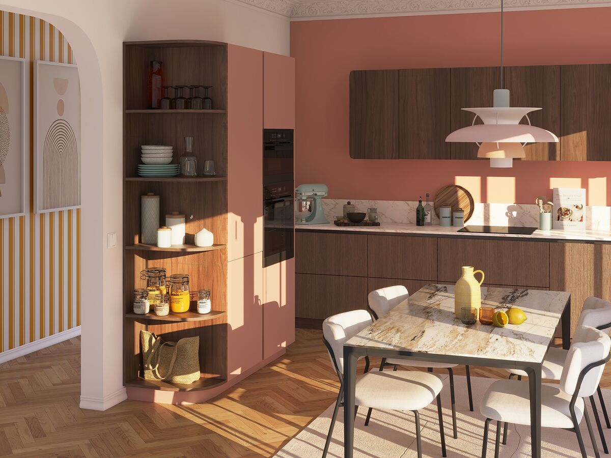 Cette cuisine en bois strié coloris Fox Trot séduit par son alliance subtile entre chaleur naturelle et modernité élégante. Le mariage du bois foncé et des façades rose coloris Peach crée une atmosphère à la fois douce et sophistiquée, idéale pour une pièce de vie conviviale et lumineuse.