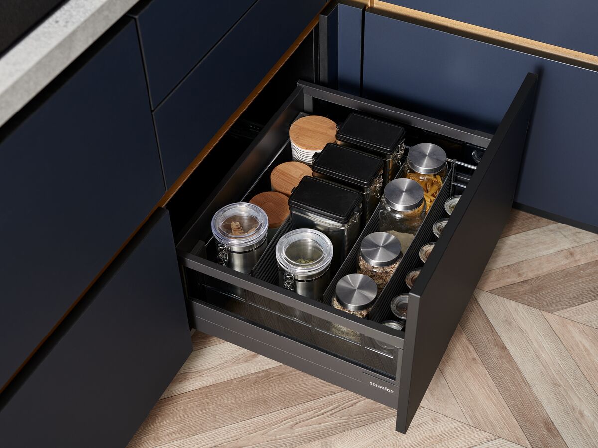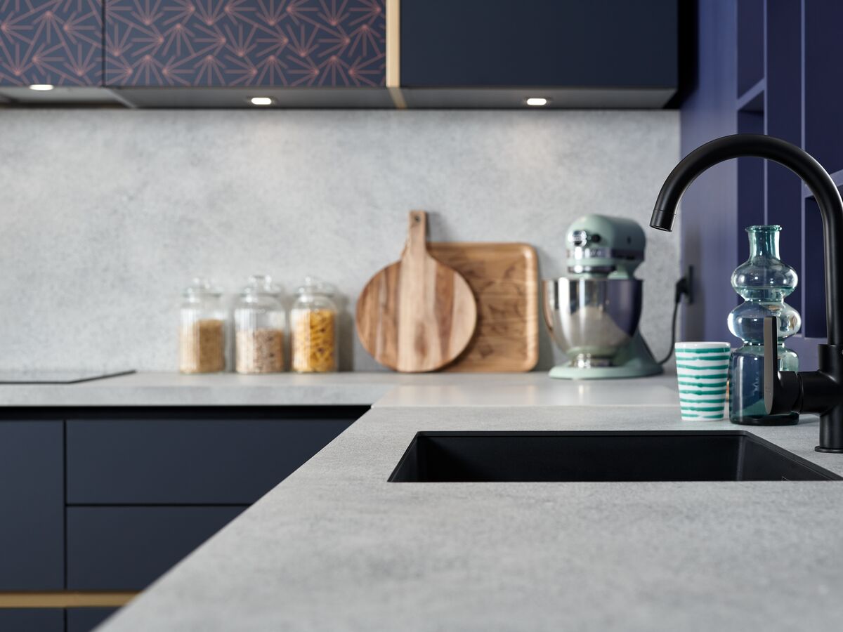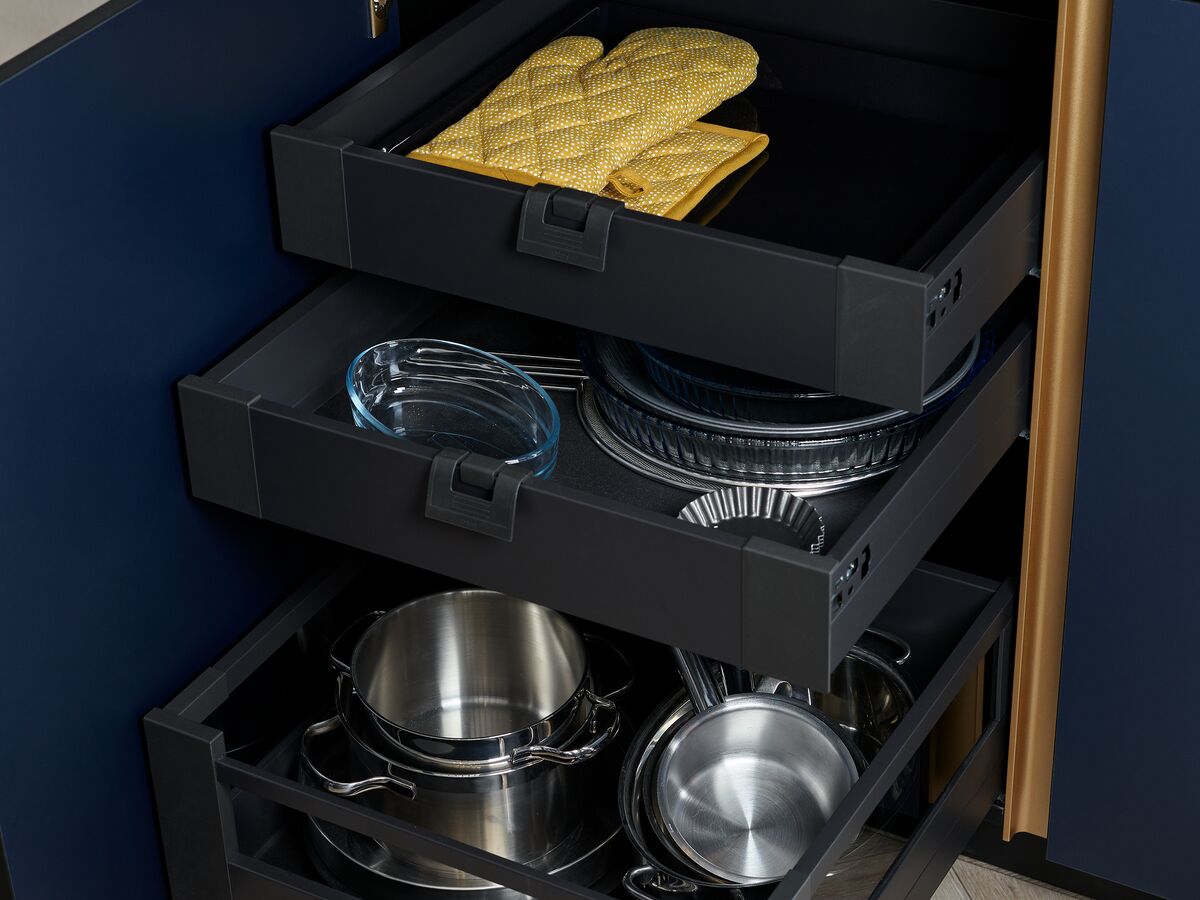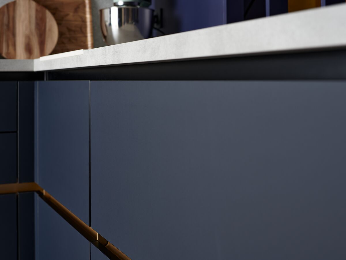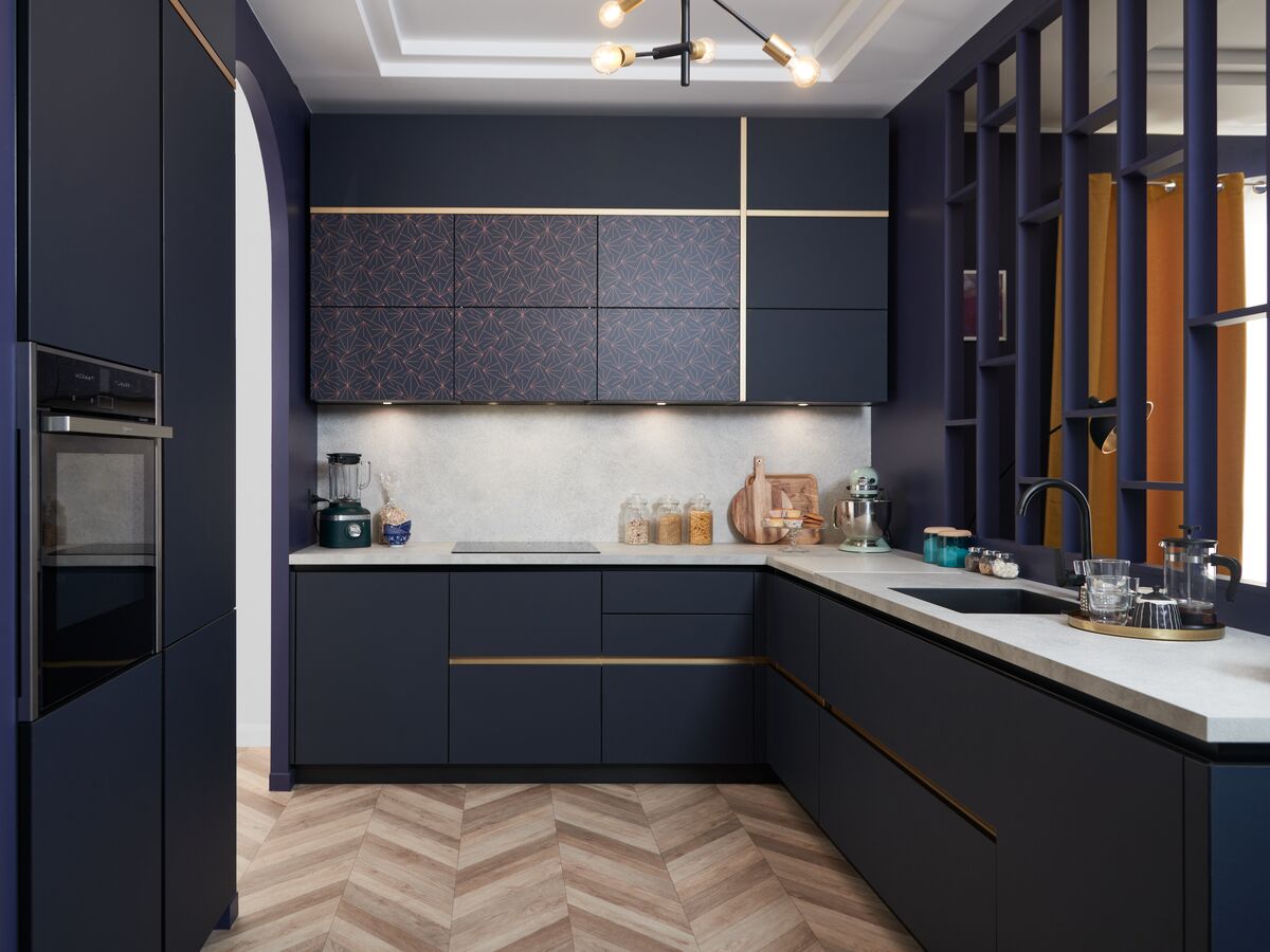Cette cuisine ouverte séduit par son élégante alliance de bleu profond (coloris Navy) et de touches dorées, pour un style raffiné inspiré de l’Art déco. L’implantation en L optimise les déplacements et la fonctionnalité, tout en offrant un espace généreux pour cuisiner et recevoir.