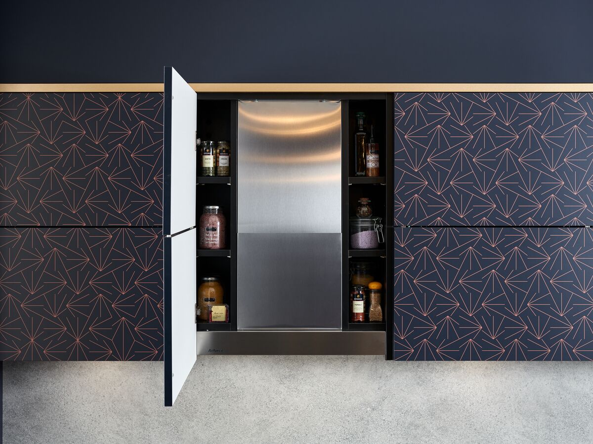 Les façades décoratives imprimées apportent une touche graphique unique, tandis que les éléments fonctionnels comme le meuble range-épices renforcent l’aspect pratique au quotidien. Une cuisine pensée pour allier esthétique, ergonomie et plaisir de cuisiner.