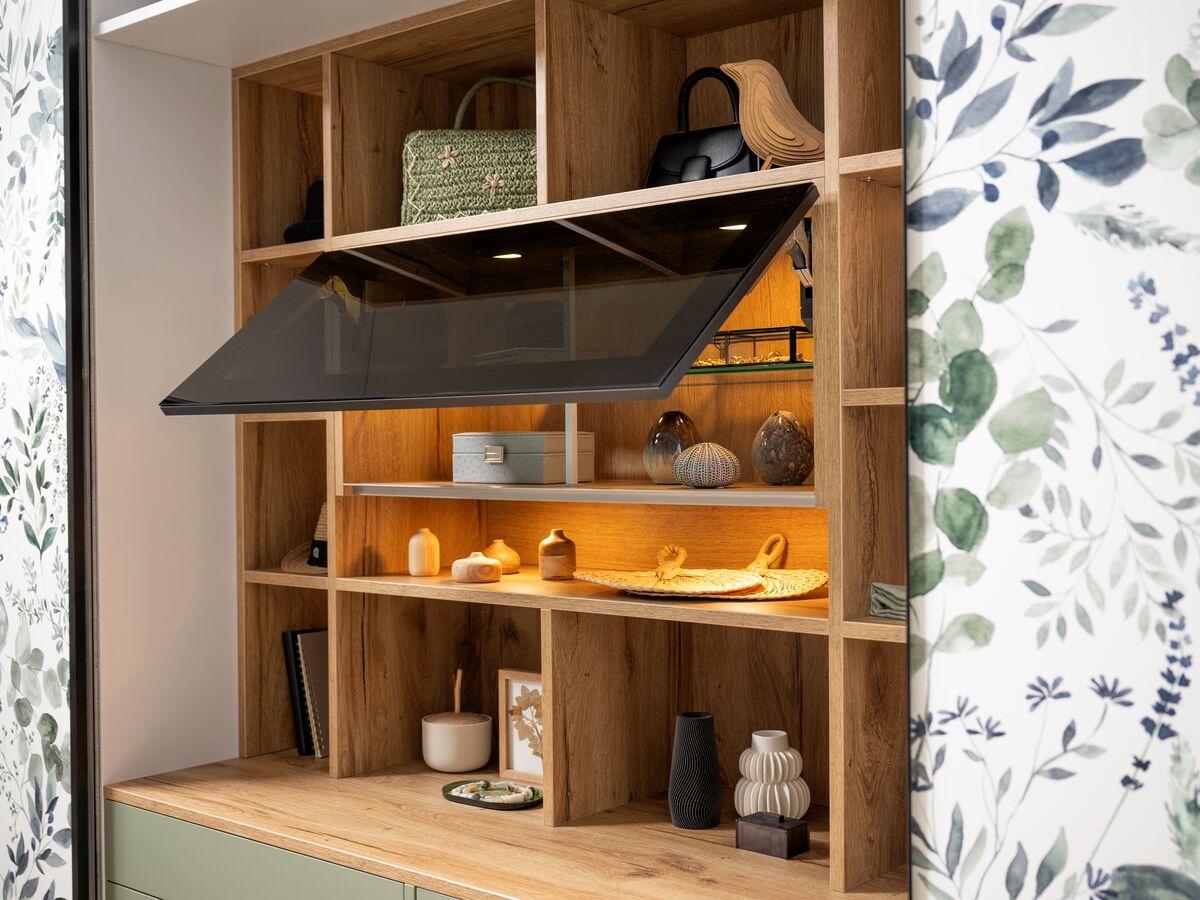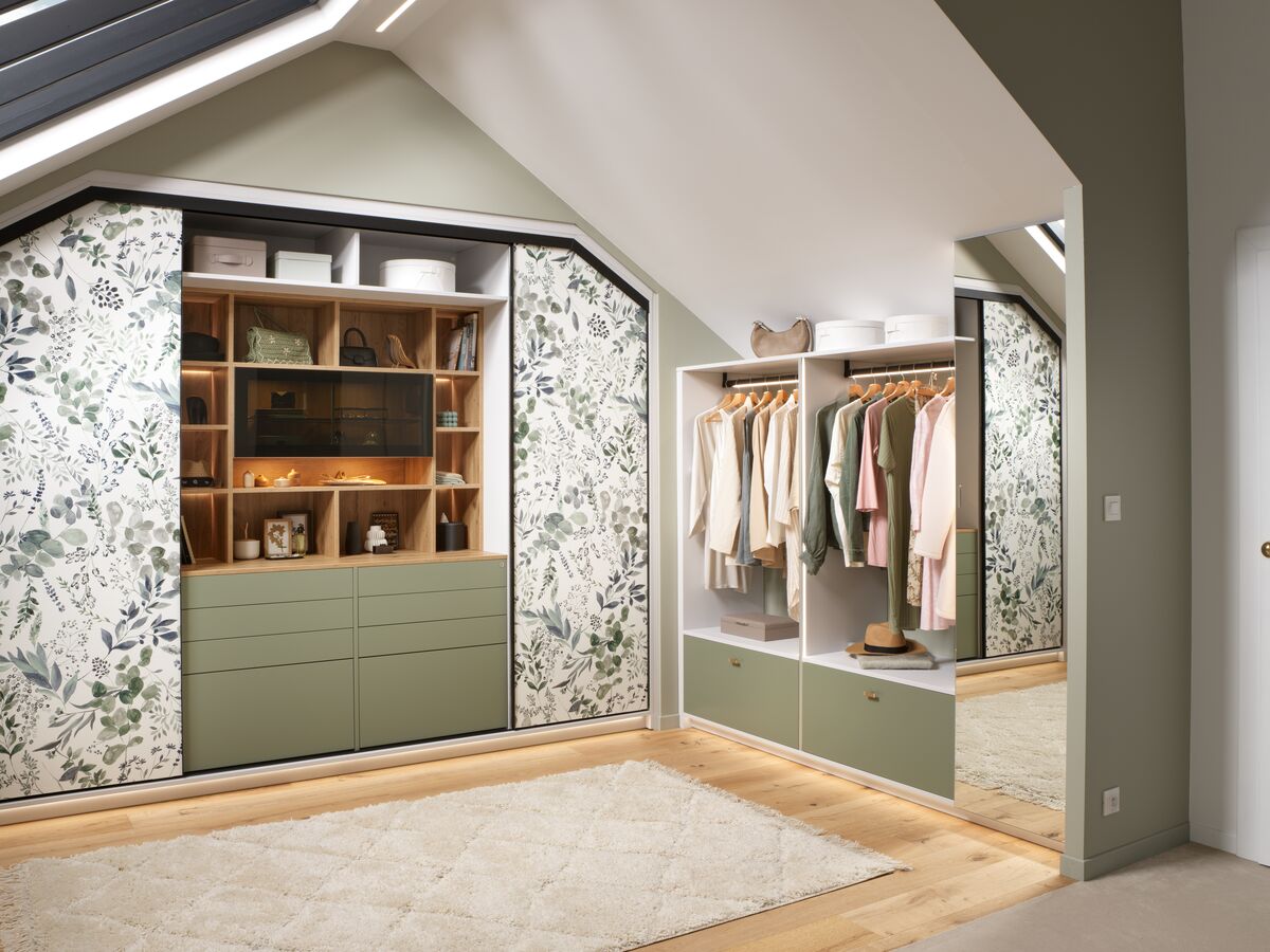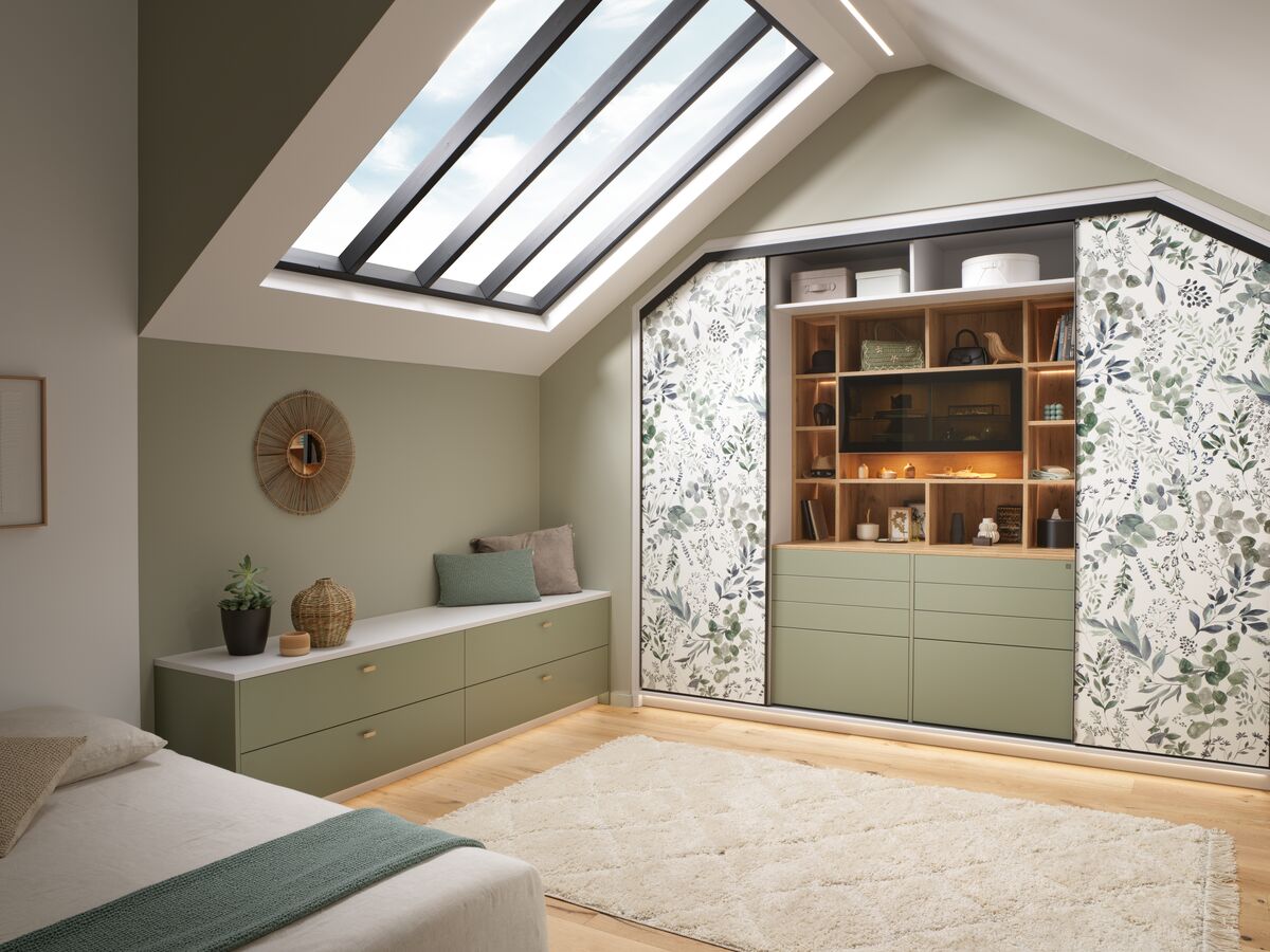 Pour optimiser l’espace disponible, le dressing sur mesure de la collection Into The Wood révèle toute son ingéniosité. Conçu pour s’adapter parfaitement aux sous-pentes, il offre de nombreuses options d’accessoirisation : tringles éclairantes, tiroir à bijoux, étagères coulissantes… Les façades coulissantes au décor imprimé Watercolor créent une ambiance unique et apportent une touche florale raffinée à la chambre. Alliance parfaite entre design, fonctionnalité et atmosphère naturelle, ce dressing transforme l’espace en un véritable cocon personnalisé.