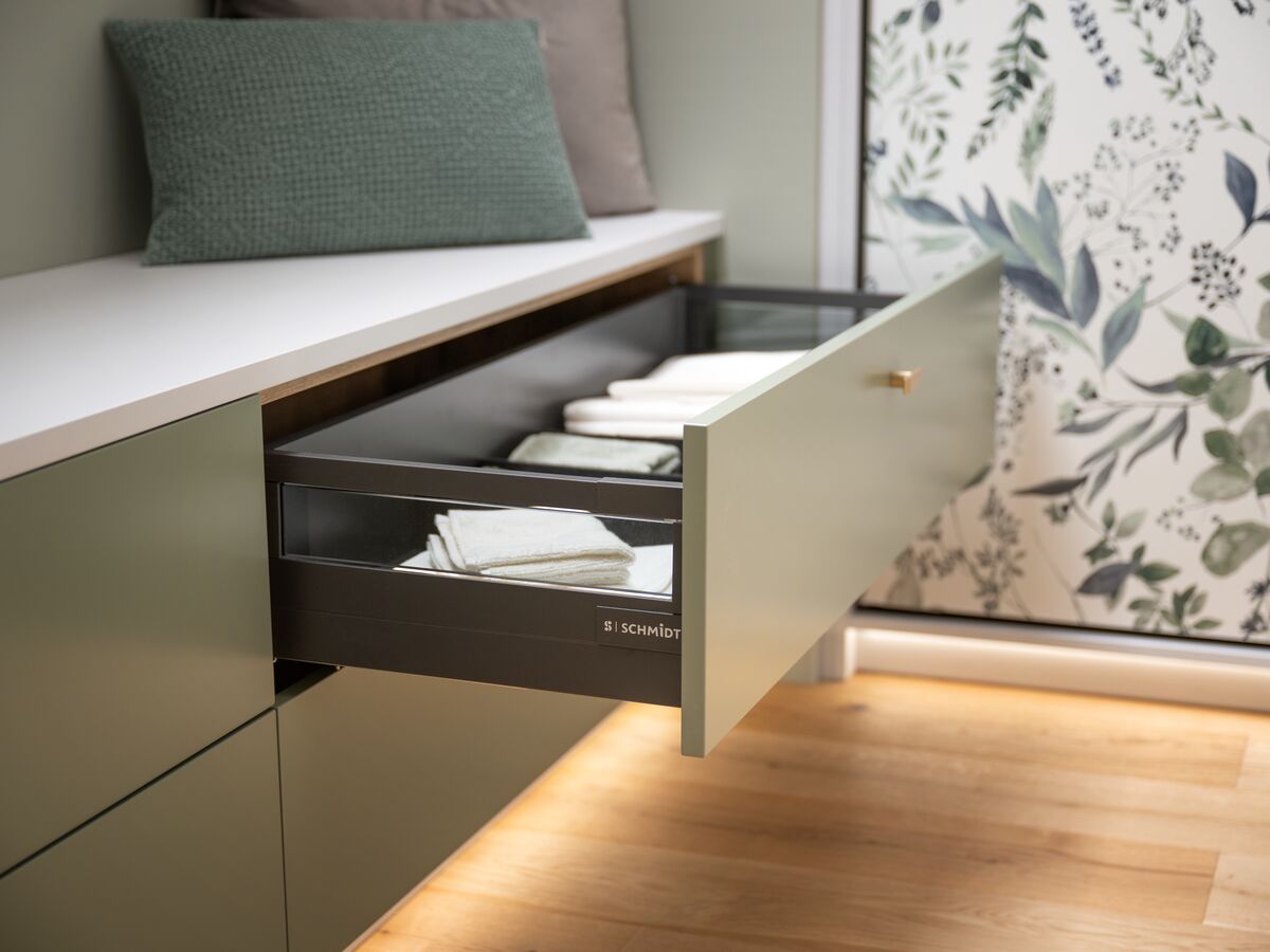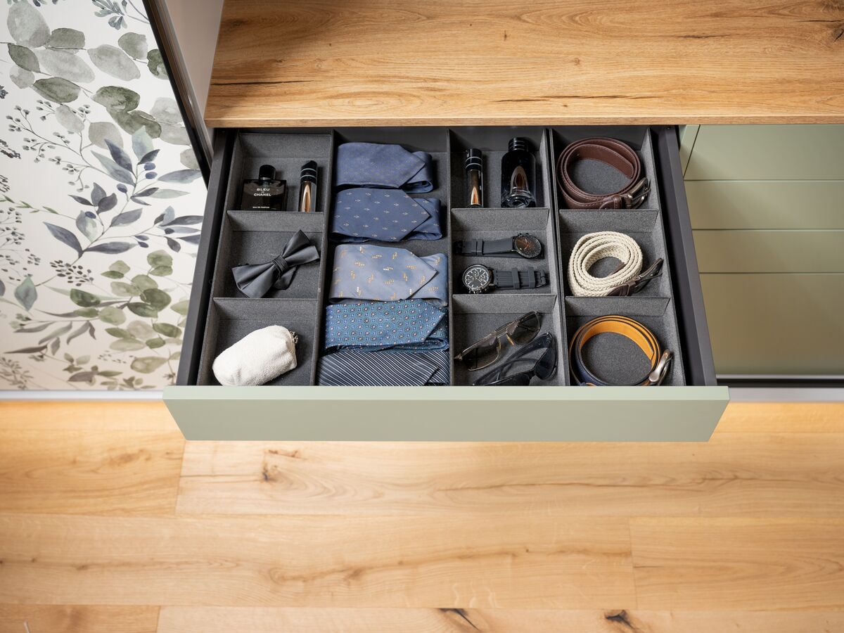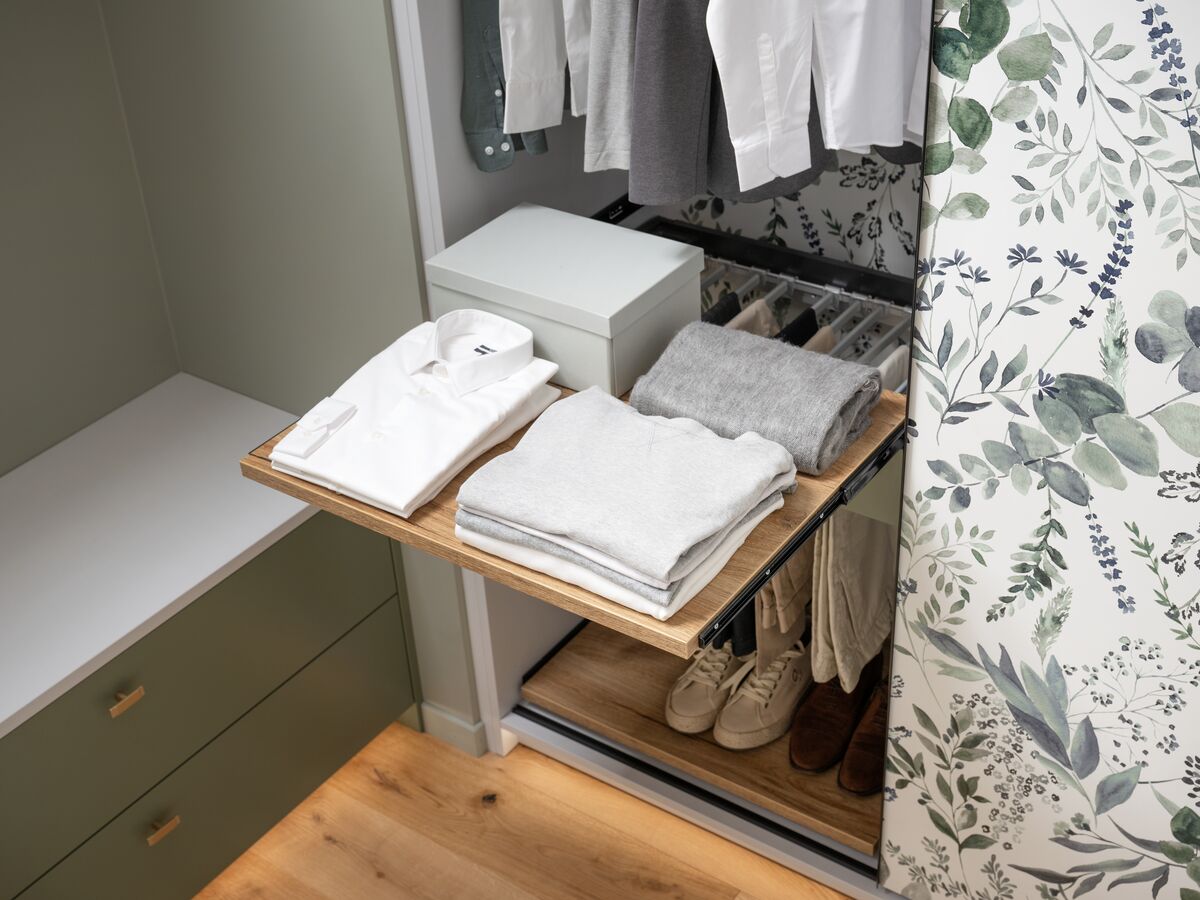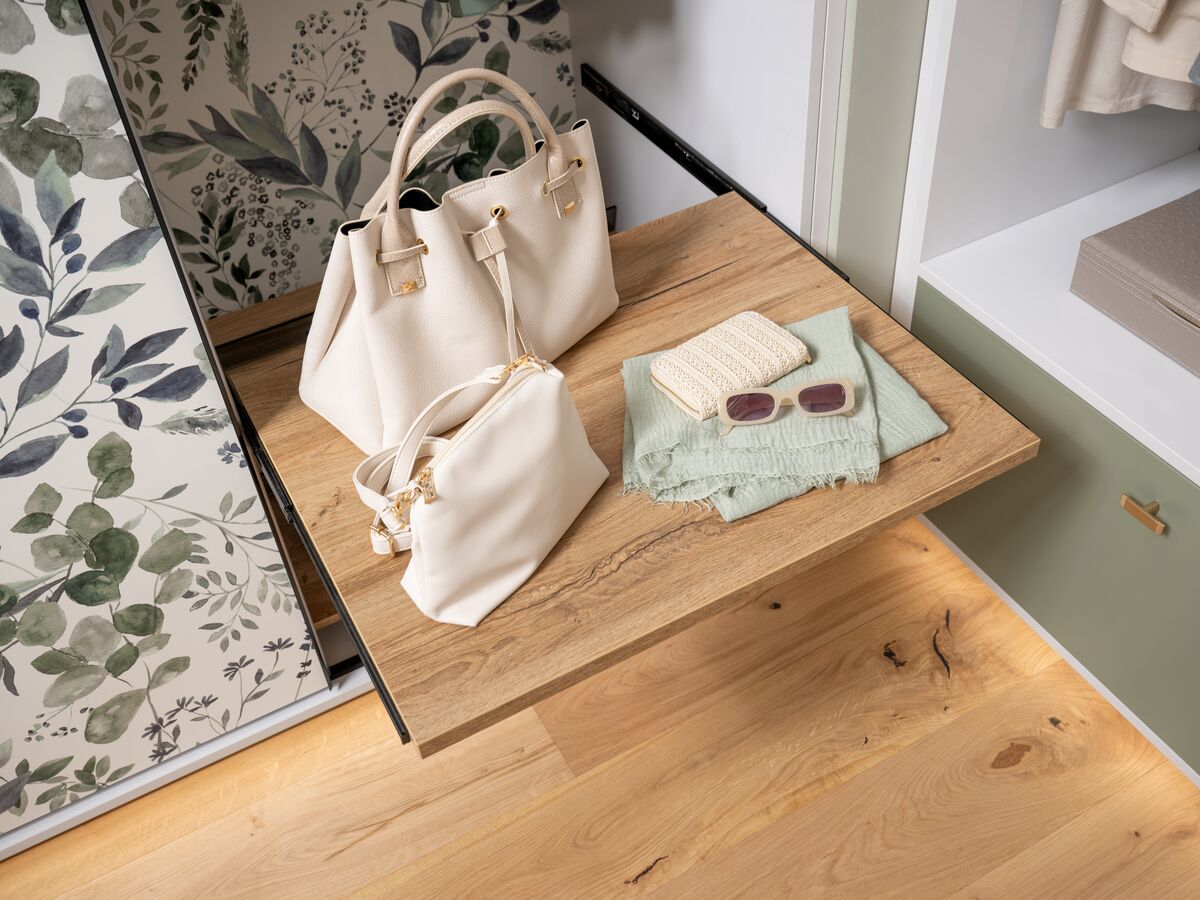 Pour optimiser l’espace disponible, le dressing sur mesure de la collection Into The Wood révèle toute son ingéniosité. Conçu pour s’adapter parfaitement aux sous-pentes, il offre de nombreuses options d’accessoirisation : tringles éclairantes, tiroir à bijoux, étagères coulissantes… Les façades coulissantes au décor imprimé Watercolor créent une ambiance unique et apportent une touche florale raffinée à la chambre. Alliance parfaite entre design, fonctionnalité et atmosphère naturelle, ce dressing transforme l’espace en un véritable cocon personnalisé.
