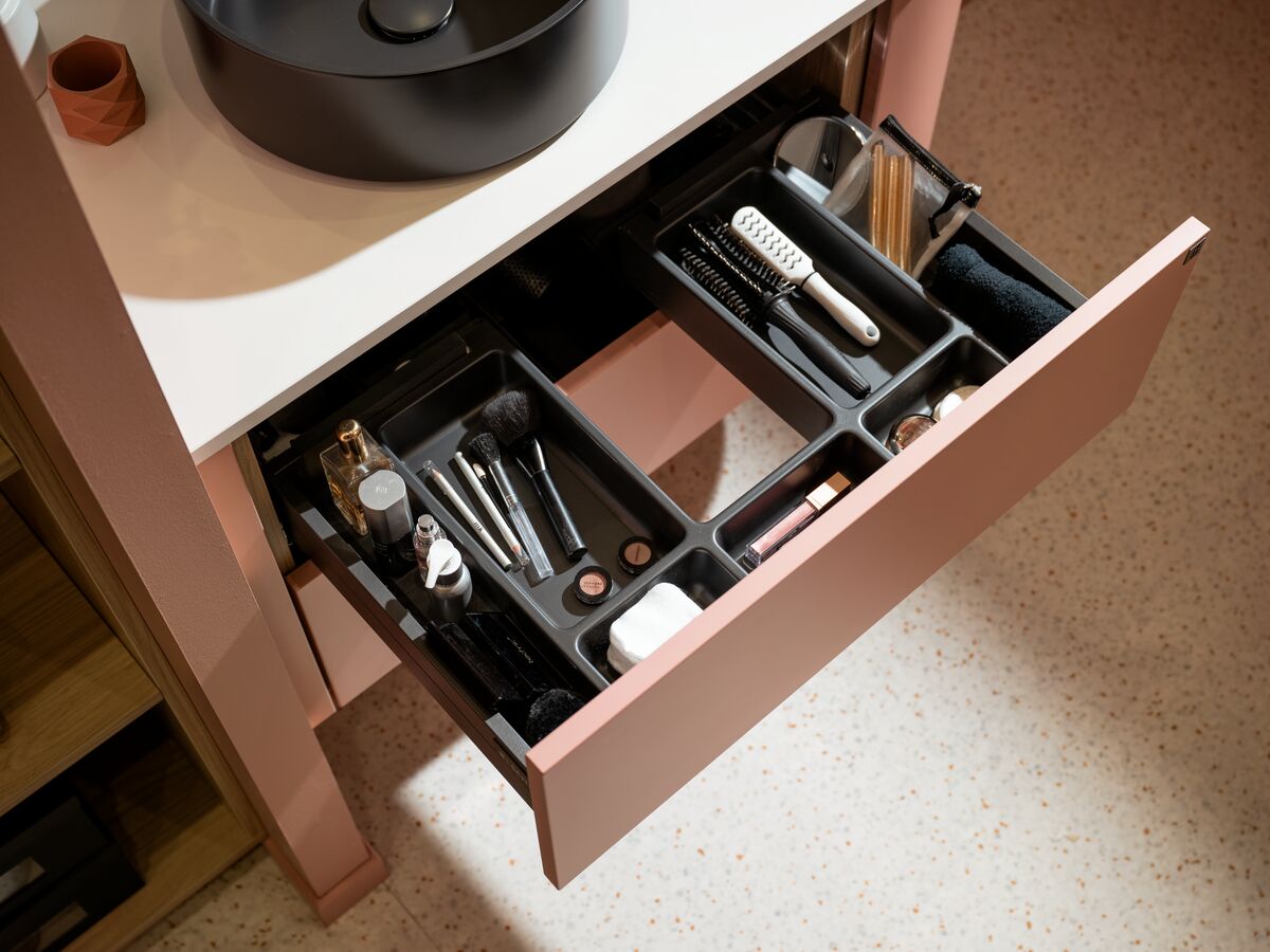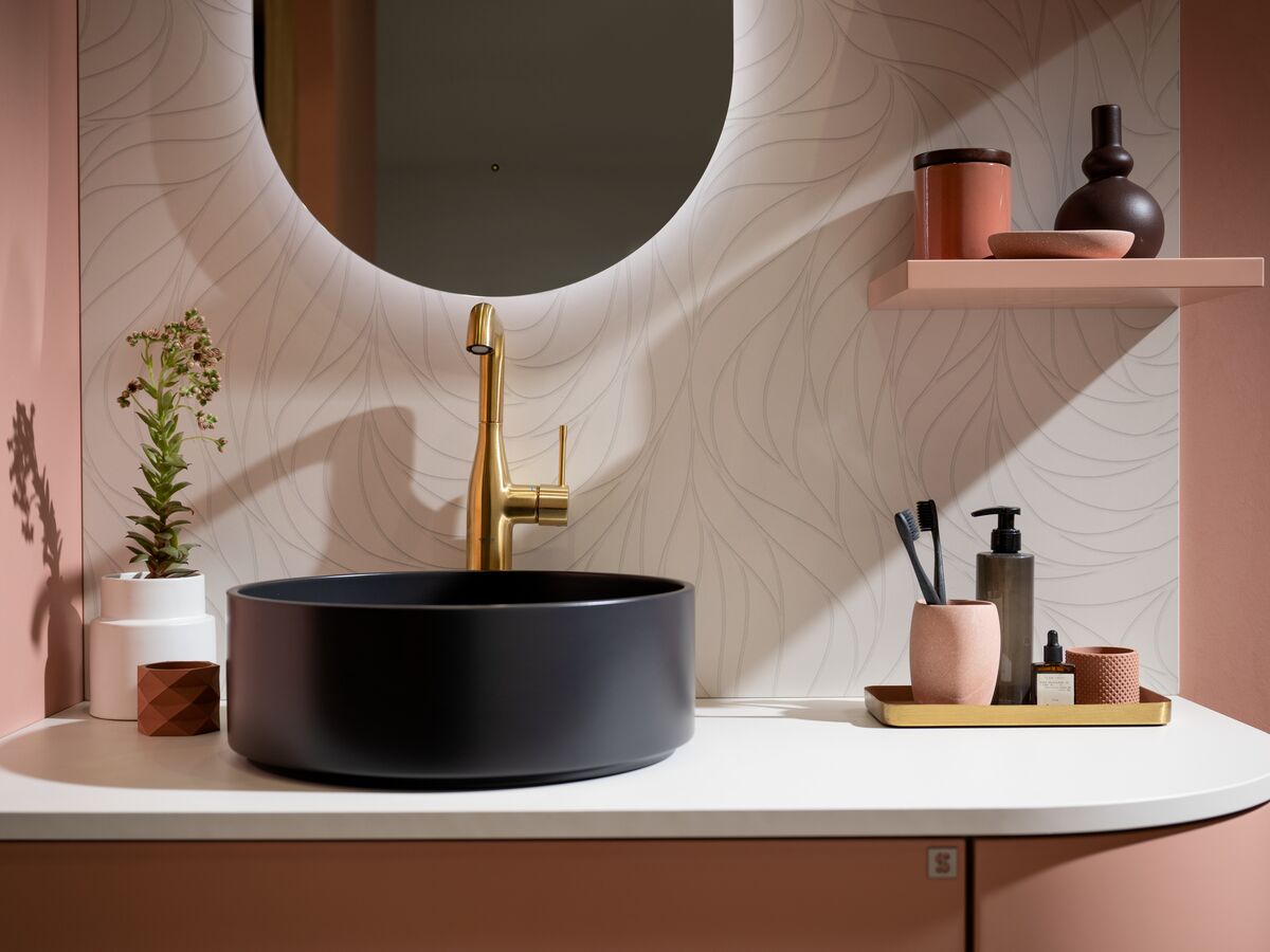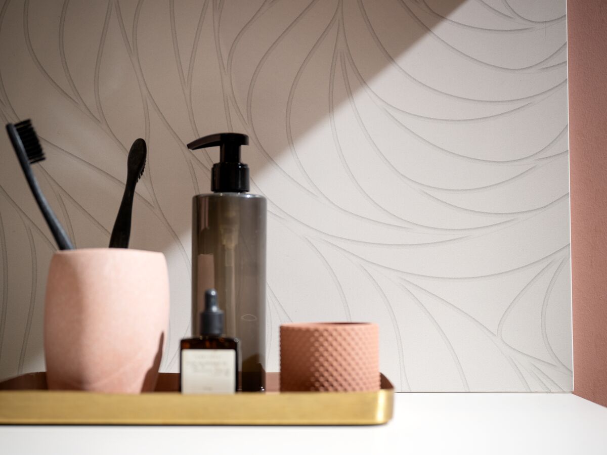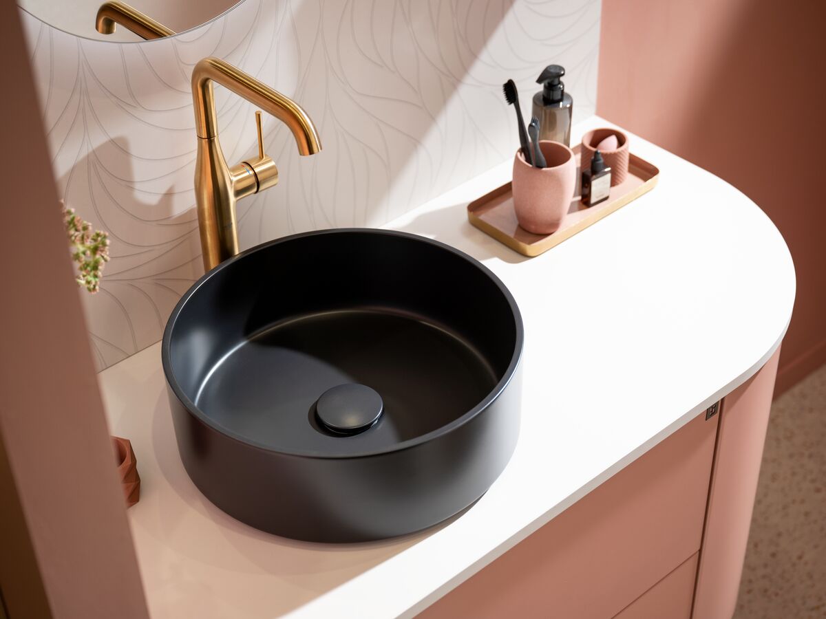 Avec sa délicate couleur pêche, la salle de bains Montmartre bouscule les codes du classicisme avec sophistication. Dans cette salle de bains pour suite parentale, le coloris Peach s’impose comme l’un des acteurs majeurs de l’espace. Le meuble doté d’une façade arrondie sans poignée constitue l’un des ingrédients qui façonnent une véritable signature. Le miroir rétroéclairé de forme ovale offre un rappel subtil, mais tellement essentiel pour créer une ambiance cocooning. Enfin, avec son motif élégant Stencil Clay, le panneau/crédence apposé derrière le meuble vasque participe très largement à moderniser l’espace, tout comme les étagères ouvertes qui accueillent objets et autres accessoires décoratifs qui viennent parfaire l’ambiance.