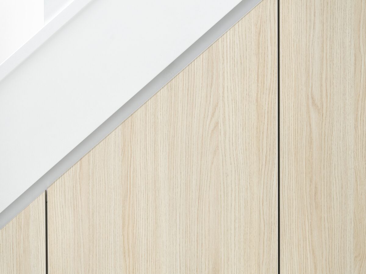 Ce placard sur mesure sous escalier illustre parfaitement l’art d’optimiser les espaces atypiques. Conçu avec une profondeur généreuse, il exploite chaque centimètre disponible pour offrir une organisation intérieure astucieuse : une penderie fonctionnelle pour manteaux et vestes, des rangements pratiques pour boîtes à outils, aspirateur ou équipements encombrants, et des espaces fermés pour dissimuler les objets du quotidien. Afin d’alléger visuellement l’ensemble et d’apporter une touche déco, une niche ouverte centrale permet de mettre en valeur quelques objets ou accessoires décoratifs. Ses lignes épurées et son intégration millimétrée sous l’escalier en font un aménagement aussi discret qu’élégant, qui transforme un espace souvent perdu en un véritable atout esthétique et fonctionnel de la maison.