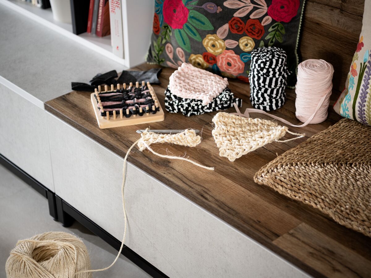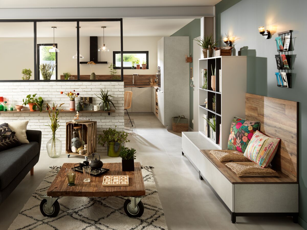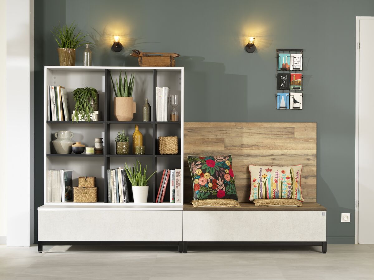 Ce banc bibliothèque allie design et praticité en proposant à la fois un espace de rangement pour les livres et une assise supplémentaire dans le salon. Polyvalent, il se transforme en lieu convivial lorsqu’il est agrémenté de coussins confortables, offrant ainsi une solution idéale pour partager des moments en famille ou recevoir des invités de manière chaleureuse et informelle.