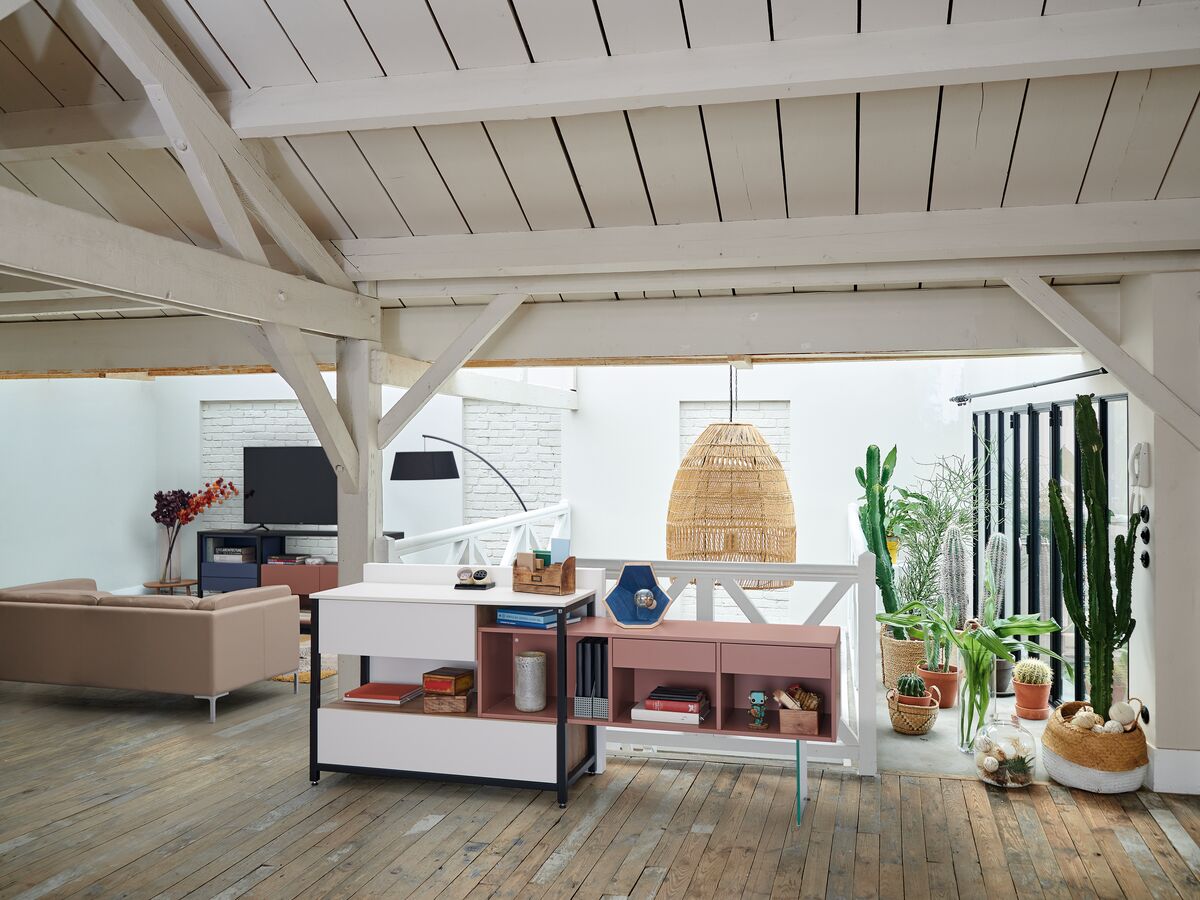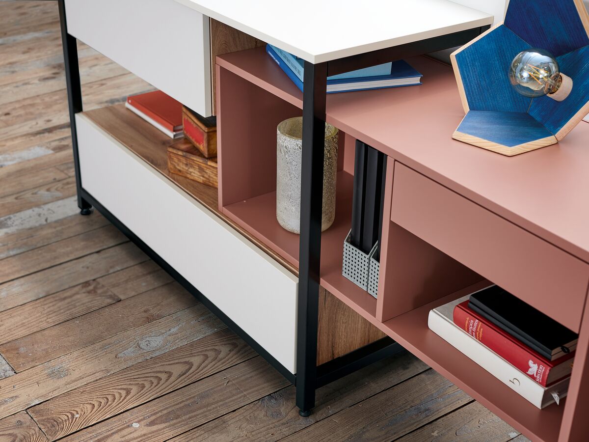 Cette commode bureau 2-en-1 combine rangements pratiques et petit secrétaire intégré pour offrir une solution aussi fonctionnelle qu’esthétique. Compacte et élégante, elle trouve facilement sa place dans un salon ou une chambre. Son design « style indus » est sublimé par un pied en verre qui crée un effet suspendu, léger et contemporain. Un meuble ingénieux qui associe praticité et raffinement au quotidien.