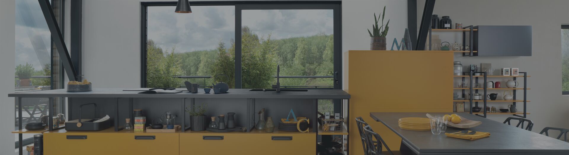 L’inspiration pour donner de la couleur à votre cuisine passe aussi par les murs. Selon la teinte choisie, libre à vous d’opter pour le total look coloré, comme l’a osé notre cuisine bleue et dorée style Art Déco. La couleur des façades se retrouve sur les murs, transformant ainsi votre cuisine en véritable monde à part dans la maison. Miser sur l’effet inverse constitue aussi une excellente manière de mettre en valeur la teinte profonde d’une façade. Par exemple, la cuisine arrondie L’intemporelle se pare de couleurs neutres pour mieux faire ressortir le vert profond des façades. De même, des murs de couleurs sont tout indiqués pour mettre en avant une cuisine aux lignes classique. Lorsqu’il s’agit de murs colorés, il est ainsi souvent question de jouer avec les contrastes. Mais tout est question de style. Pour une cuisine industrielle, trancher se révèle particulièrement approprié. Pour une atmosphère plus nature comme dans la cuisine Jardin d’intérieur, recherchez avant tout l’harmonie entre les couleurs des différents matériaux : des murs de couleur verte, un plan de travail gris, des tabourets en bois…