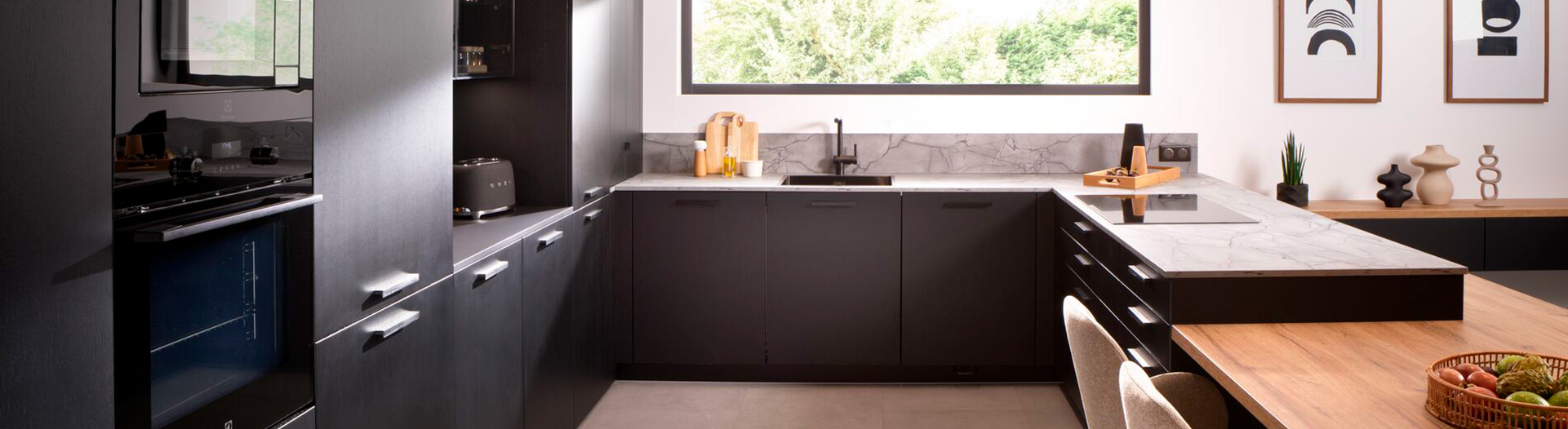 Cuisine équipée sur mesure Cuisine ouverte ou américaine Cuisine avec îlot central Petite cuisine Cuisine en U Cuisine en L ou en angle Cuisine en longueur Couleurs de cuisine Cuisine blanche Cuisine griseUn autre point fort de la cuisine noire réside dans le choix extrêmement varié de finitions que vous avez à votre disposition. Ainsi, la cuisine noire et terrazzo est très prisée des amateurs de matériaux bruts tels que le béton. Son aspect minéral et épuré ainsi que son toucher velours créent immédiatement une atmosphère feutrée des plus agréables. De plus, son côté industriel apporte énormément de cachet à l'espace. En bonus, le noir mat masque les petites imperfections et s'entretient plus aisément.