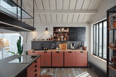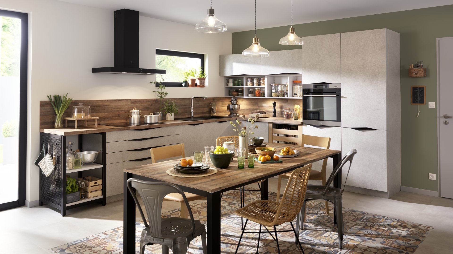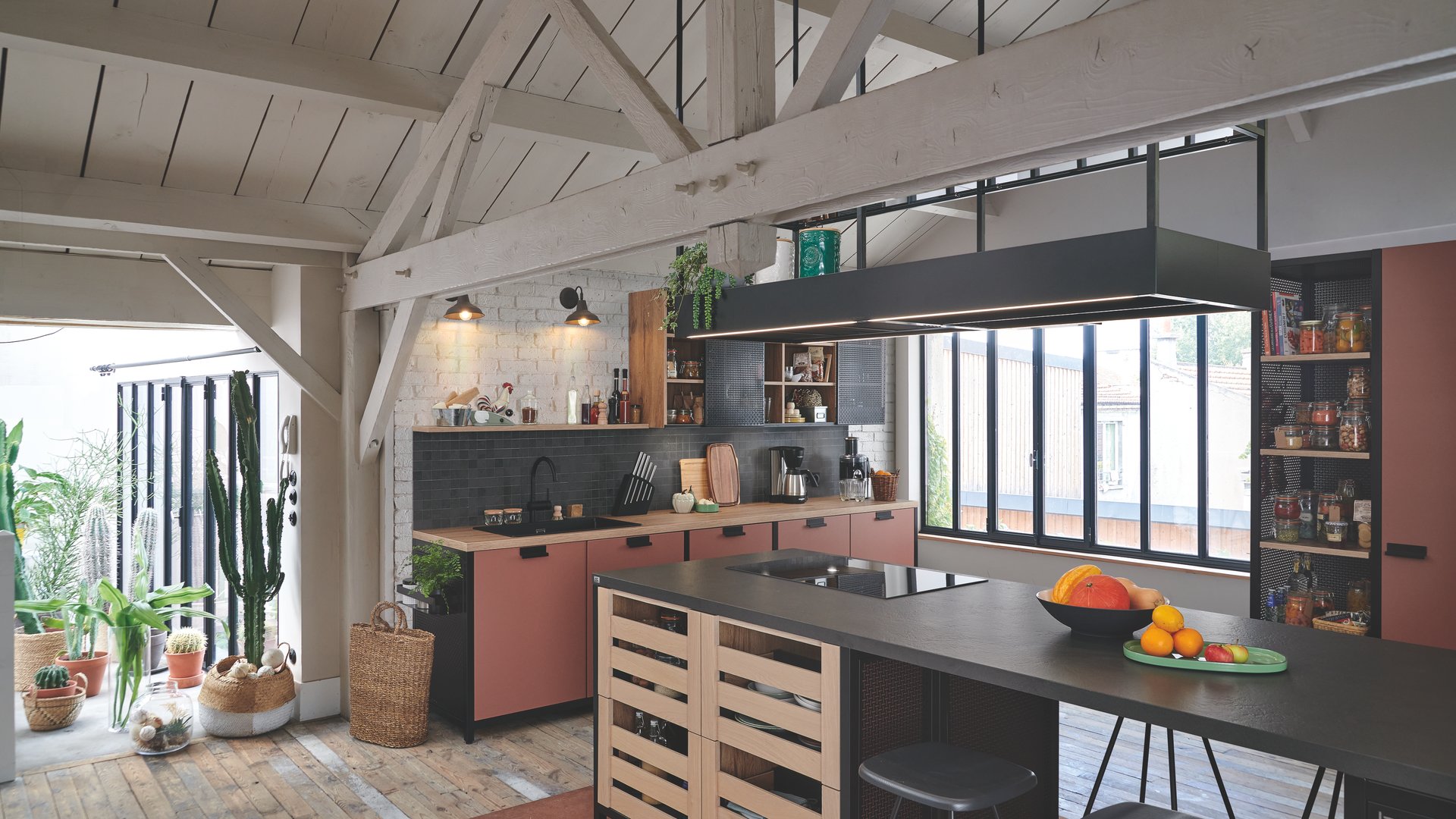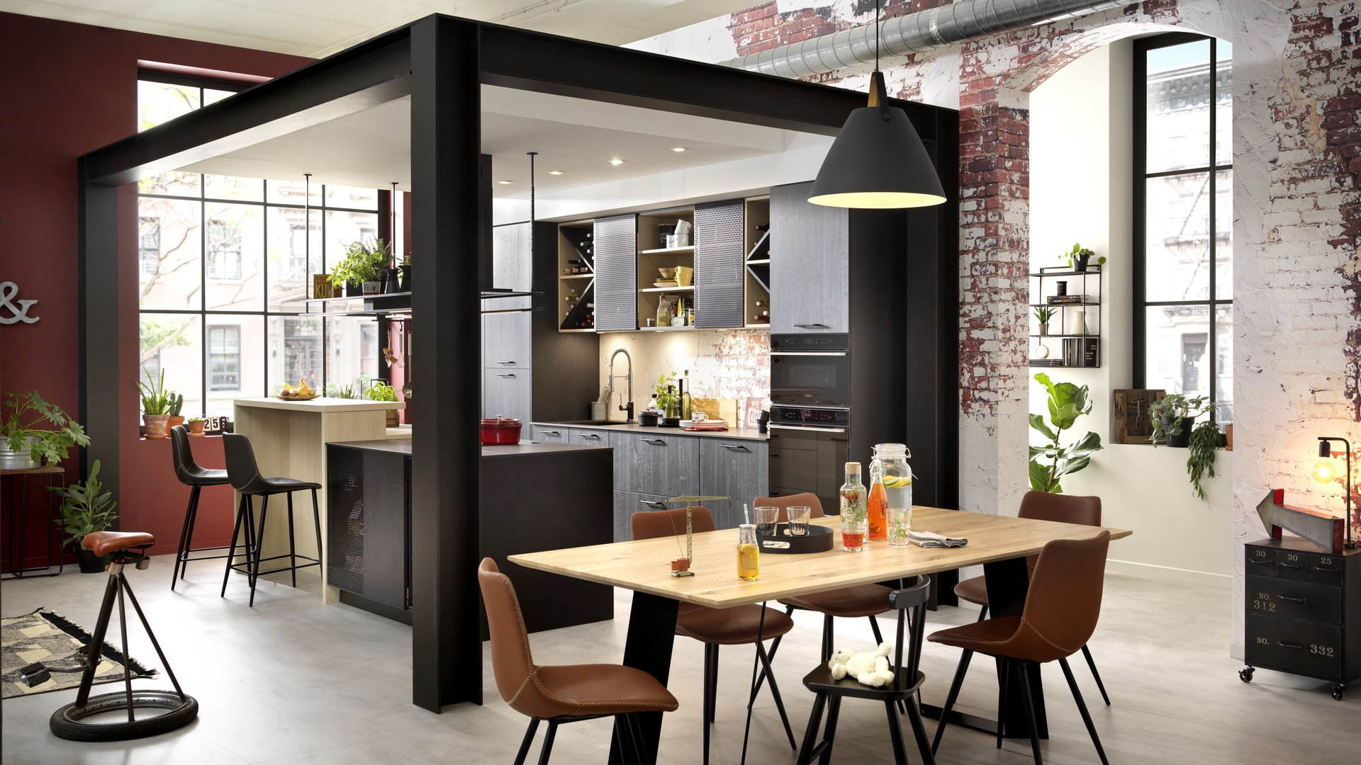 Cette cuisine aux accents bistrot porte tellement bien son nom ! Le mélange subtil entre le métal noir et les différentes essences de bois apporte authenticité et un côté industriel à la cuisine, et donne l’allure d’un véritable atelier. Et bien évidemment, la cuisine est aménagée d’éléments de l’Epicerie tels que le châssis en métal noir, les façades coulissantes grillagées et les rangements décoratifs. Les moments de convivialité sont assurés grâce à l’îlot central, tellement pratique pour recevoir des amis ou la famille !