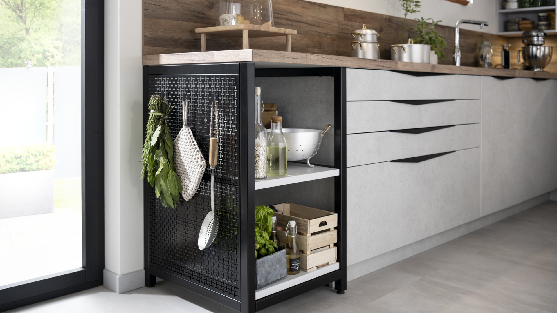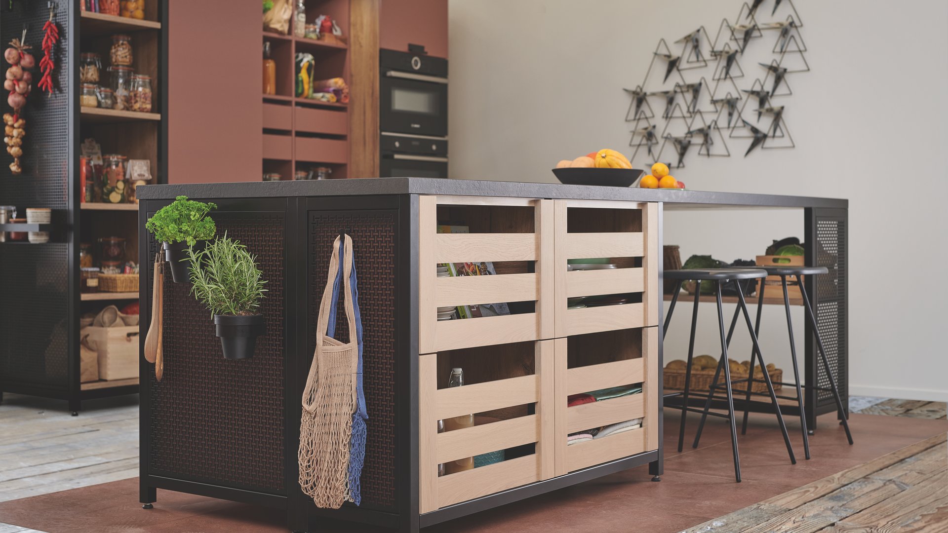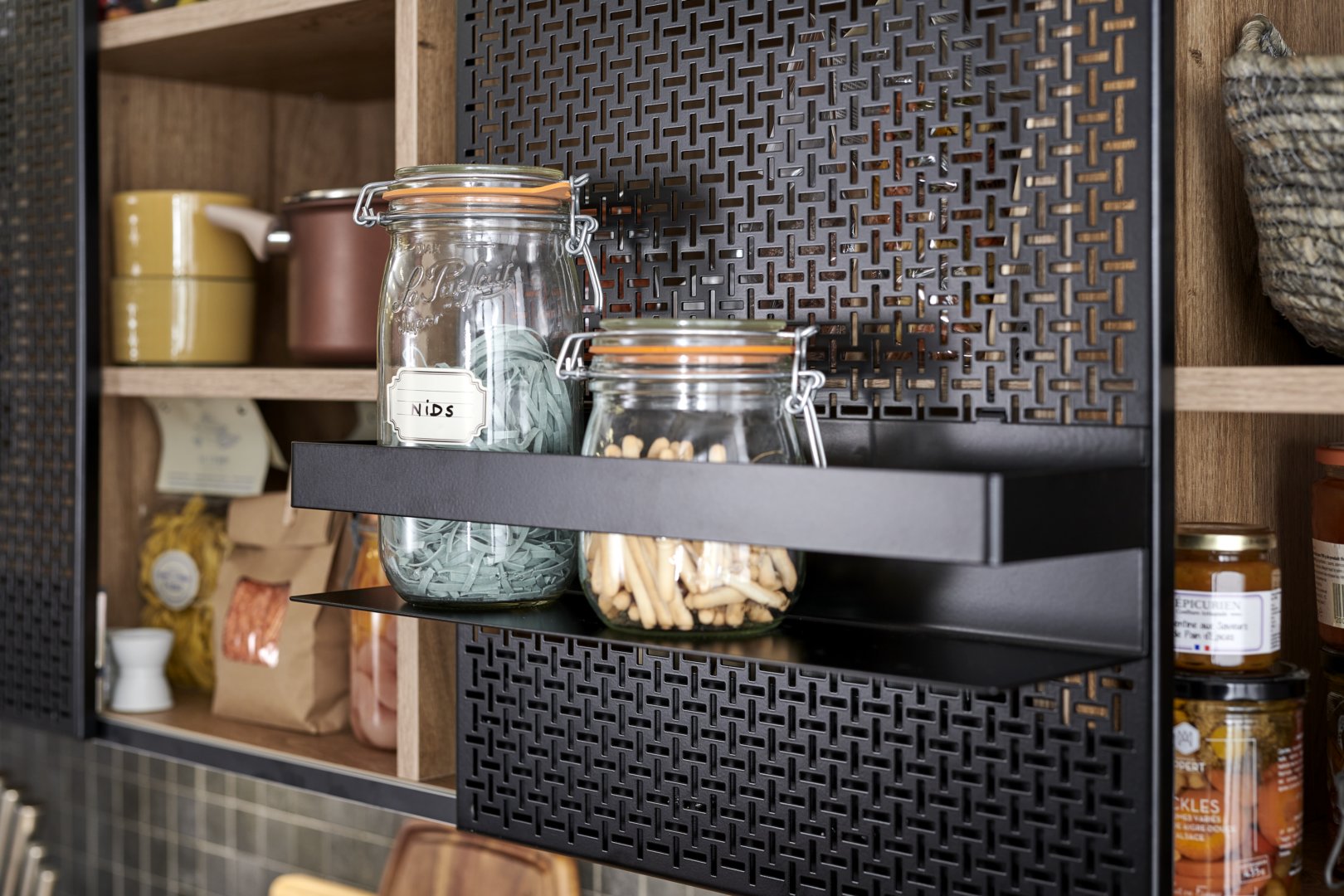 Les éléments déco métal (bout d’îlot…) sont indispensables : ils renforcent le rendu esthétique du concept Epicerie et s’adaptent aux cuisines les plus classiques. Idéals pour y ranger toutes vos provisions !