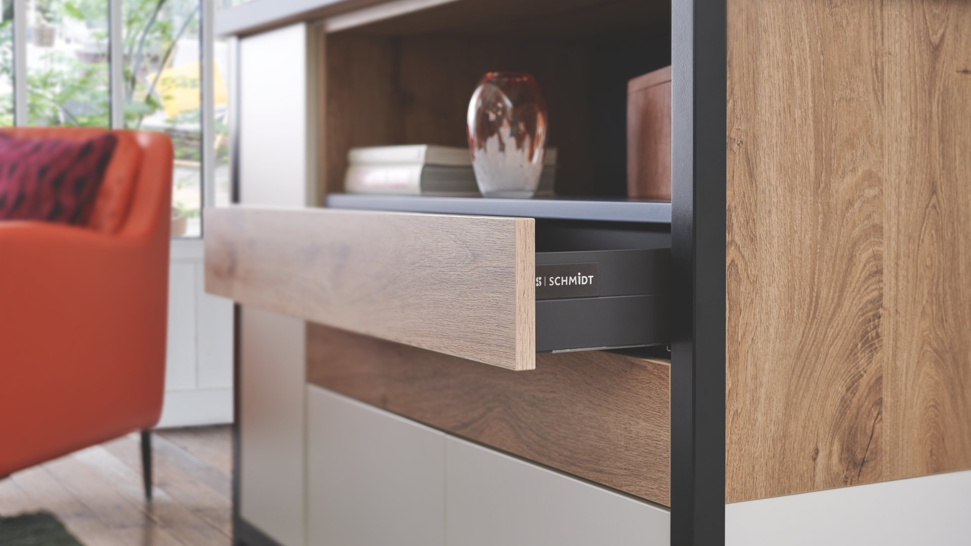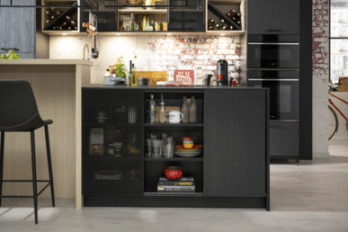 Pour ranger vos plus belles bouteilles et les avoir à portée de main, optez pour ce meuble buffet à la fois pratique et esthétique. La poignée exclusive Schmidt et le châssis en métal noir s’intègrent parfaitement dans cette cuisine !
