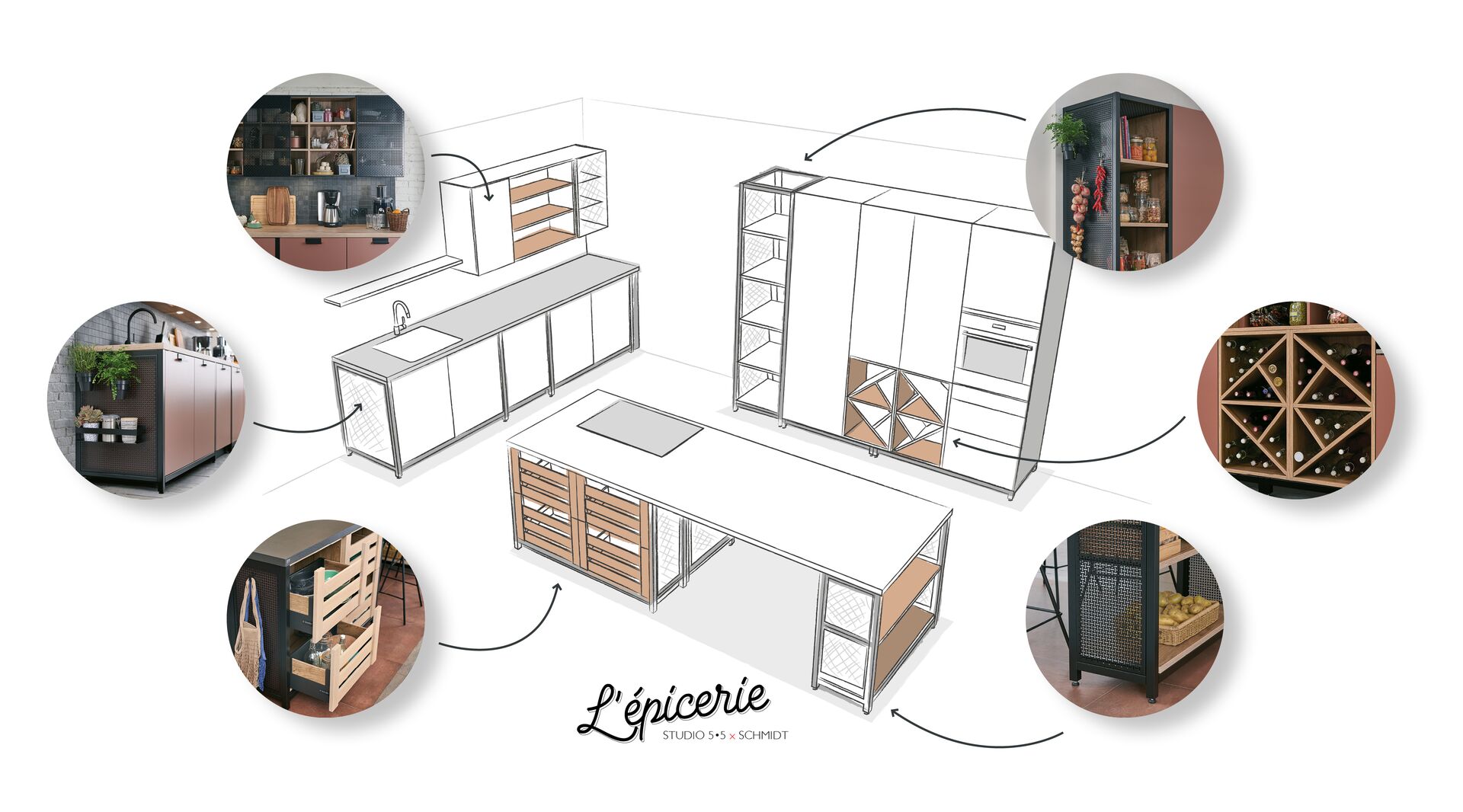 L’Epicerie est née de la collaboration entre le Studio 5•5* et Schmidt. Notre objectif est simple : créer un concept fort et reconnaissable, et le développer avec la volonté de répondre aux besoins et modes de vie des consommateurs.