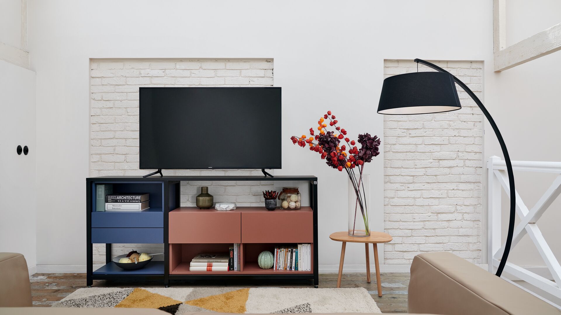 Le châssis en métal noir de ce meuble TV design est en total harmonie avec le style industriel des autres meubles de la maison. Les tiroirs coulissants et niches ouvertes sont tellement pratiques !