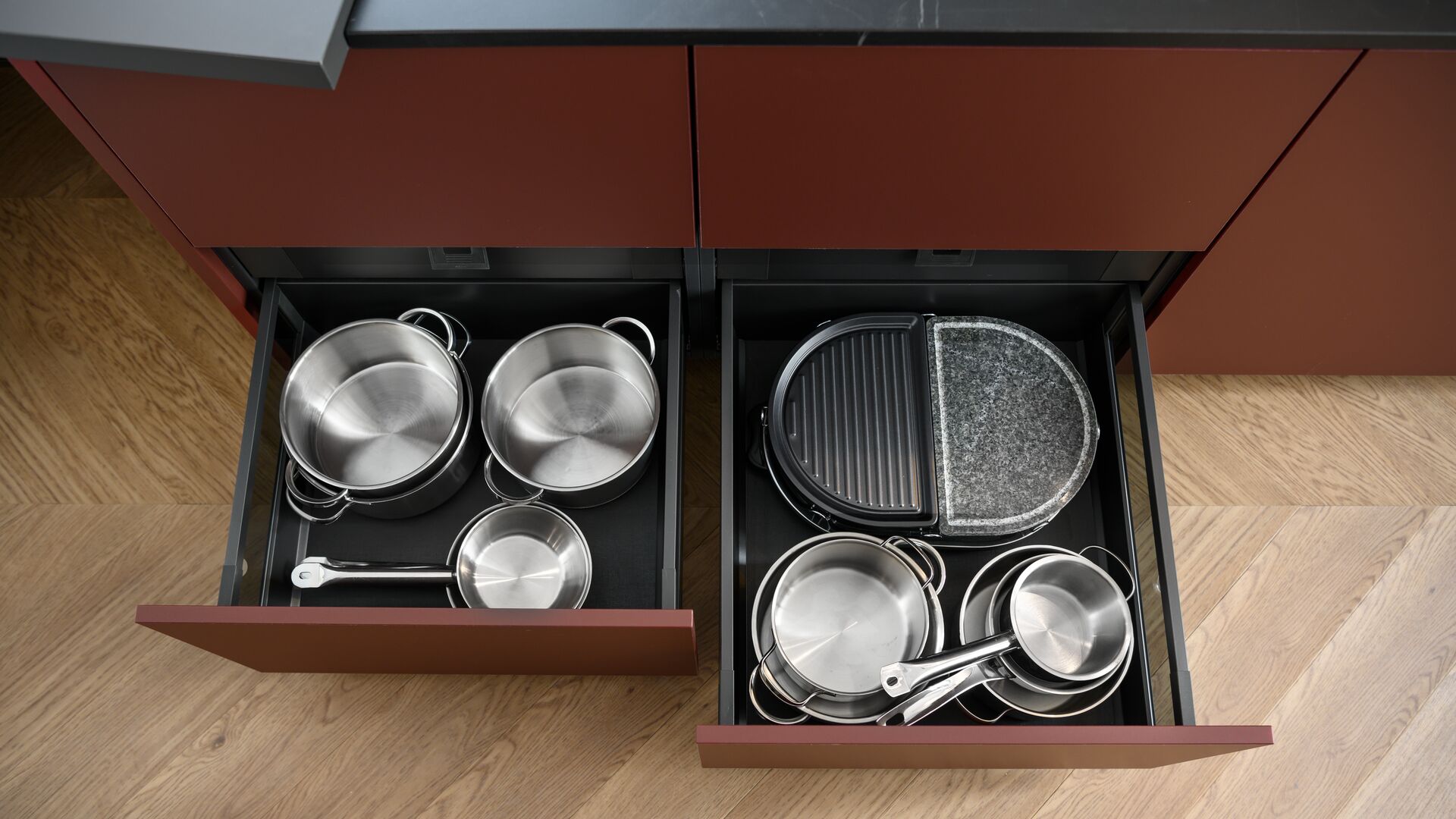 Une place pour chaque chose. Le vrai sur-mesure, c’est une valeur sûre : des tiroirs adaptés aussi bien à la dimension de vos accessoires qu' à la largeur de votre pièce - du long rouleau de pâtisserie aux toutes petites cuillères à moka.
