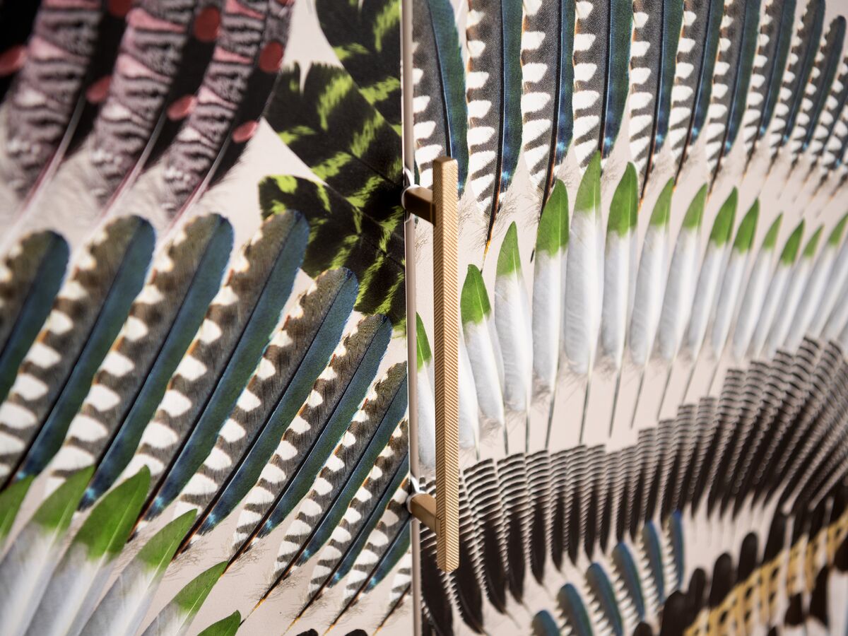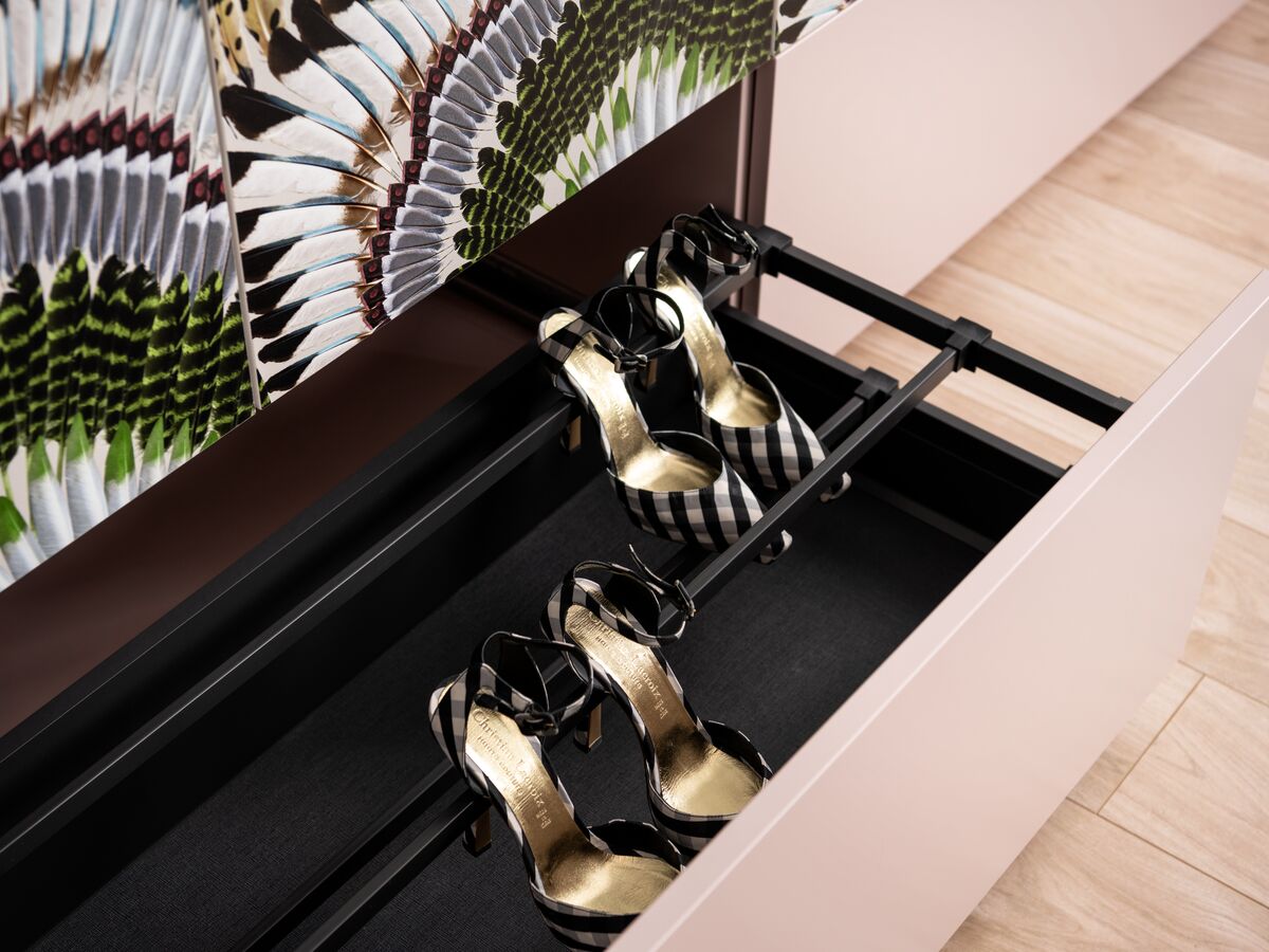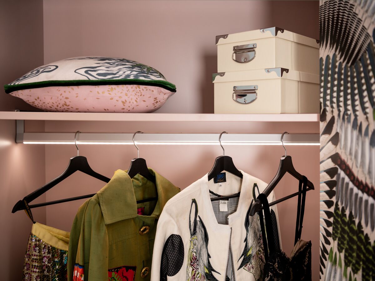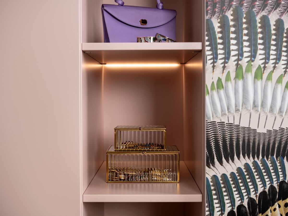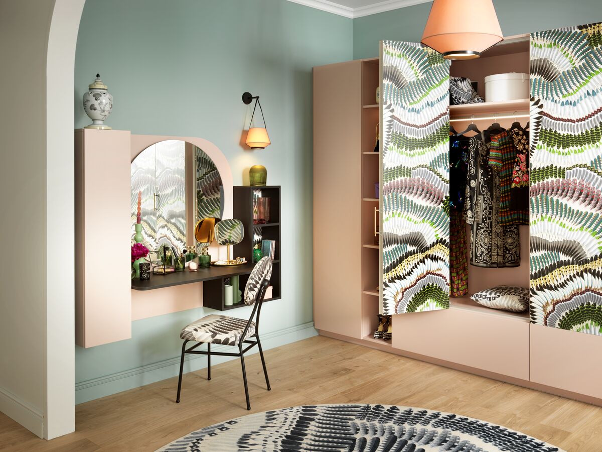 Pour aménager cet élégant dressing, deux Maisons françaises de l’habitat et de la décoration se sont réunies. Afin d’exprimer le raffinement et l’originalité dont Schmidt et Christian Lacroix Maison font preuve, le décor « Prête-moi ta plume » mêle harmonieusement graphisme et tourbillons de plumes multicolores. L’association des coloris La vie en rose et Nano Black apporte un contraste abouti. Le caractère fonctionnel de l’agencement sur mesure ainsi que les éclairages et portes pliantes ultra-pratiques de ce dressing sont un vrai plus… pari réussi !