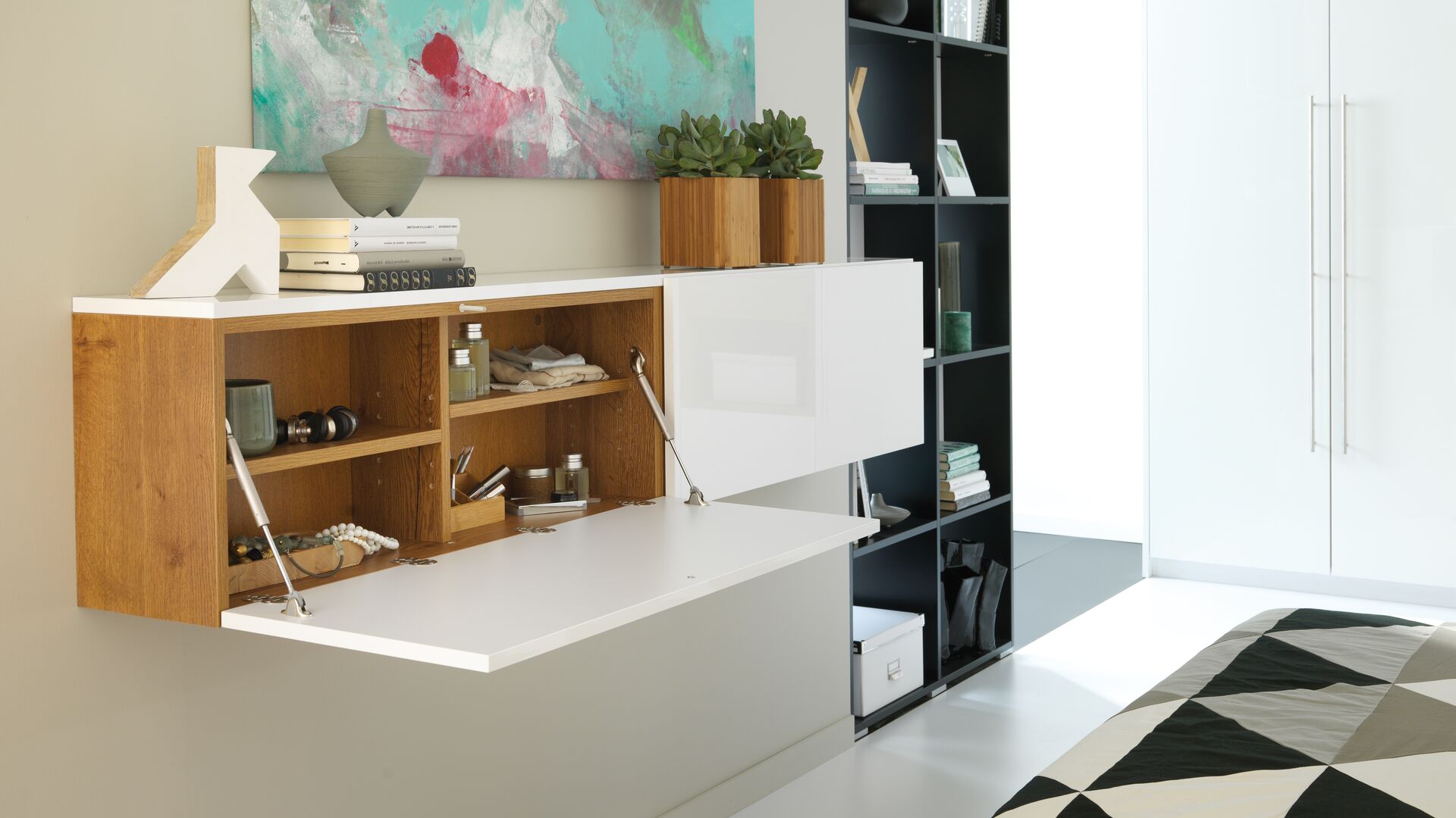 Ces rangements de lit sont en mélaminé coloris bois Cognac et laque brillante blanche.