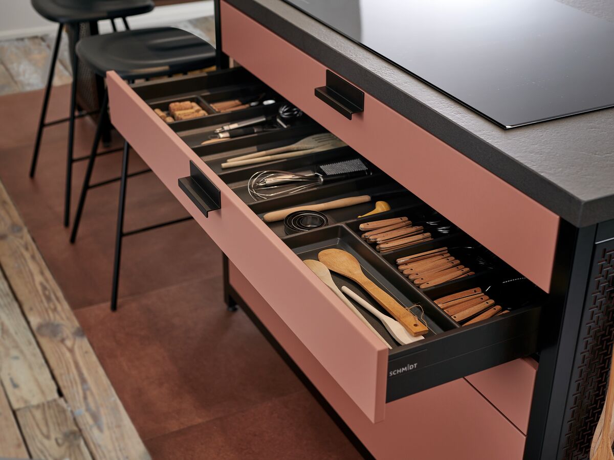 Cette cuisine au style industriel a été conçue pour la convivialité. Avec son îlot central et ses matériaux bruts, cette cuisine incarne l’esprit loft dans une version chaleureuse et fonctionnelle. Les façades mates, dans des tons terracotta et bois, créent une atmosphère à la fois authentique et contemporaine.