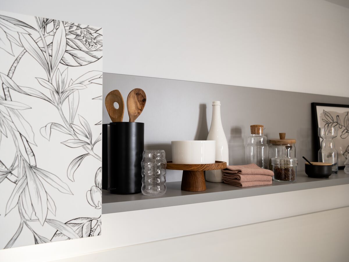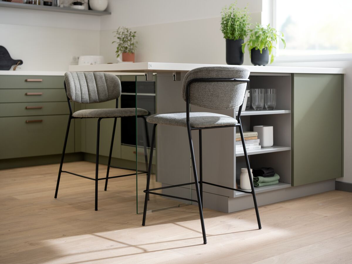 Cette cuisine en U à l’esprit végétal a été conçue pour un intérieur lumineux et structuré. L’alliance du motif Botanic Black avec les façades en coloris Mossa et Stone Grey compose une ambiance naturelle et apaisante, en parfaite harmonie avec un espace baigné de lumière.