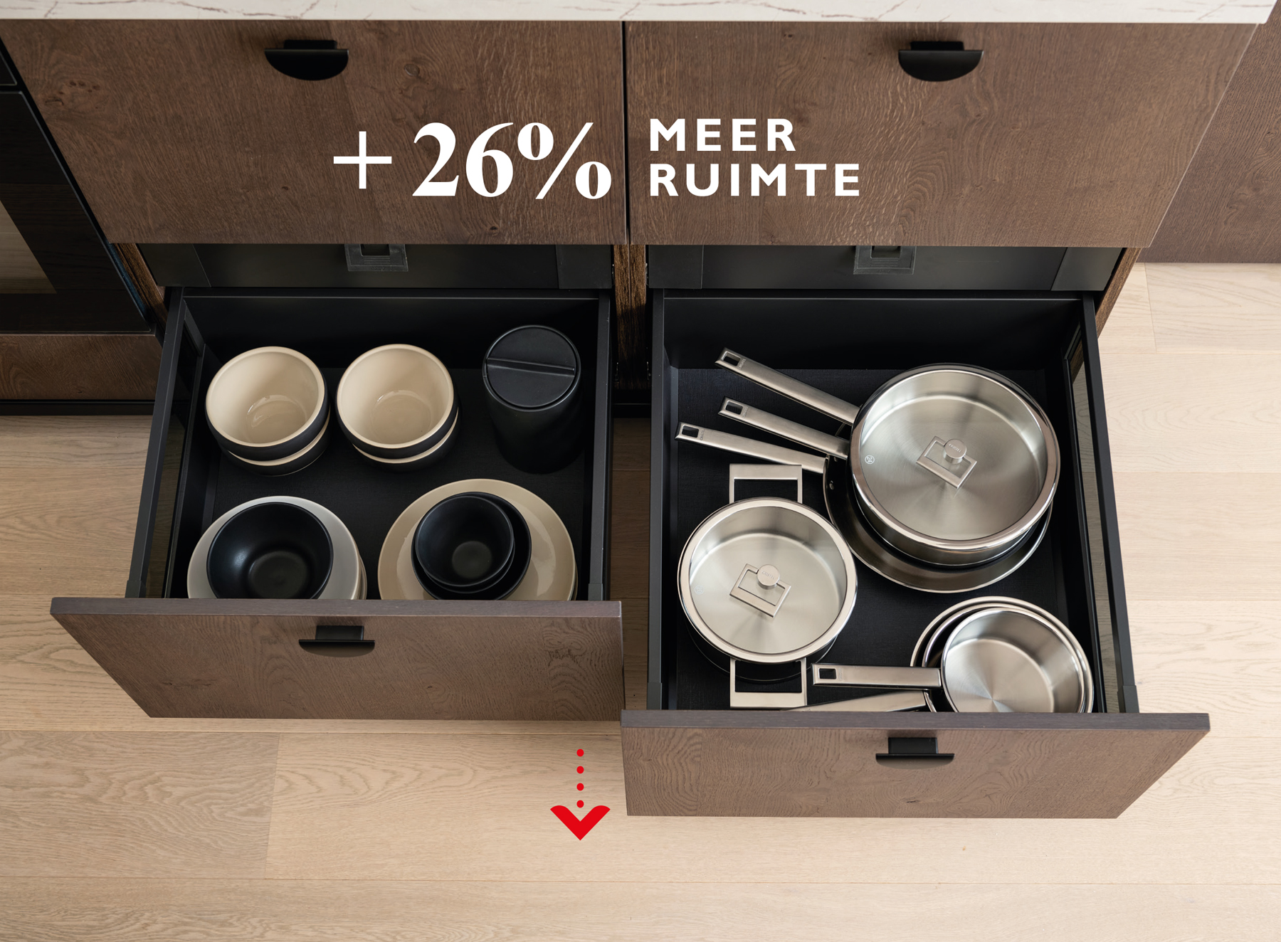 Met de diepte van 62,5 cm geniet u van diepere lades waarin u veel pannen of 2 stapels borden achter elkaar kunt zetten, of waarin u logge toestellen kwijt kunt.