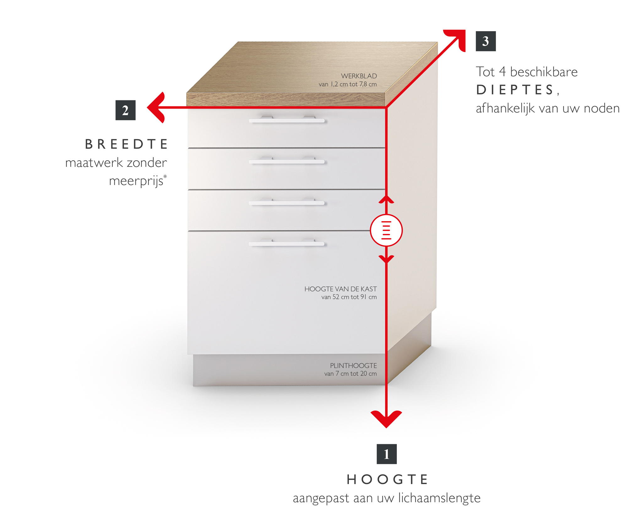 *Maximaal 3 meubels op maat per keuken, zonder prijstoelage, te kiezen uit een collectie van meubels op maat behalve de afwerking Sign en Twin, de assortimenten Lagune en Crystal, en de assortimenten in hout en MDF met kader.