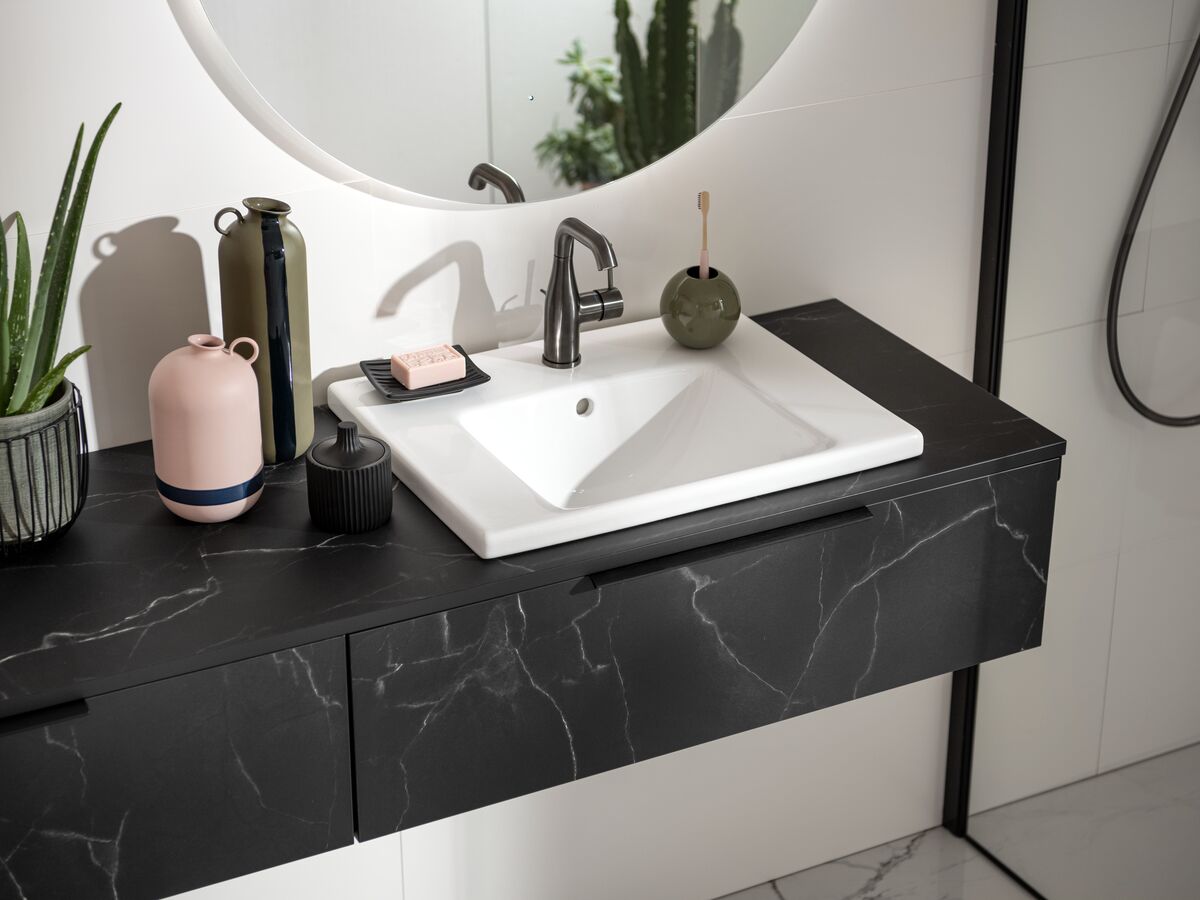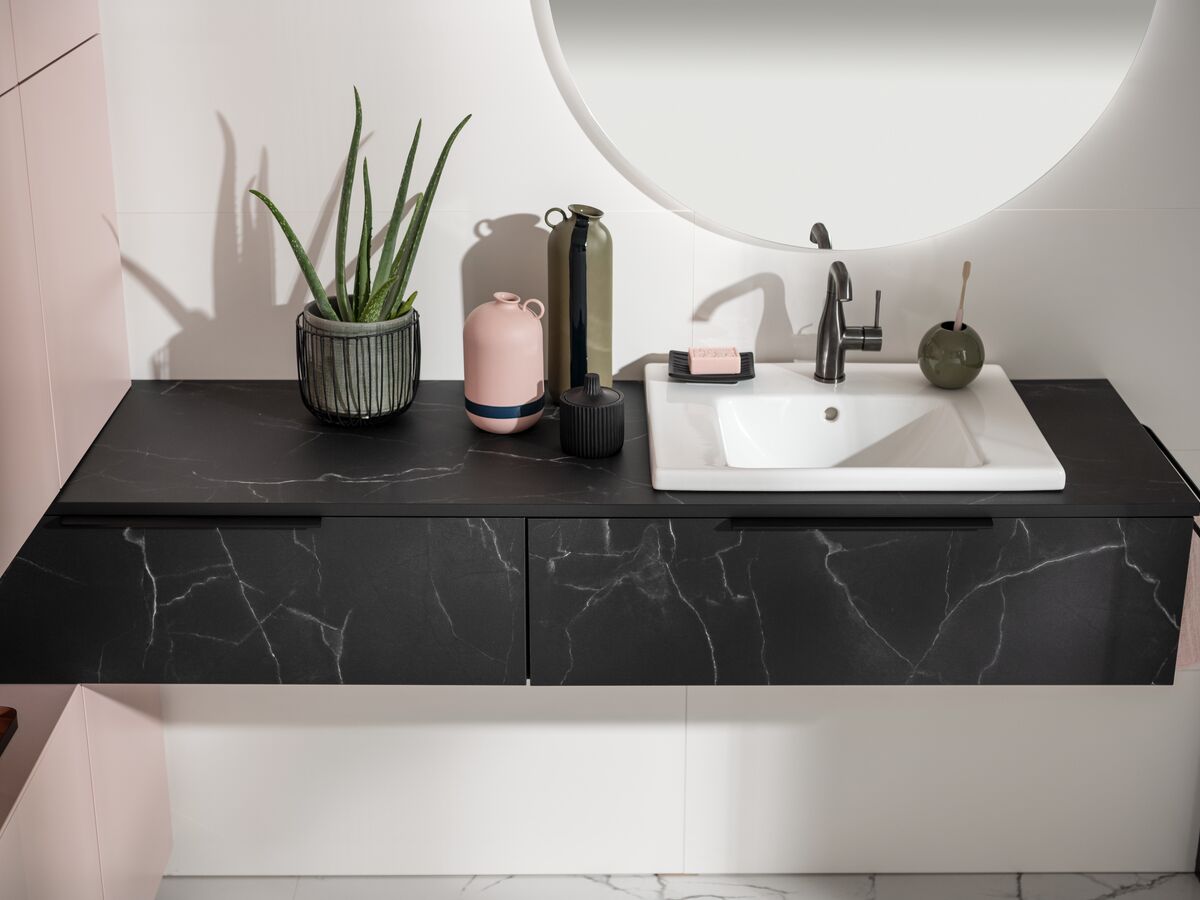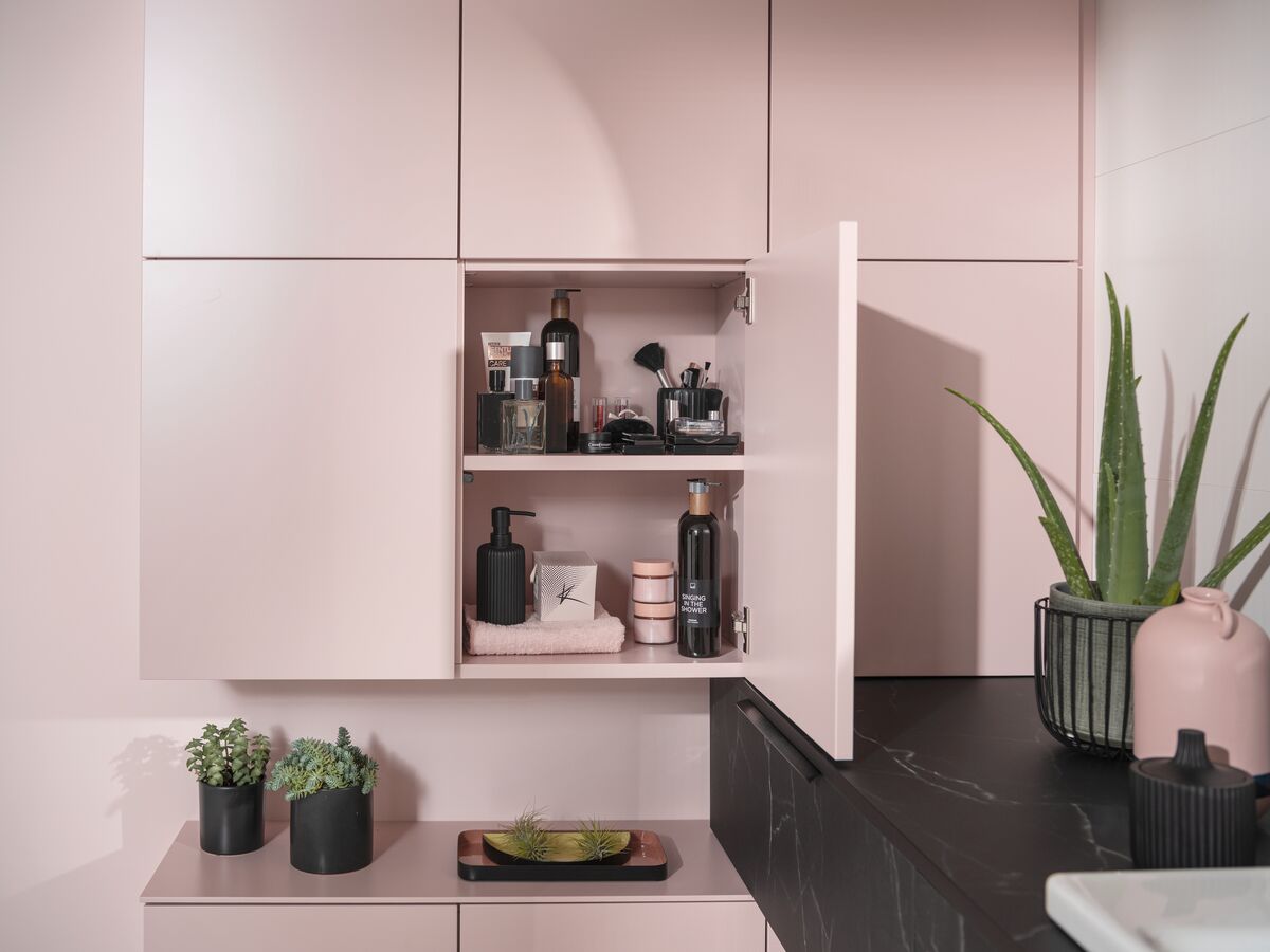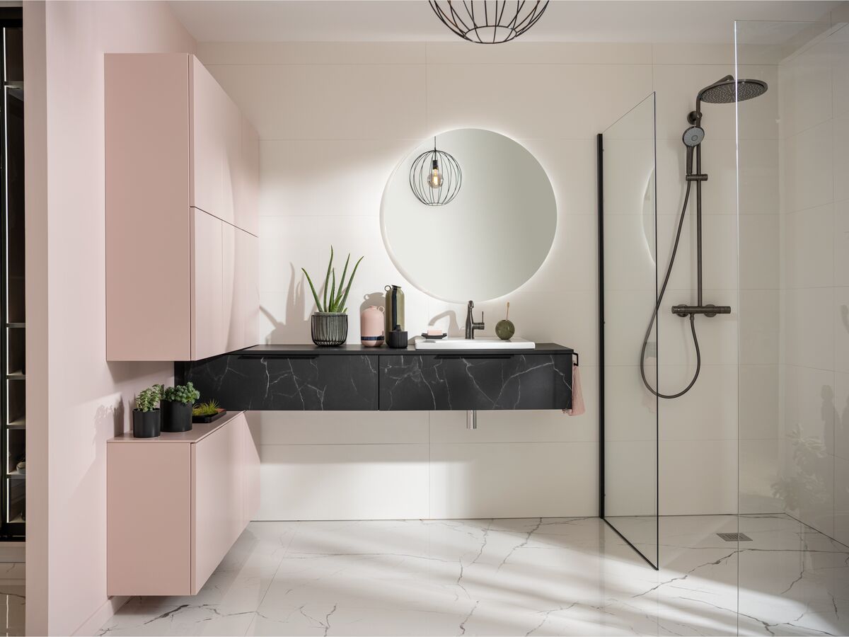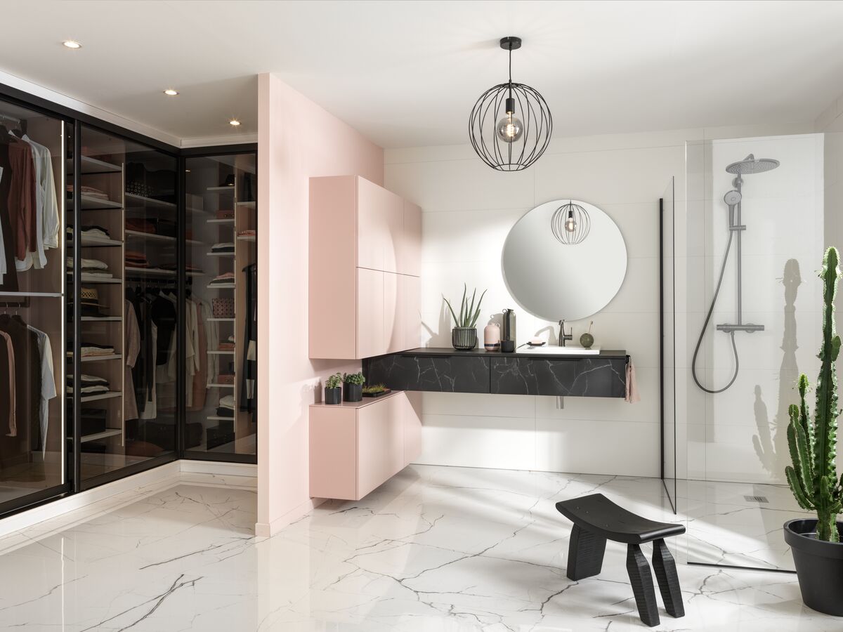 De subtiele melange van zwart en kleur... daar zijn Dennis en Valentine voor gevallen bij het zien van deze sobere en elegante badkamer. De combinatie van het geraffineerde zwarte marmer met de zachtroze kleur geeft hun badkamer een onvergelijkbare uitstraling. En dat is waar deze veertigers, ouders van twee kinderen en dol op mooie dingen, zo zeer van houden! Het stijlvolle en eigentijdse model van de ingebouwde kledingkast valt ook volledig in de smaak van Mevrouw en past goed bij de decoratiestijl waar ze van houdt.
