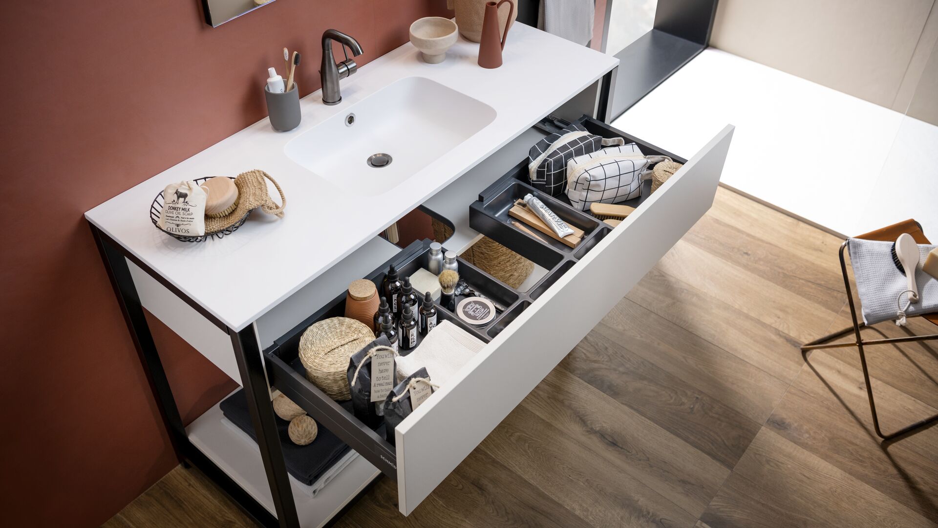 Intelligente opbergruimte en praktische accessoires: geniet van componenten die perfect in uw meubels worden geïntegreerd. Of het nu gaat om verborgen wasmanden of in het wastafelblad geïntegreerde handdoekhouders, alles is binnen handbereik.