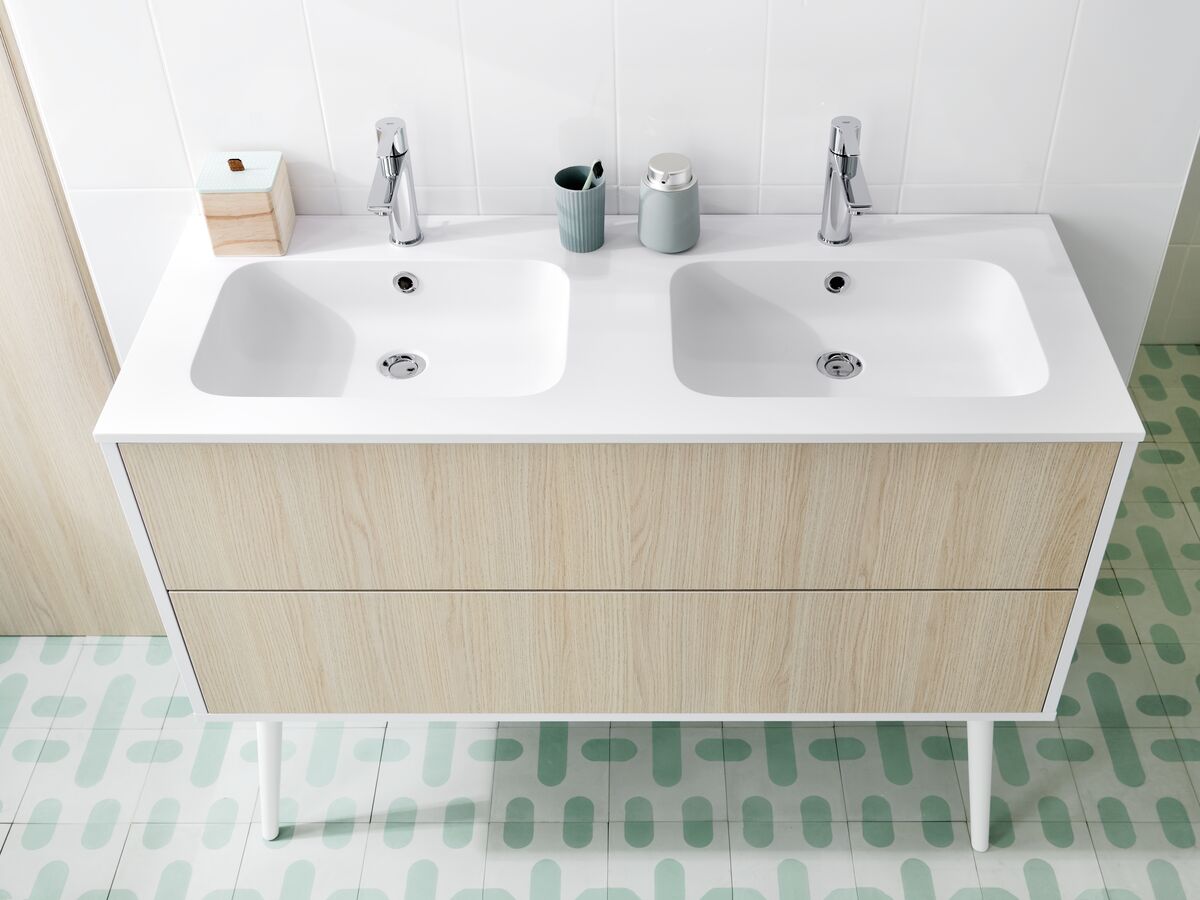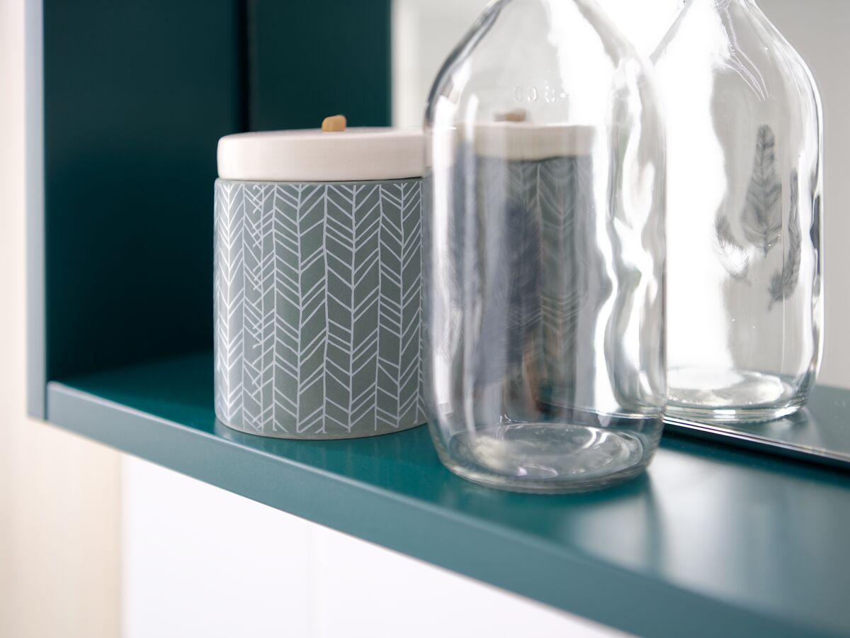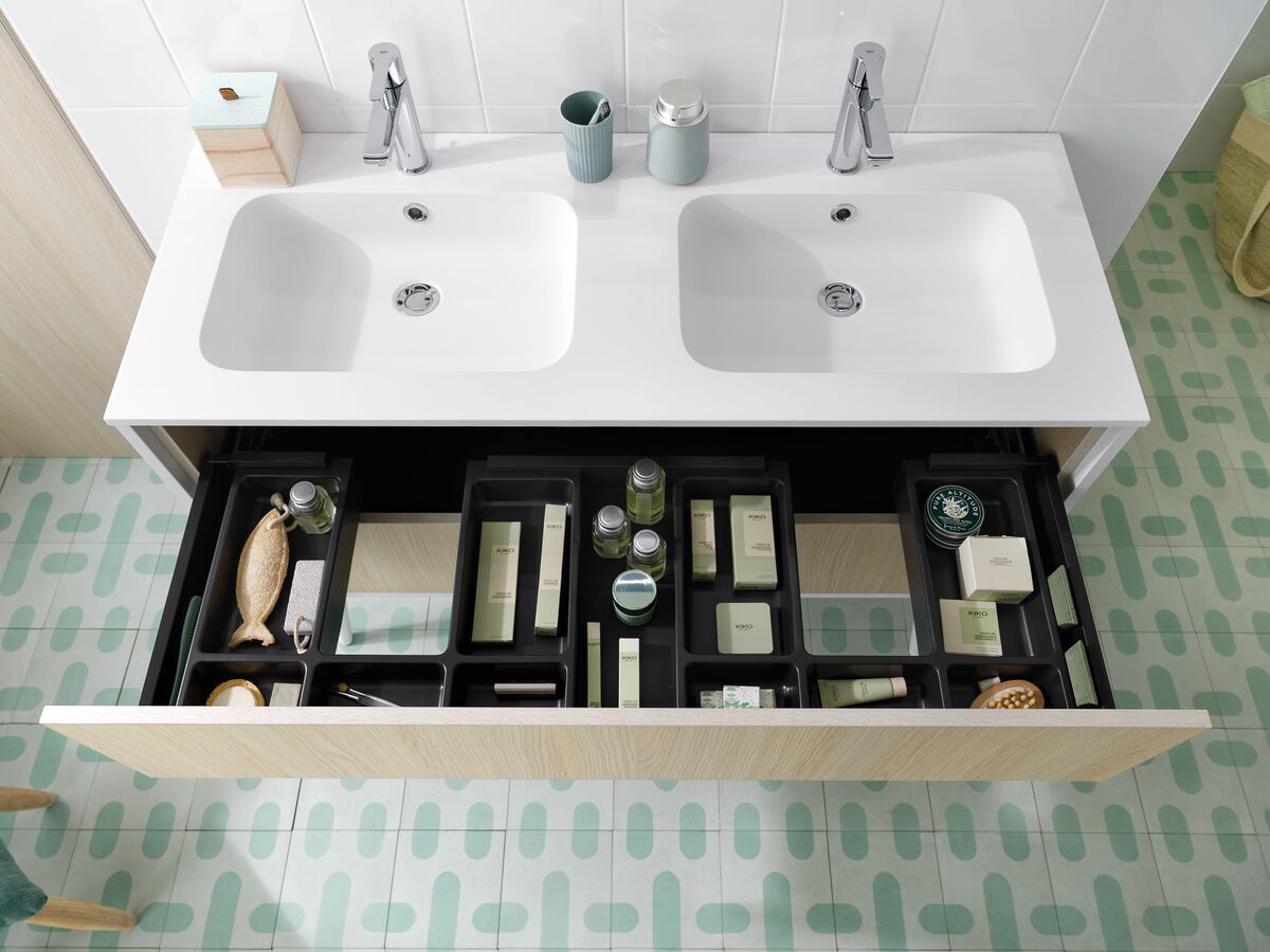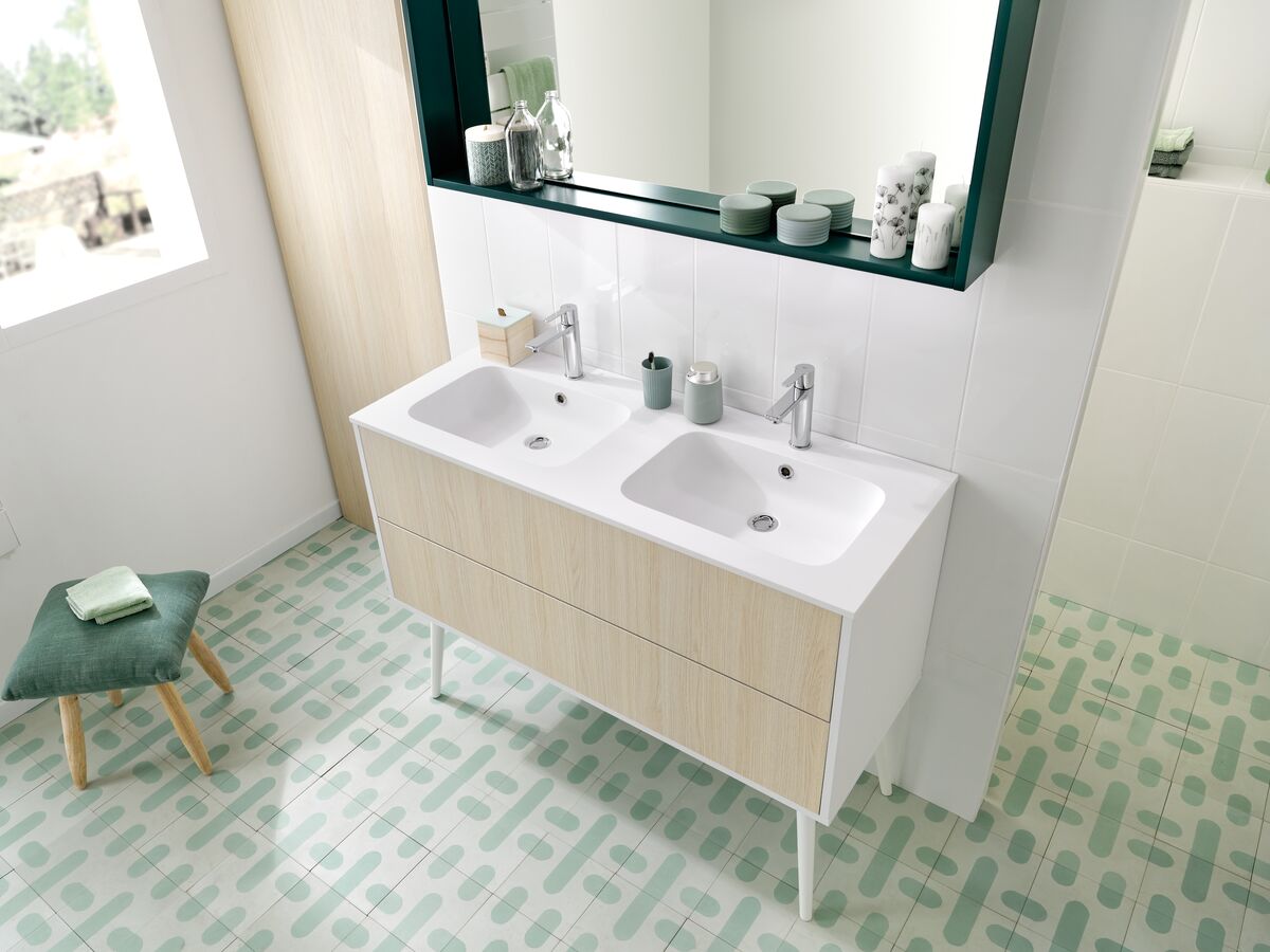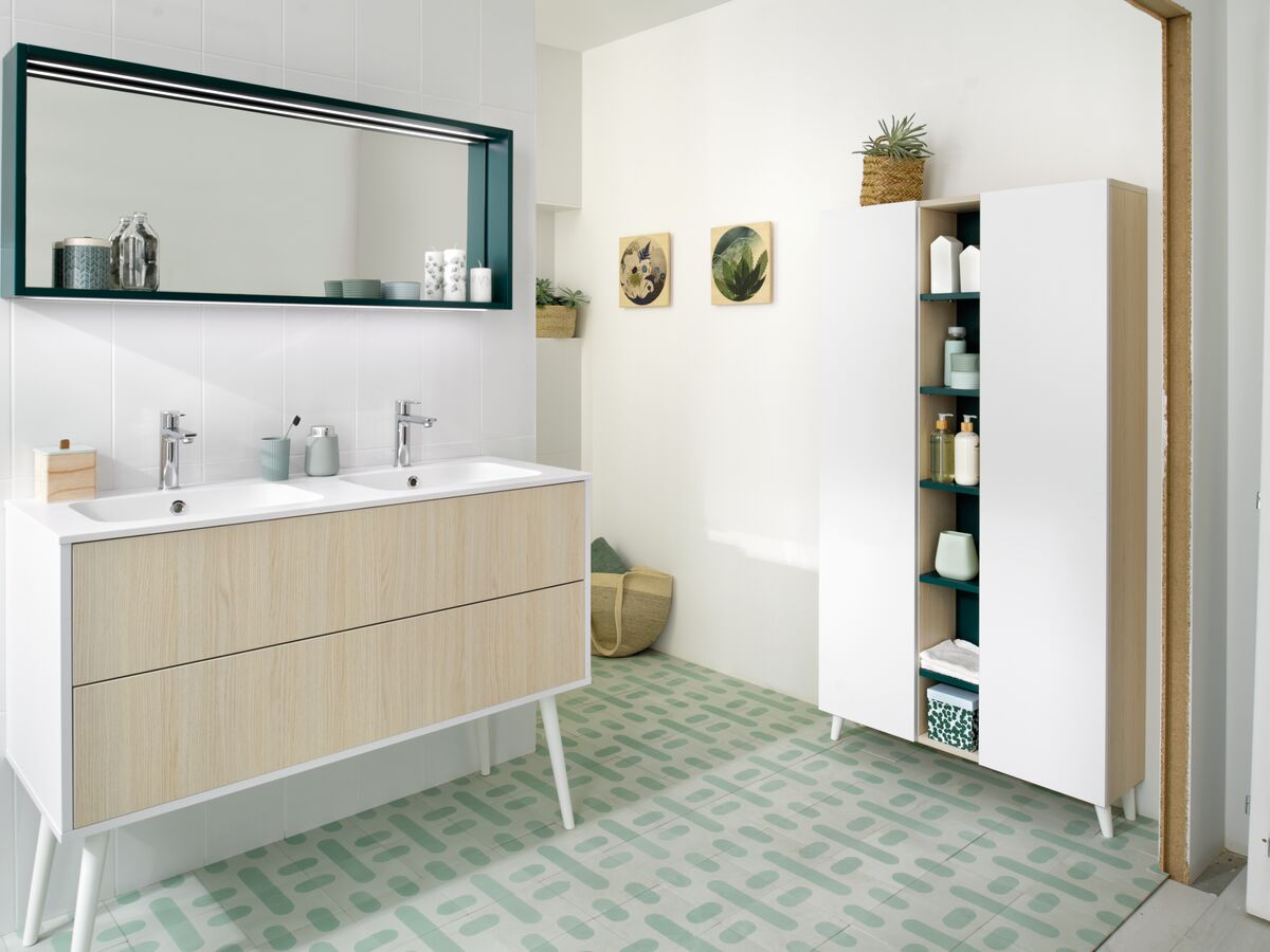 Wat een stijl, deze badkamer met vintage look! De Tubo-poten drukken hun stempel op het meubel met wastafel, omkaderd door een bekleding die past bij het wastafelblad, symbool voor een hele eeuw in een modern jasje. Het ontbreekt Fien nooit aan inspiratie. Ze koos voor een spiegel in een decoratieve lijst, uitgerust met een ledrail. De tip van Schmidt? Een hoog doorlopende deur om de wasmachine en de schappen voor het wasgoed te verbergen. Meesterlijk op maat!