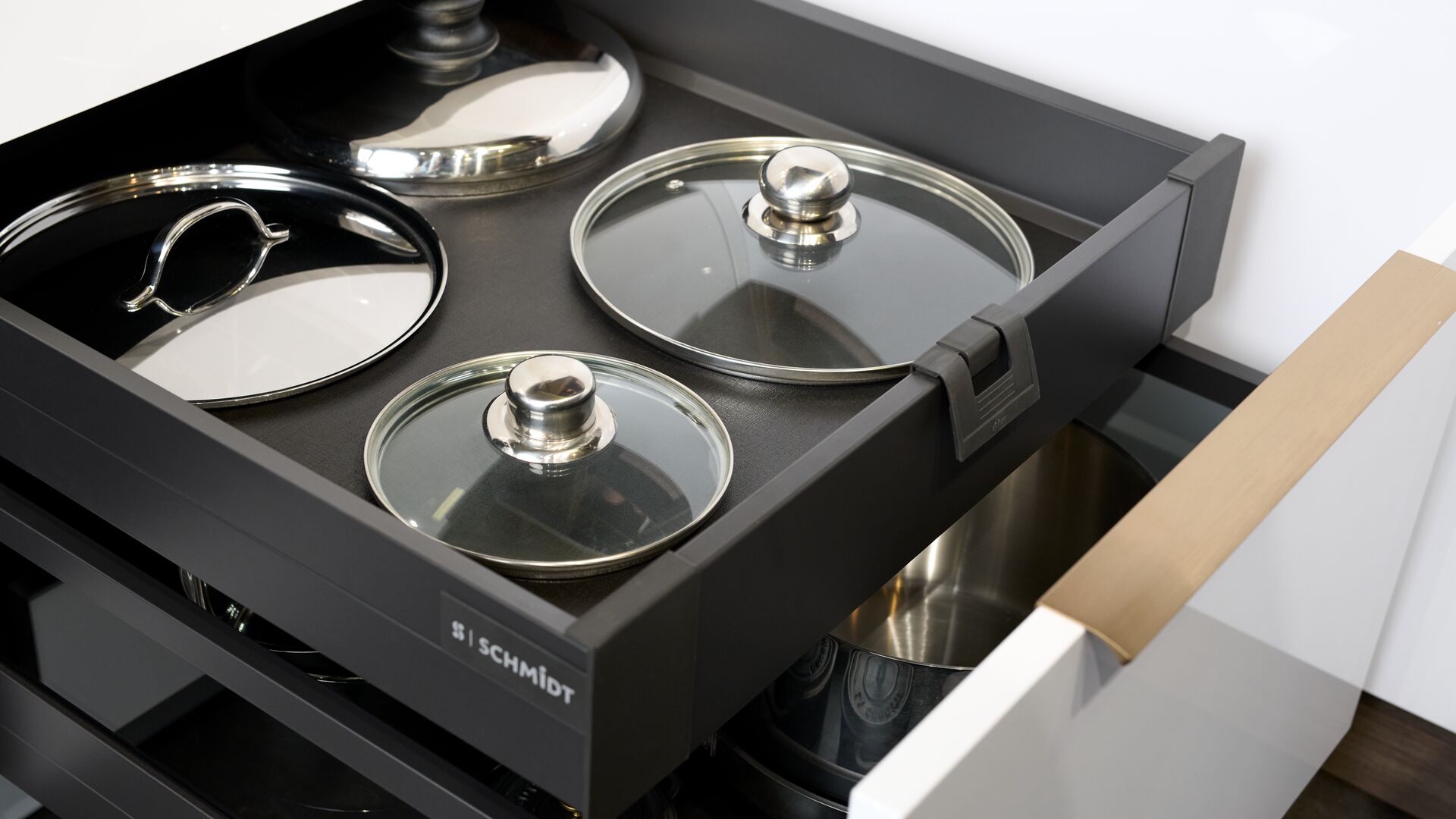 Berg al uw accessoires en keukengerei handig op dankzij de Engelse laden van Schmidt. De deksels van uw kookpotten kunnen bijvoorbeeld in een aparte lade. Handig voor al dat keukengerei dat altijd op de verkeerde plek ligt!