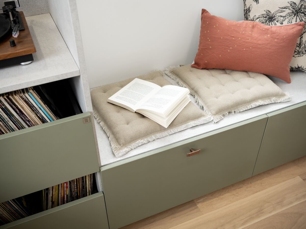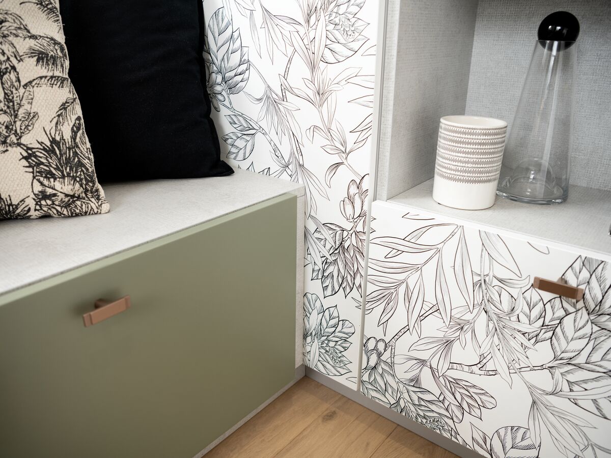 Bij het inrichten van hun interieur wilde het stel veertigers een ruimte creëren met een bureau en boekenkast, gescheiden van de keuken en woonkamer. De collectie “Botanic Print” viel bij hen bijzonder in de smaak vanwege de modulariteit en de mogelijkheid om een wand te creëren. De boekenkast met open gedeeltes bakent de verschillende leefruimtes goed af. Daarbij beschikt meneer over voldoende ruimte om zijn boeken op te bergen en is er plek om verhalen voor te lezen aan zijn zoontje waarbij plaats kan worden genomen op de bank. De werkhoek moest designvol en functioneel zijn. Met het meubel met wieltjes en de goed uitgedachte verlichting is de opdracht absoluut geslaagd!