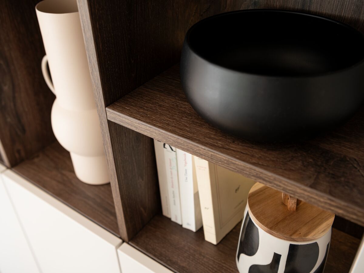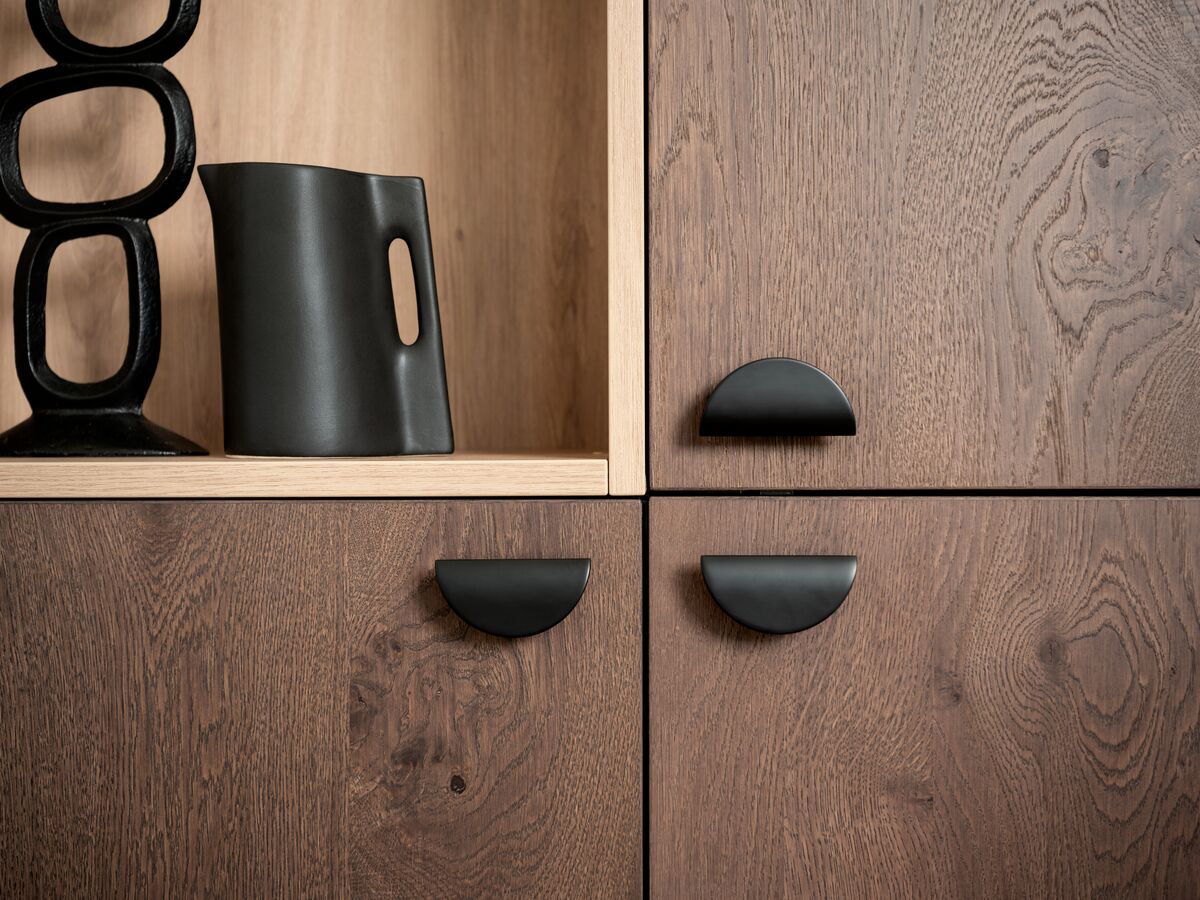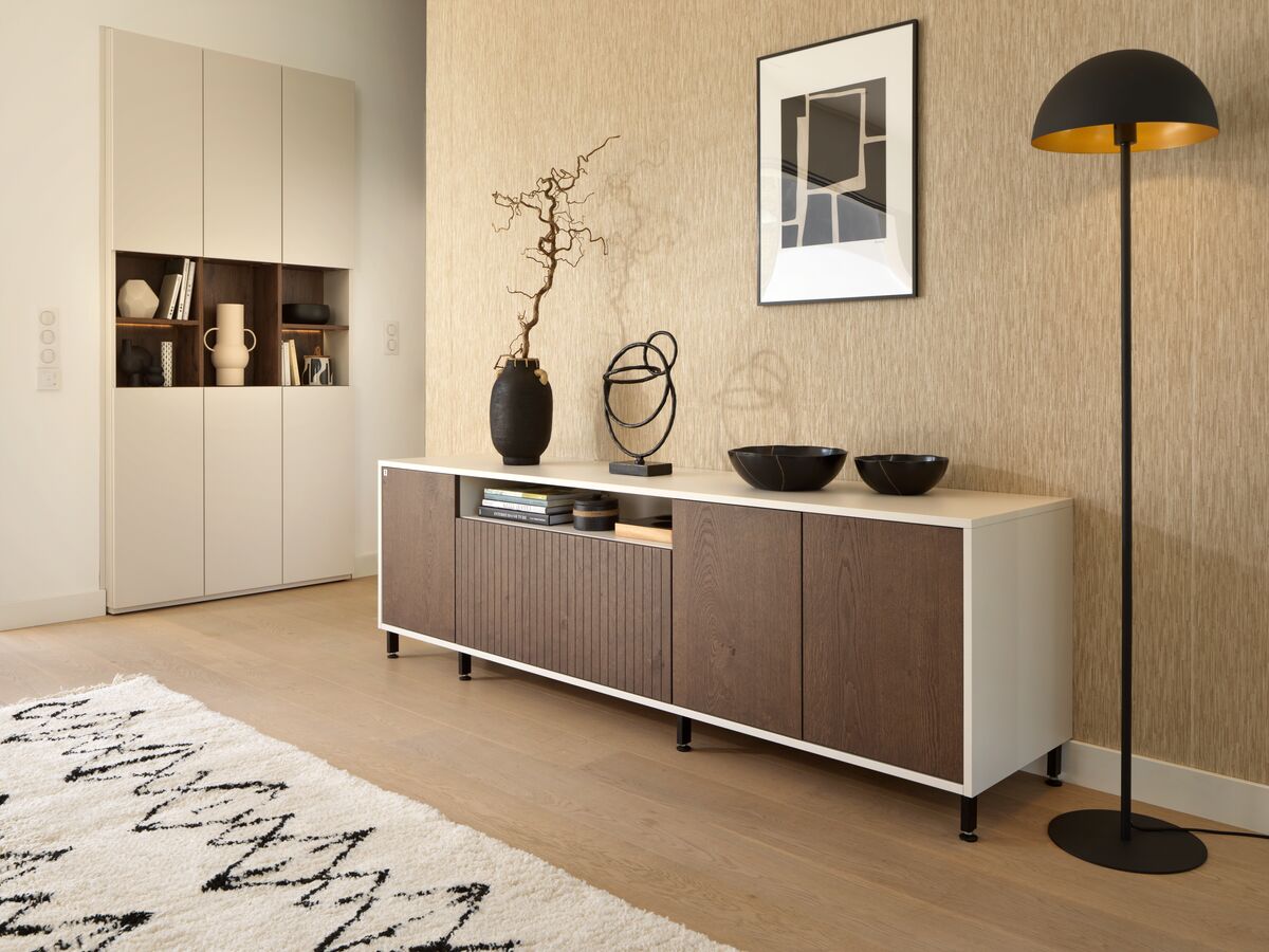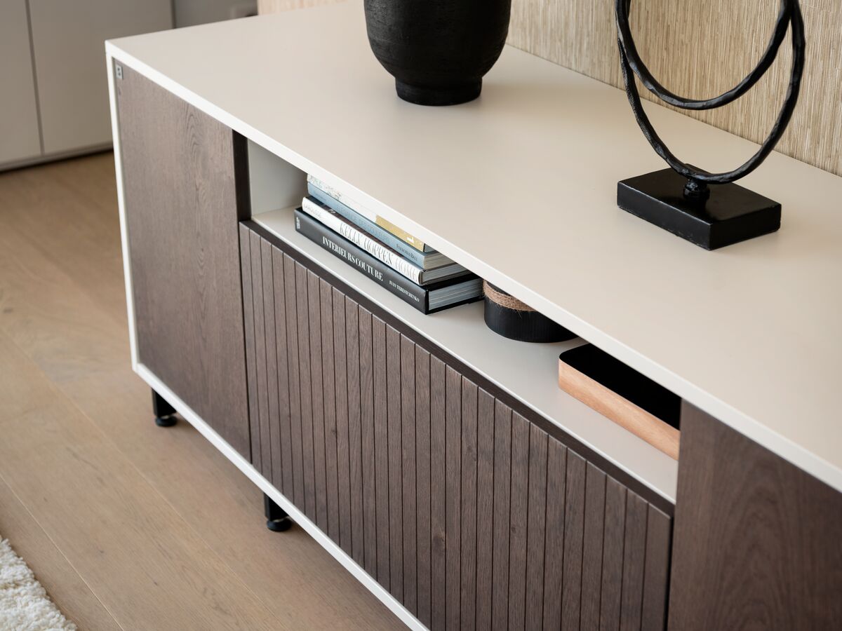 Om hun woonkamer aan te kleden, is het stel vijftigers gevallen voor deze lage buffetkast. Dit meubel hoort bij hetzelfde gamma als hun open keuken en is een absolute elegante decoratieve aanwinst voor hun grote livingroom. Hij creëert op een harmonieuze wijze een overgang tussen twee verschillende ruimtes. Dit lage designvolle en strakke meubel biedt aanvullende opbergruimte waar het stel naarstig naar op zoek was. Het kleine pluspunt: een bijpassende wandnis en/of vierkant entreekastje zijn tevens verkrijgbaar.