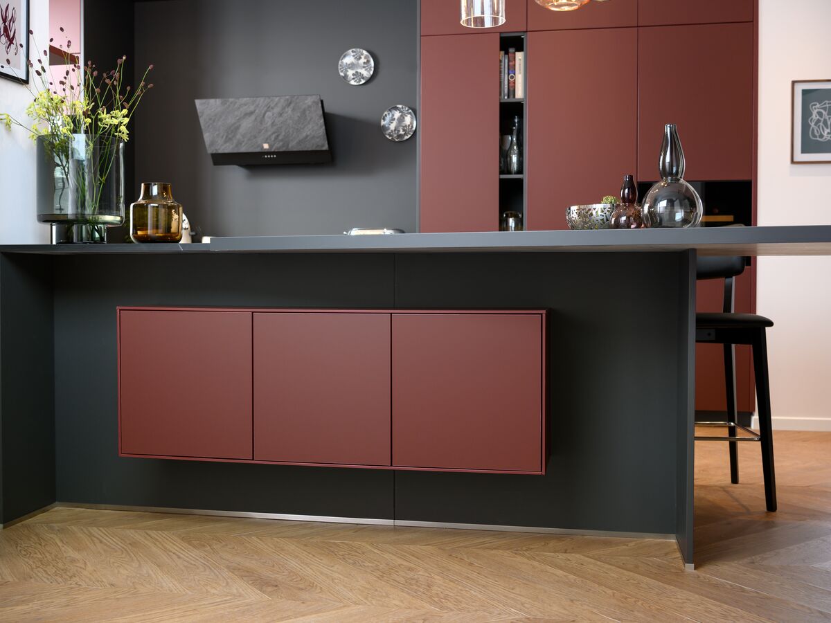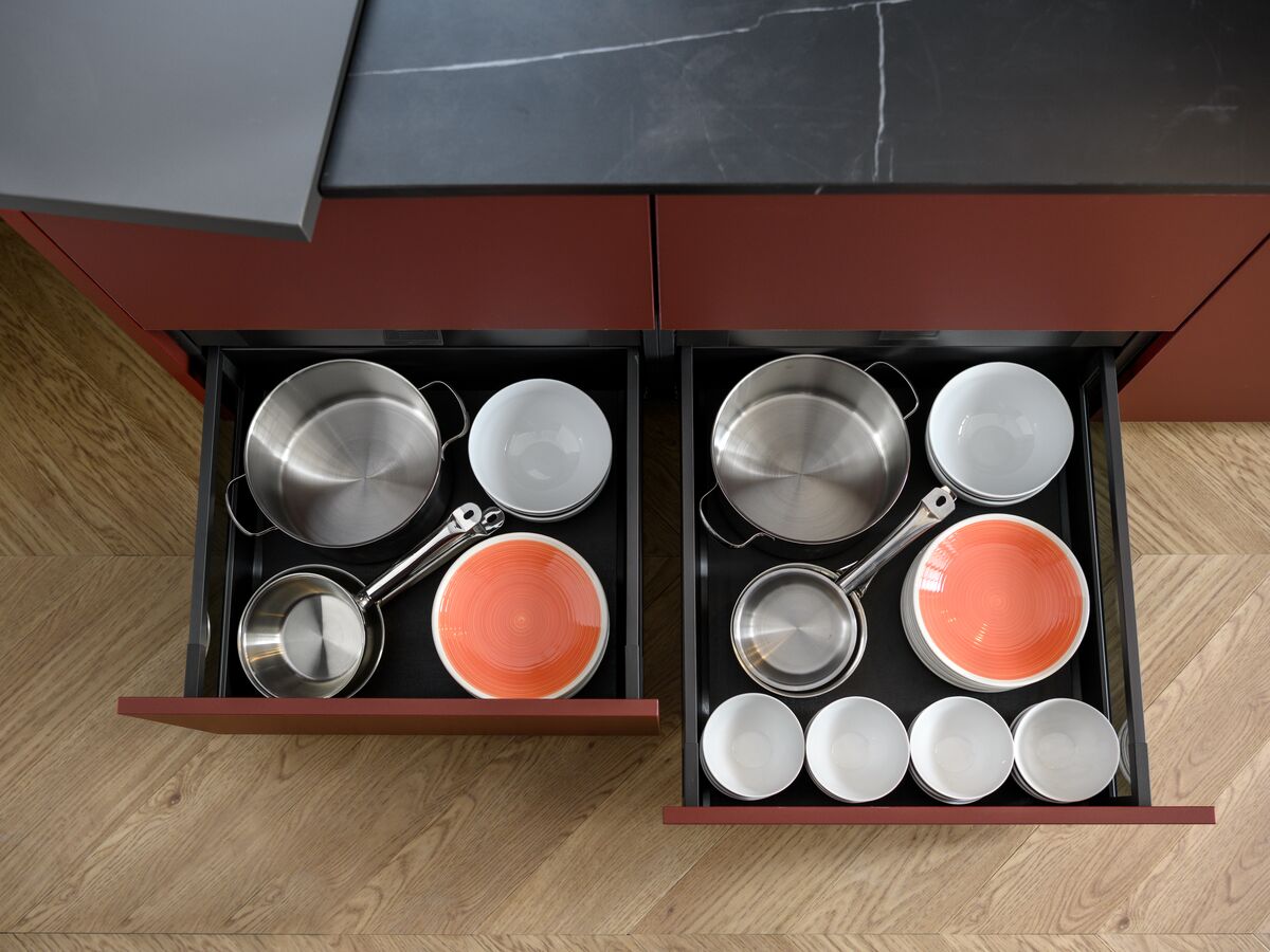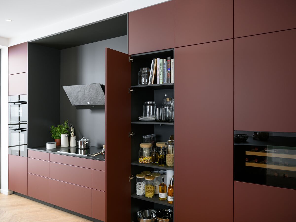 Een genot voor ogen … en smaakpapillen! Dat is de belofte van deze rode keuken in Italiaanse stijl (kleur Sirra) die in verbindimg staat met de woonkamer. De strakke lijnen van de zwarte eettafel (kleur Caneo) in het verlengde van het keukeneiland geven de hele ruimte een grafische geometrie. Denis en Valentina kunnen al niet meer zonder de vele, extra diepe opbergmeubels. Daardoor ziet de keuken er nooit rommelig en vol uit! Het resultaat: een lange keuken met een optimaal benut keukeneiland, waarin uw beste gerechten hemels smaken!