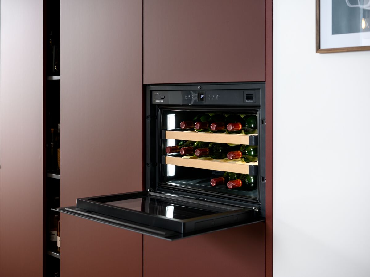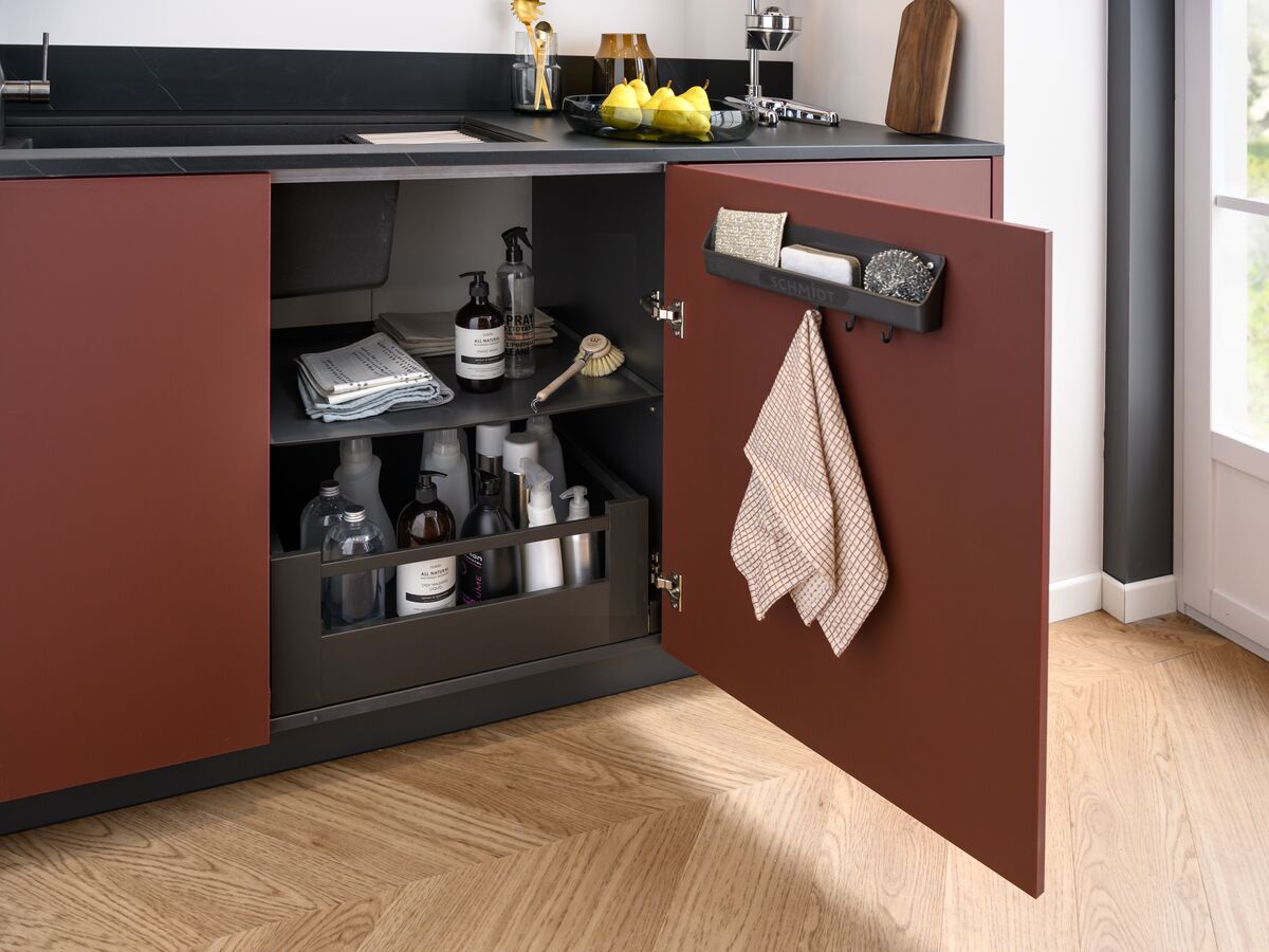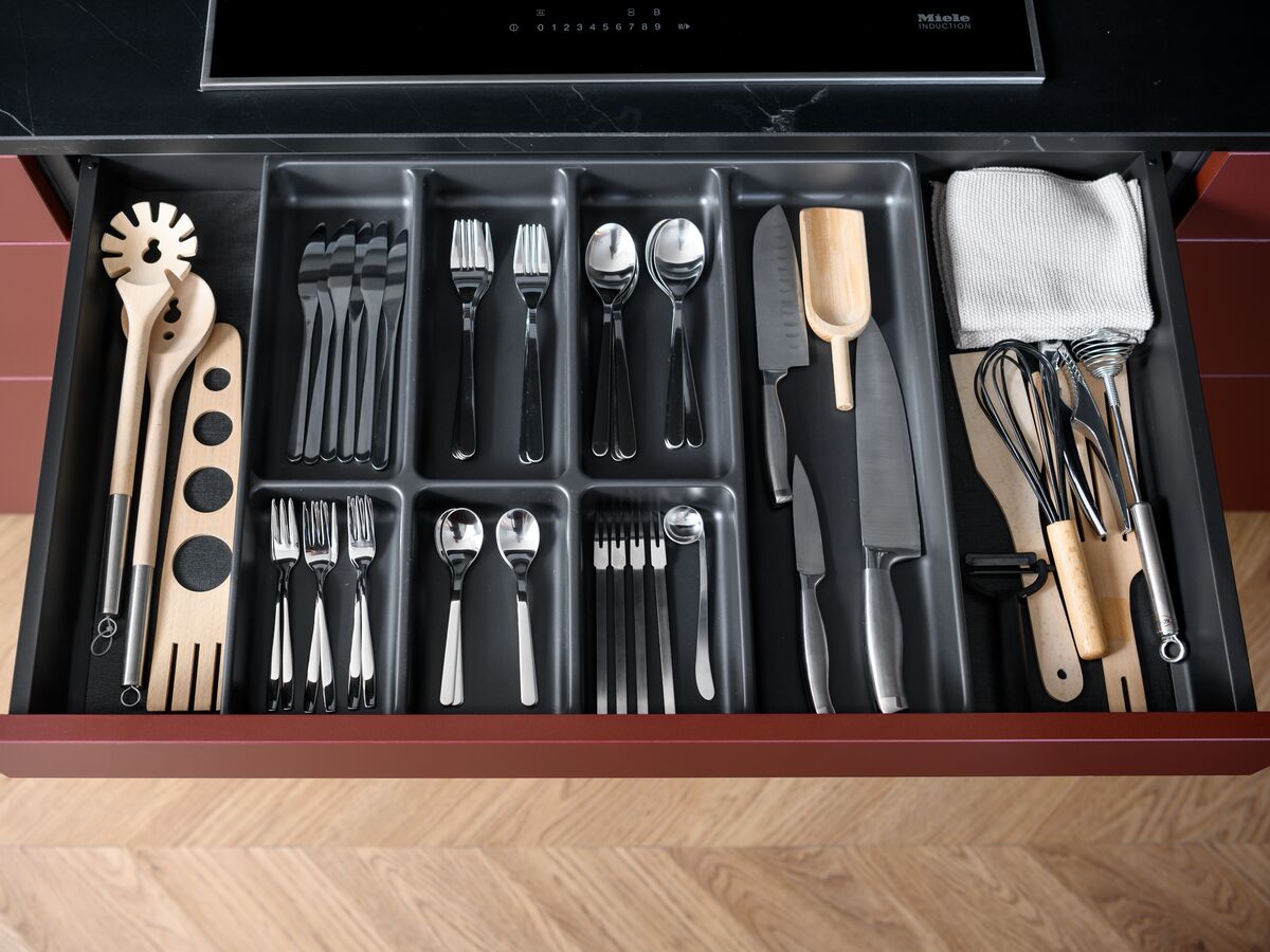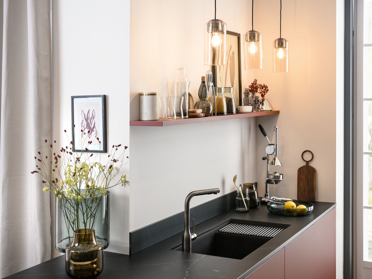 Een genot voor ogen … en smaakpapillen! Dat is de belofte van deze rode keuken in Italiaanse stijl (kleur Sirra) die in verbindimg staat met de woonkamer. De strakke lijnen van de zwarte eettafel (kleur Caneo) in het verlengde van het keukeneiland geven de hele ruimte een grafische geometrie. Denis en Valentina kunnen al niet meer zonder de vele, extra diepe opbergmeubels. Daardoor ziet de keuken er nooit rommelig en vol uit! Het resultaat: een lange keuken met een optimaal benut keukeneiland, waarin uw beste gerechten hemels smaken!