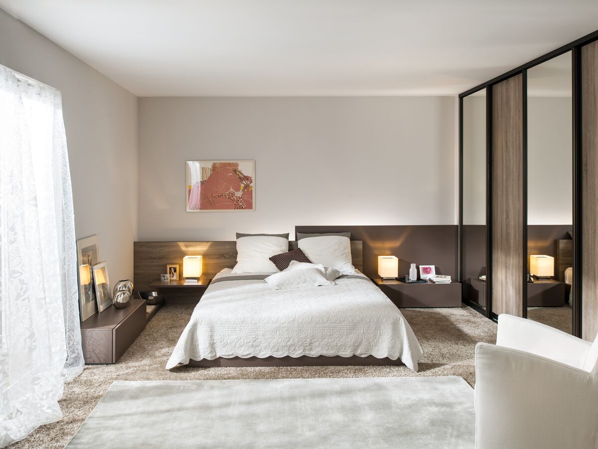 Welkom in uw nieuwe cocon, waar alles warm, praktisch en ordelijk is - zoals de nachtkastjes met openklapbare fronten en de grote bijpassende dressing op maat. Wanneer u ze met één vinger opent, toont een zachte maar precieze verlichting wat ze te bieden hebben: gepersonaliseerde laden en ladeblokken met een discrete elegantie op alle niveaus.