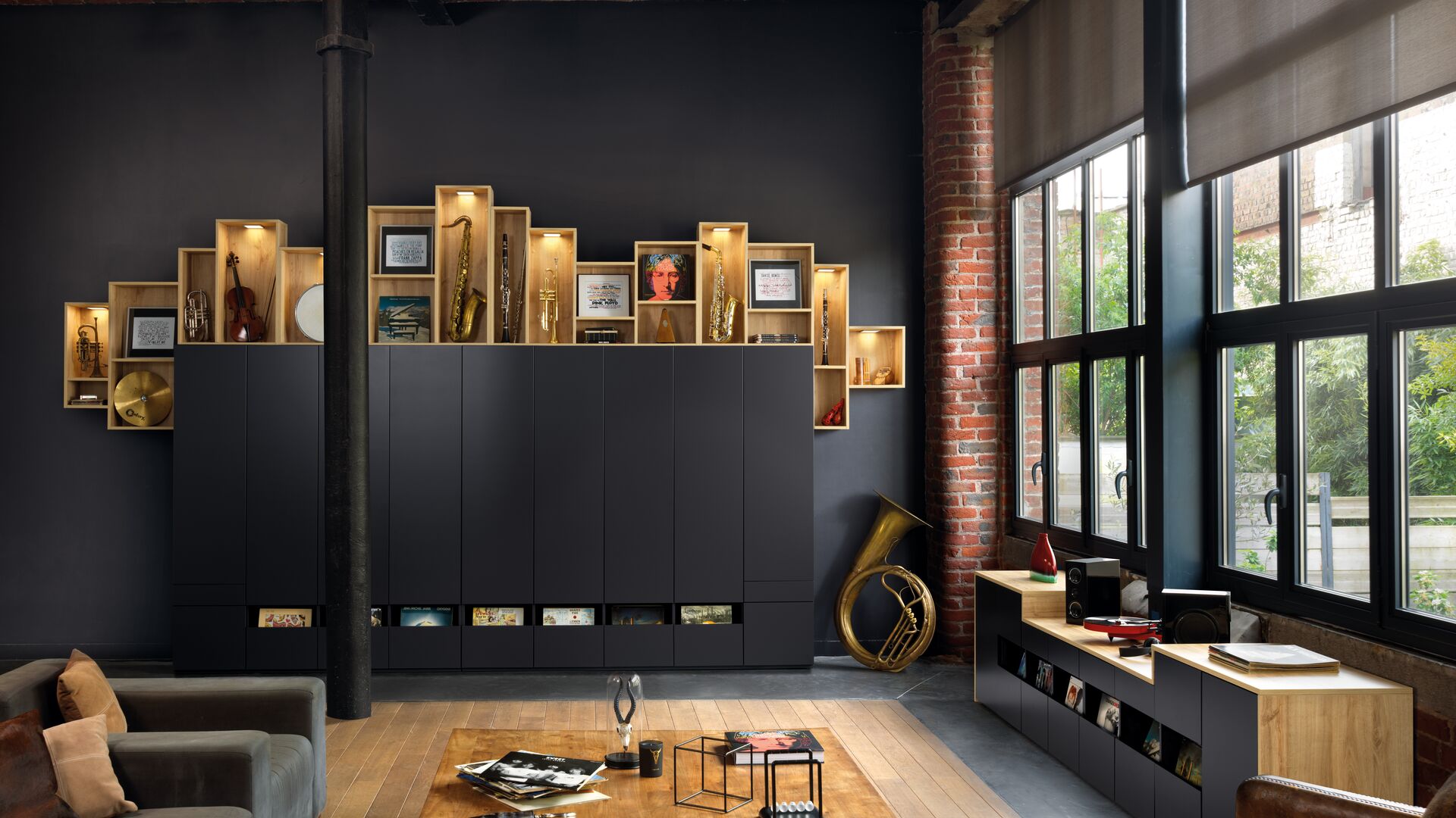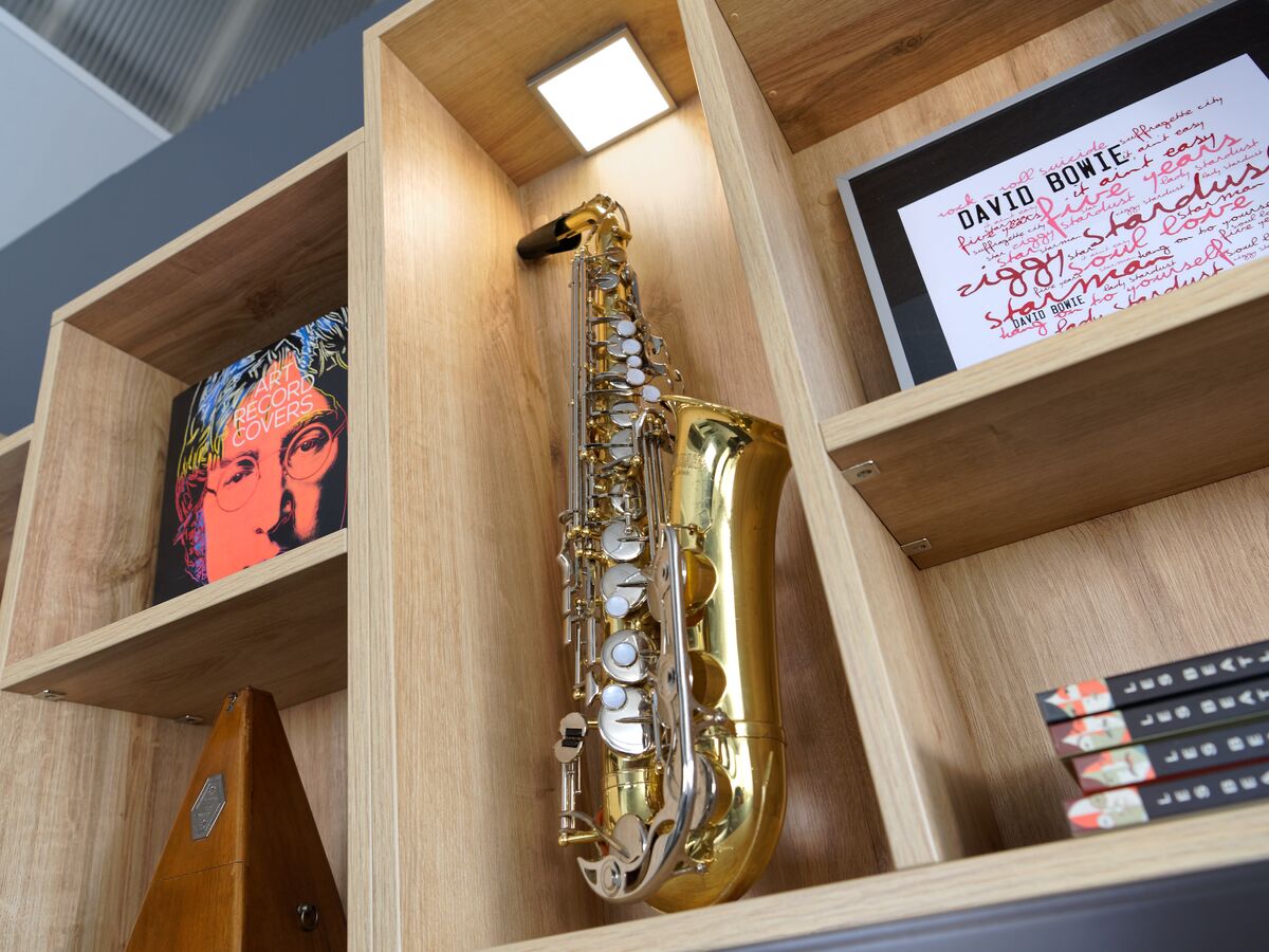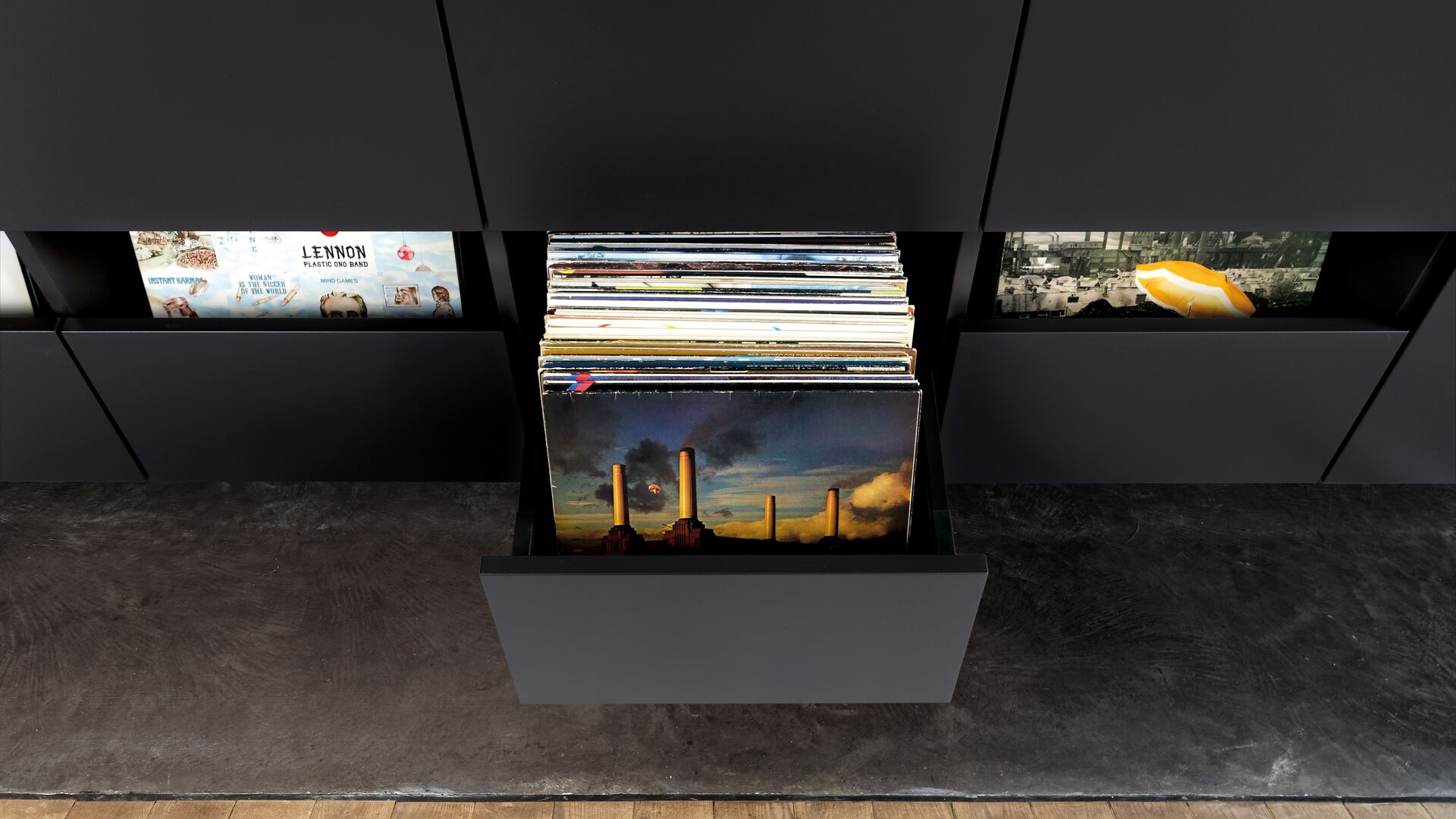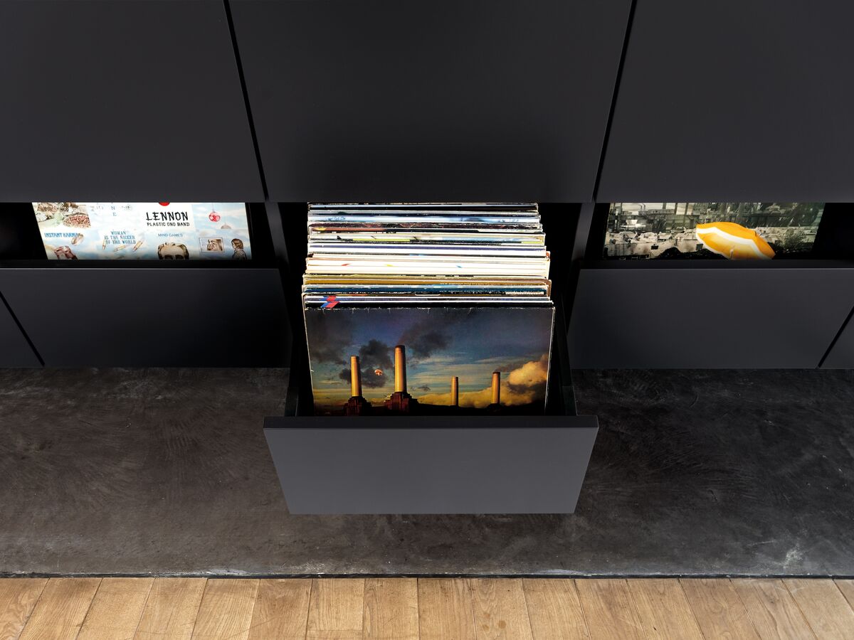 Alex is dol op zijn grote glazen atelier! Hij plaatste er zijn buffetkast, die tot op de millimeter werd ontworpen om er perfect in te passen. Zijn allereerste lp van James Brown staat er minzaam naast de gesigneerde plaat van Amy Winehouse. Toppunt van luxe is dat het niet nodig is om de schuiffronten te openen, ook al lukt dat perfect met één vinger. Ze tonen net genoeg van de hoezen om snel de juiste te kunnen vinden, net als het gesigneerde exemplaar van Amy: “Aan Alex, voor altijd, Amy".