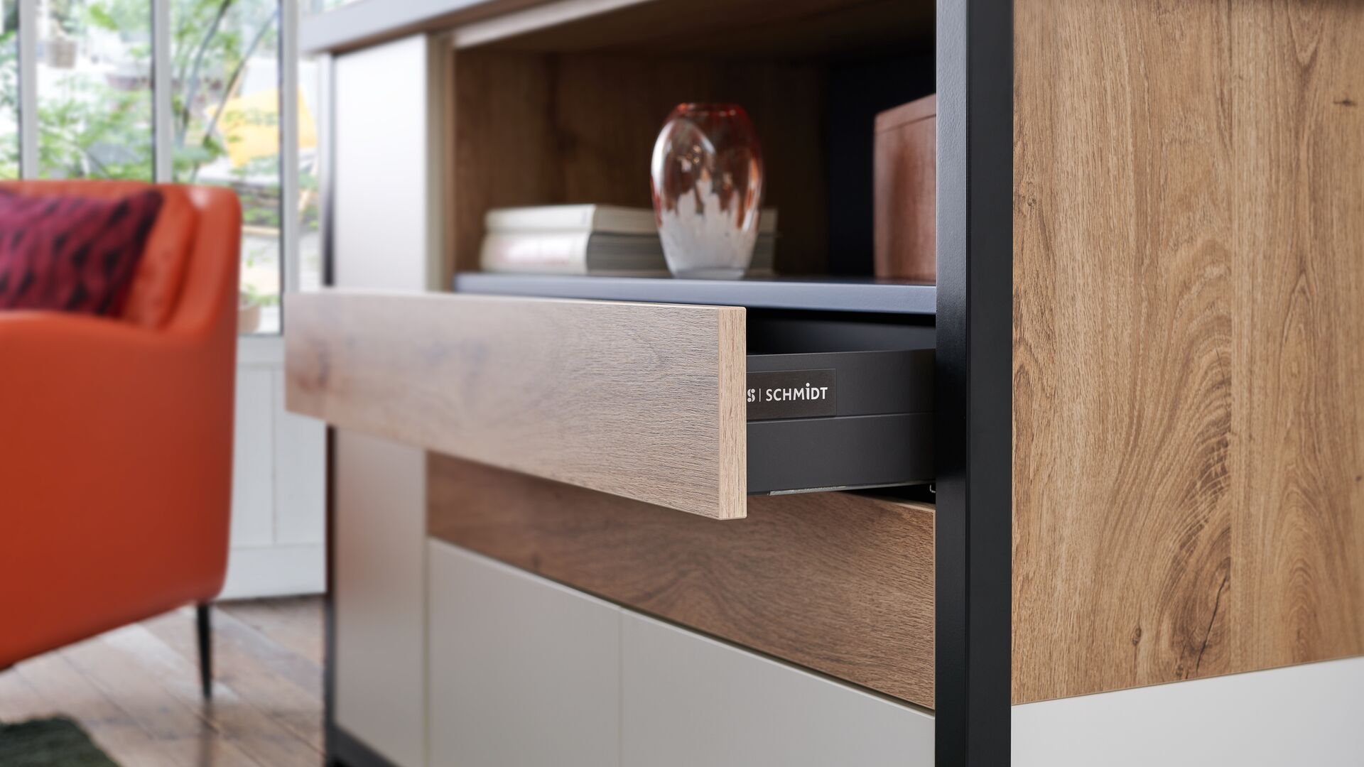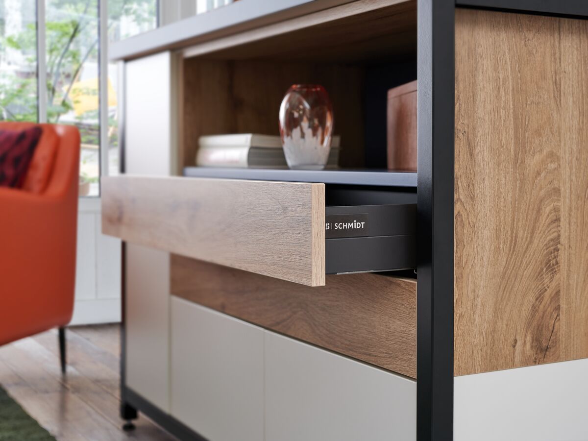 Om invulling te geven aan hun grote woonkamer waren Myrella en Bastiaan op zoek naar een moderne buffetkast die bij de industriële stijl van hun interieur paste. Dit meubel van metaal en hout dat een combinatie biedt van authenticiteit en moderniteit, was precies waar ze naar op zoek waren. Deze lage commode met een hoog compartiment voldoet niet alleen aan hun verwachtingen op esthetisch gebied, maar ook aan hun behoefte om opbergruimte te creëren. Daarbij moet gezegd worden dat dit stel met twee kinderen het zeer op prijs stelt om over lades en kasten te beschikken. Ze houden van het leven, maar willen het wel georganiseerd houden!