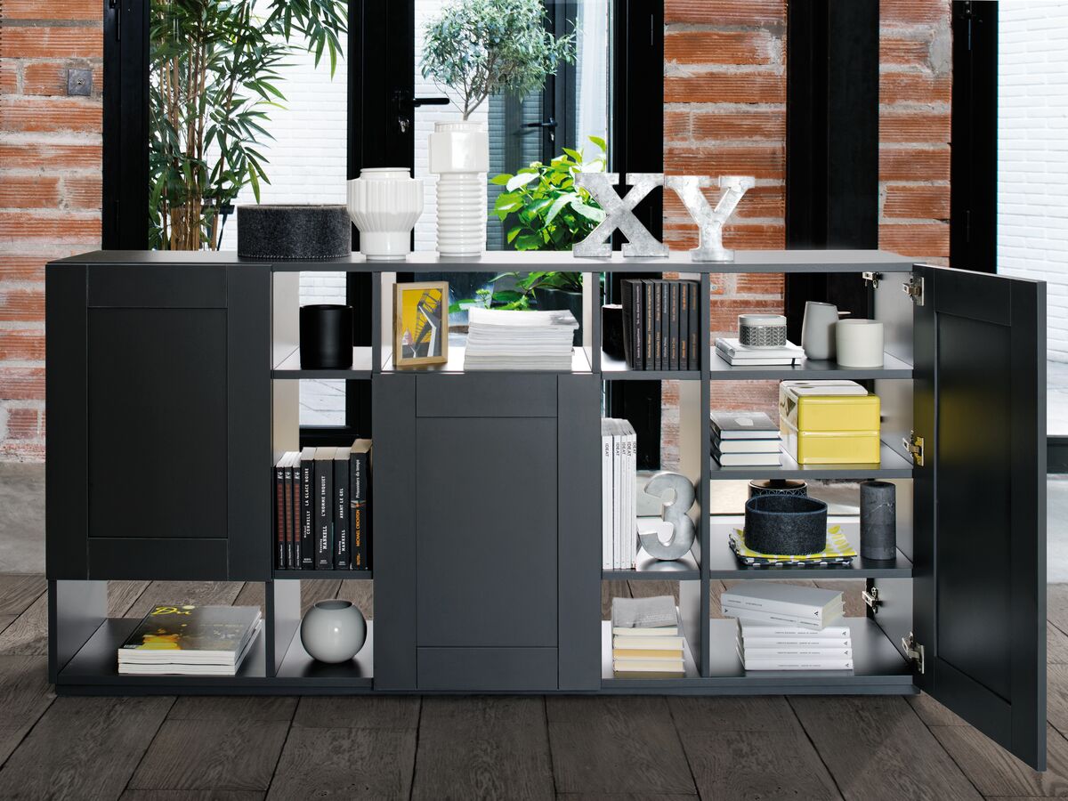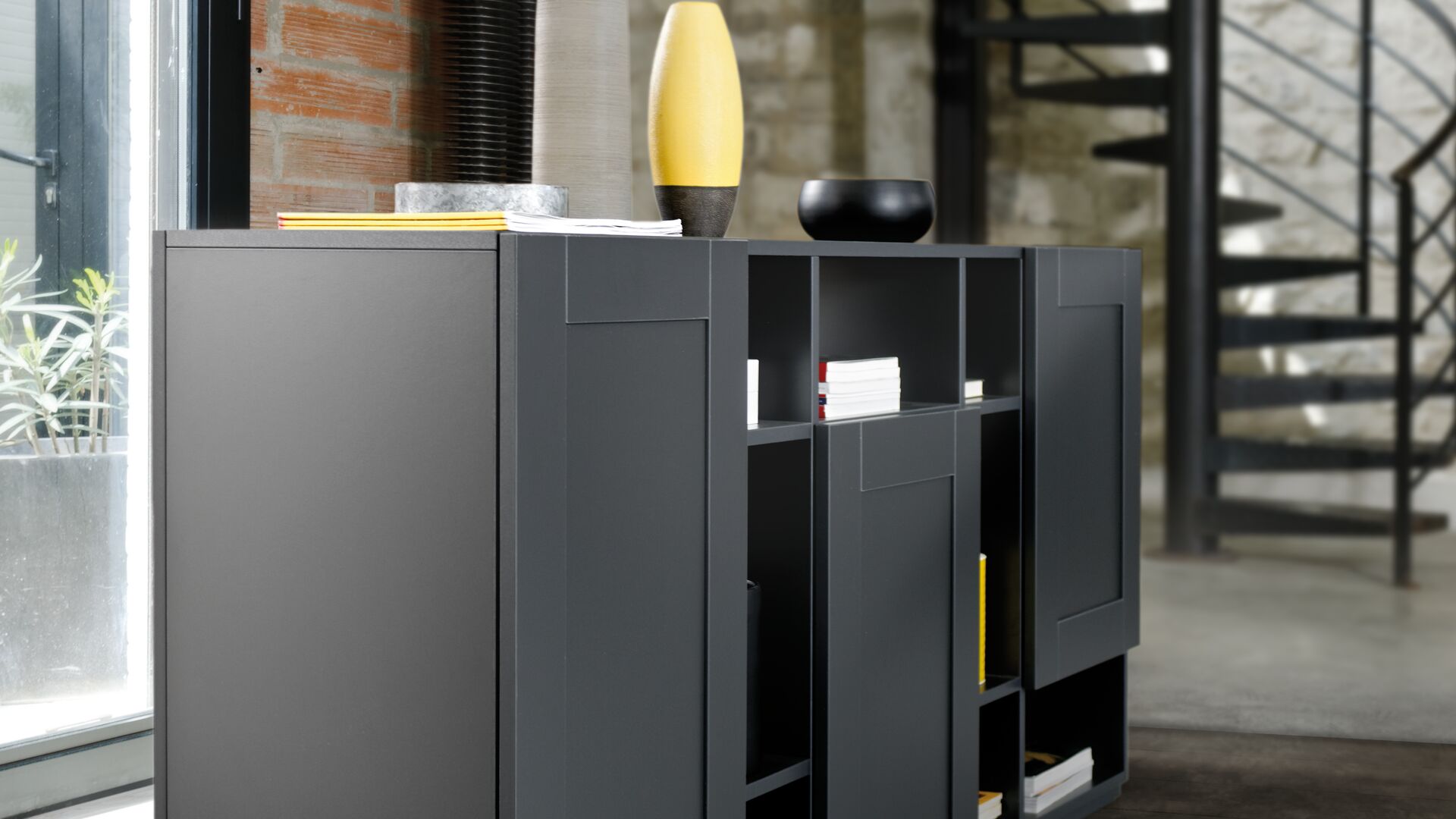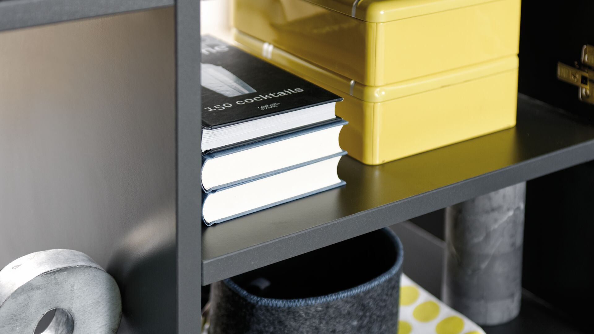 Wie zegt dat een boekenkast tegen de muur moet staan? Schmidt in elk geval niet: wat dacht u van een kookeiland in culturele toogstijl? De boekenkast is toegankelijk van twee kanten en is voorzien van open nissen voor boeken en snuisterijen en fronten zonder handgrepen voor een sublieme designafwerking.
