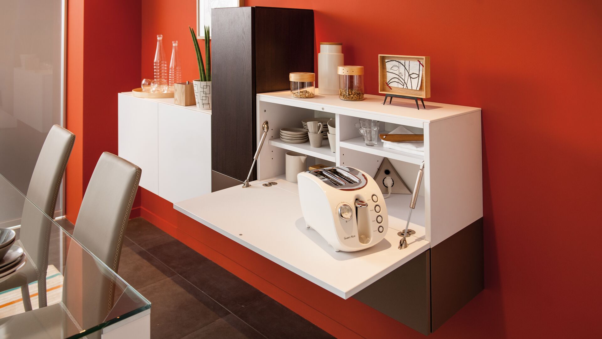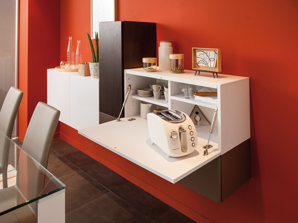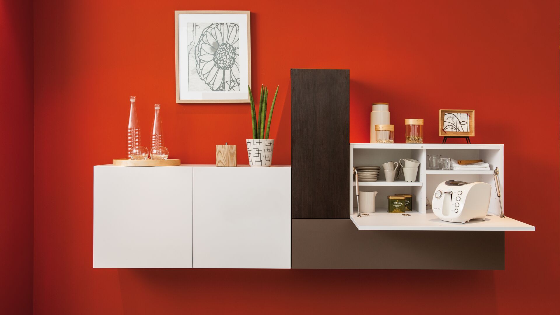 Aan ideeën geen gebrek! Dit opbergmeubel met mooie achtergrondkleur koppelt de fundamenten van design (kubistische, minimalistische vormen) aan de essentie van functionaliteit: fronten die openklappen en openschuiven om alles snel, goed en mooi op te bergen.