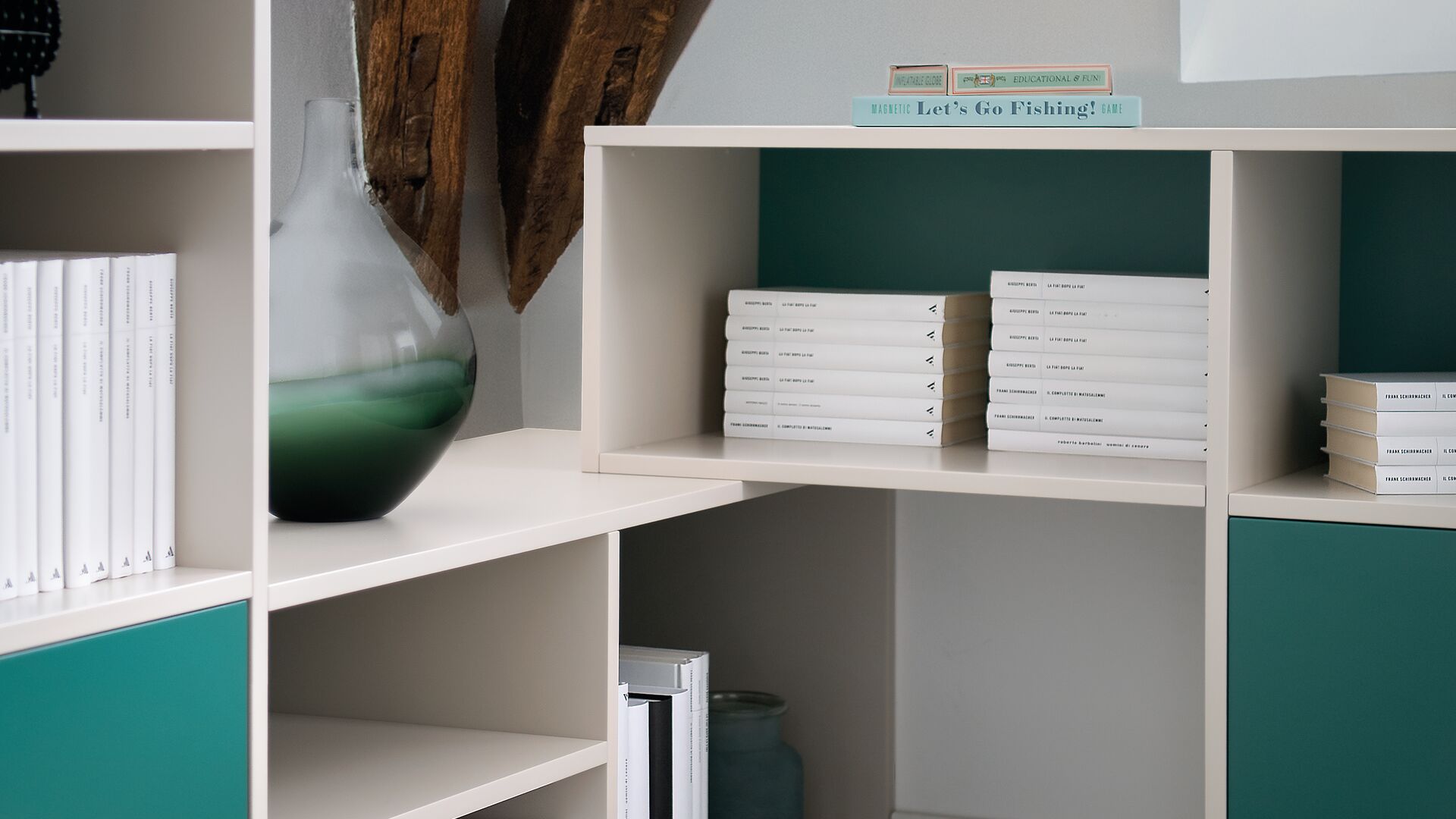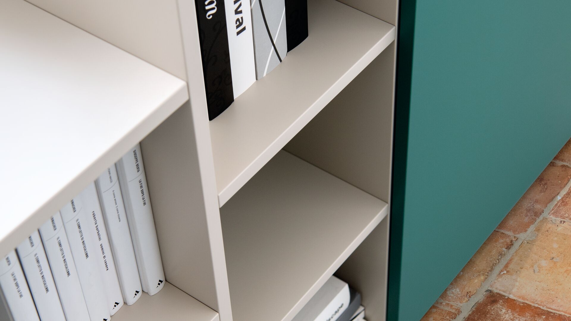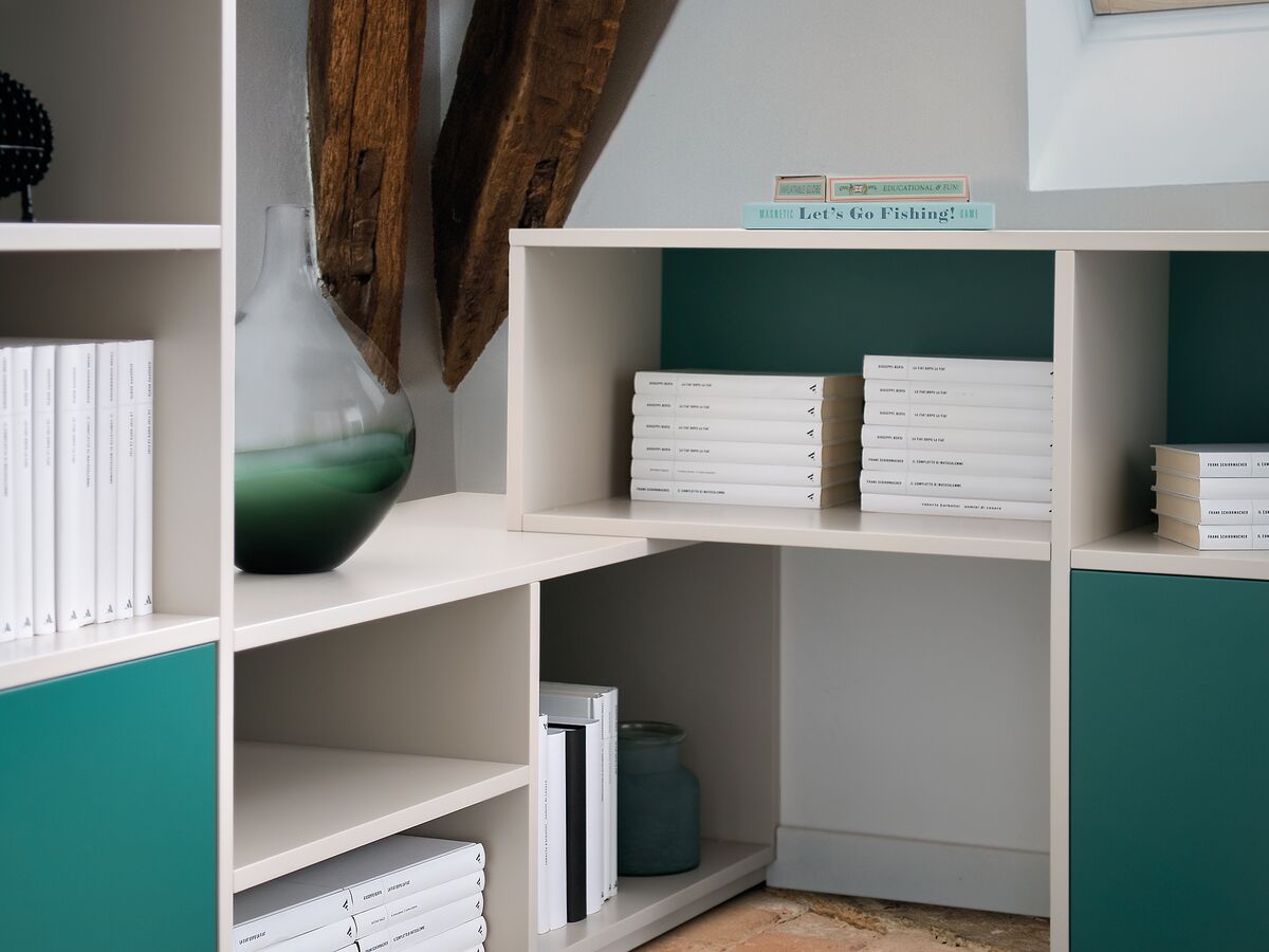 Complexe architectuur vraagt om simpele oplossingen: ofwel maatwerk, ofwel niets. In rustieke zolderkamers is een gepersonaliseerd privévertrek gecreëerd, met een hint van Shamrock-groen en Kashmir Grey. De boekenkast met open nissen en fronten vindt precies zijn plaats in de hoek.